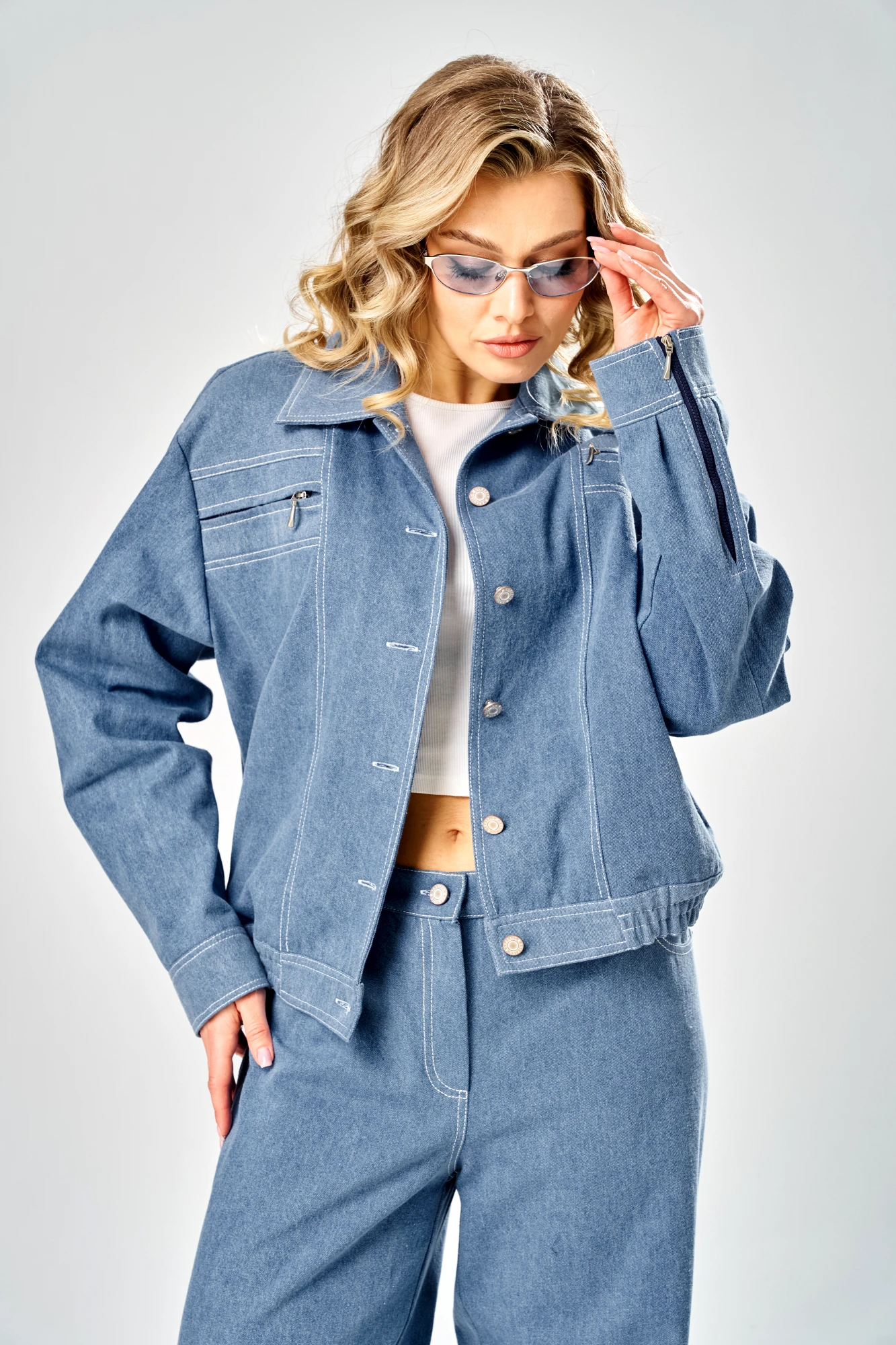 Куртка джинсовая свободного силуэта, со спущенной линией плеча. Куртка с центральной бортовой застежкой на 6 прорезных петель и пуговиц. Воротник отложной без стойки. По низу изделия притачная планка, внутри которой эластичная тесьма. Спинка с кокеткой и рельефами от планки низа до кокетки. Перед с рельефами от плечевого шва до шва притачивания планки низа, с прорезными карманами с листочкой с настроченными концами. По переду в верхней части обработаны имитации кармана с декоративной тесьмой-молнией. Рукава длинные на спущенной пройме, двухшовные, с притачными по низу манжетами. По шву притачивания манжет обработаны складки, в локтевом шве обработана тесьма-молния. По изделию проложены отделочные строчки контрастного цвета. Куртка без подкладки.