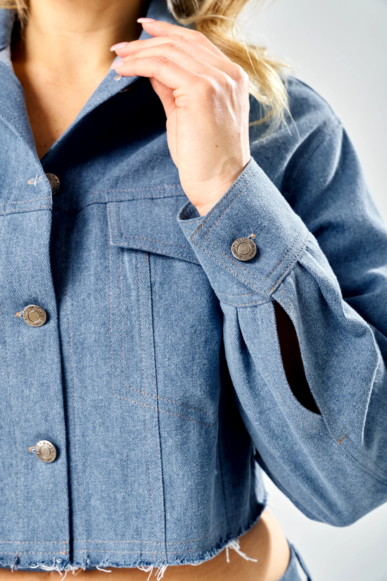 Джинсовая куртка свободного силуэта, с необработанным низом, с центральной застежкой на 4 прорезные петли и пуговицы. Воротник отложной без стойки. Спинка с кокеткой и рельефами от кокетки до низа. На кокетку спинки настрочена нашивка. Перед с карманом и клапаном, застёгивающейся на одну прорезную петлю и пуговицу, с кокеткой и 2 рельефами от кокетки до низа. Рукава на спущенной пройме, длинные, двухшовные, с притачными по низу манжетами, застегивающимися на 1 прорезную петлю и пуговицу. По шву притачивания манжет обработаны складки, в локтевом шве обработан разрез. По изделию проложены отделочные строчки контрастного цвета. Джинсовые брюки О-образного силуэта, низкой посадки.