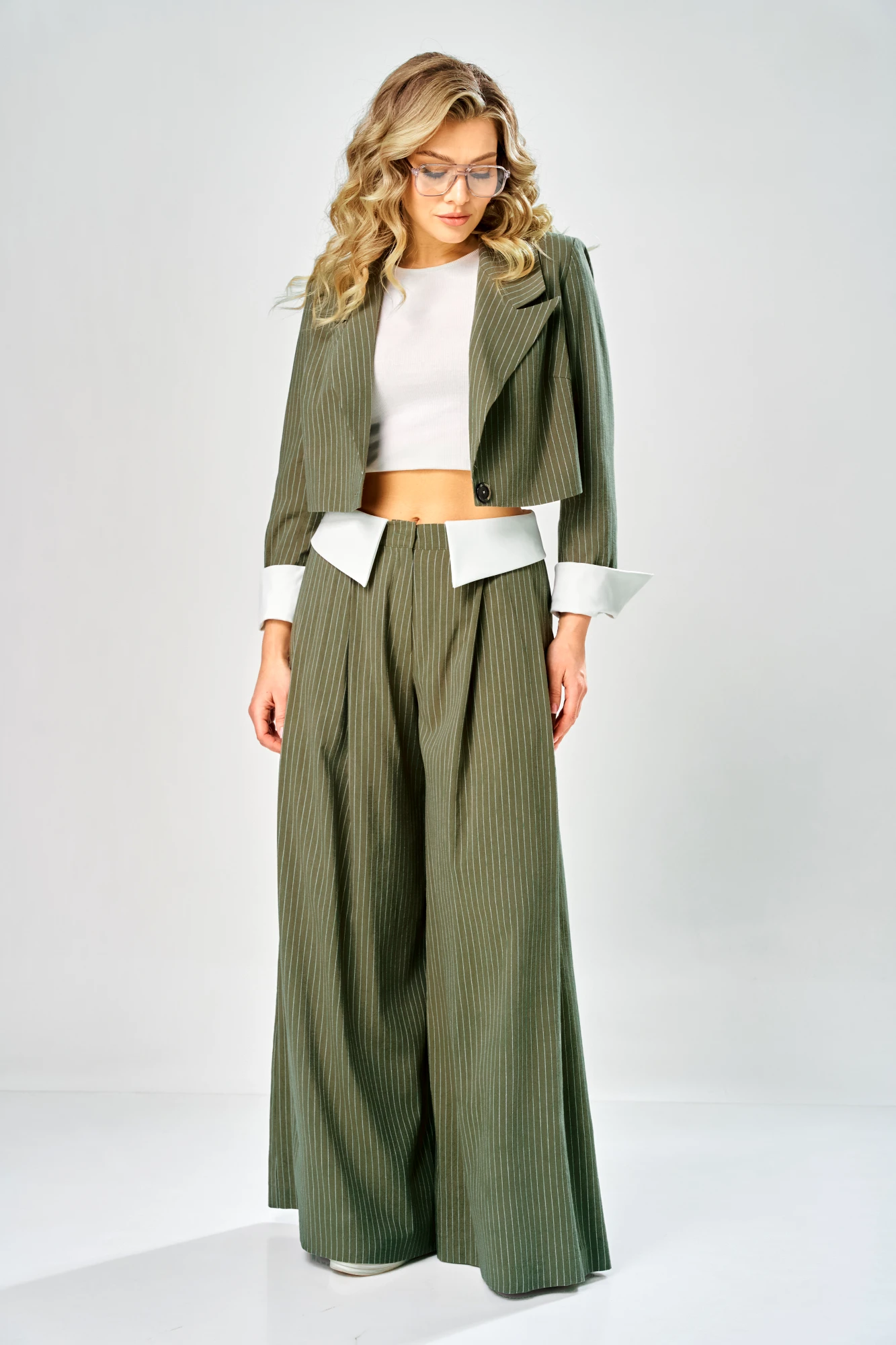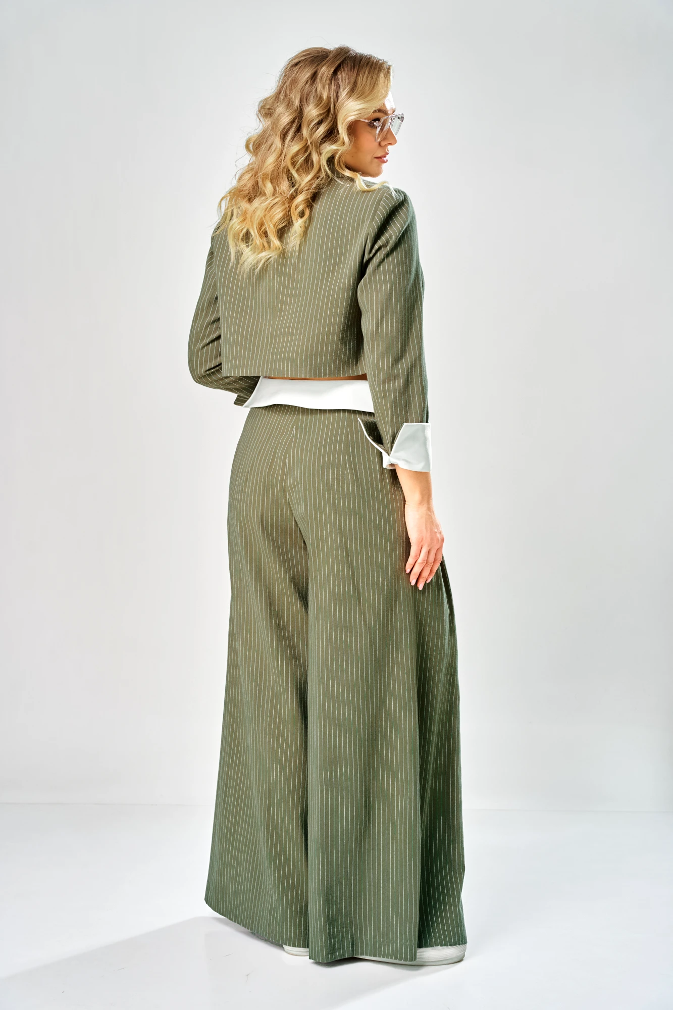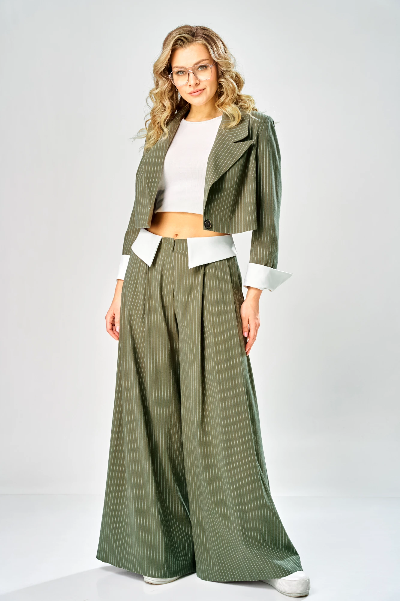 Костюм женский, состоящий из брюк палаццо и укороченного жакета. Костюм выполнен из текстильной ткани.