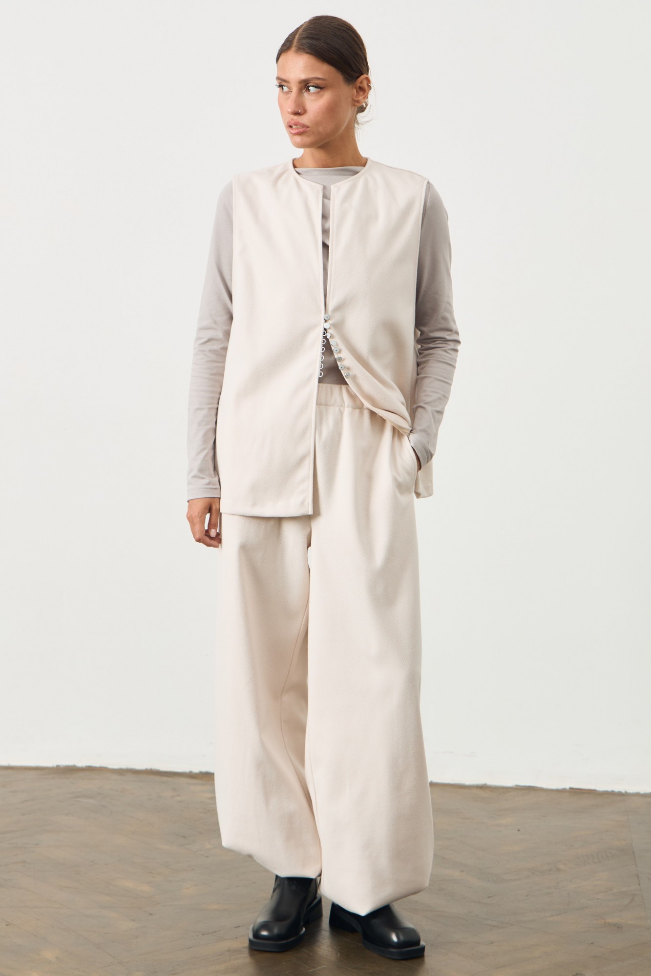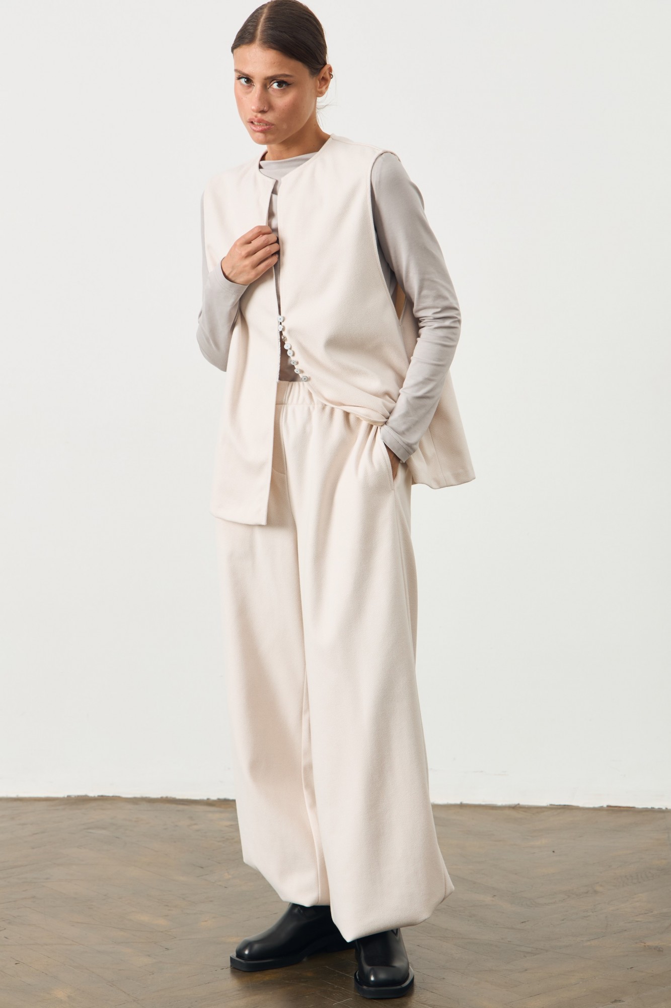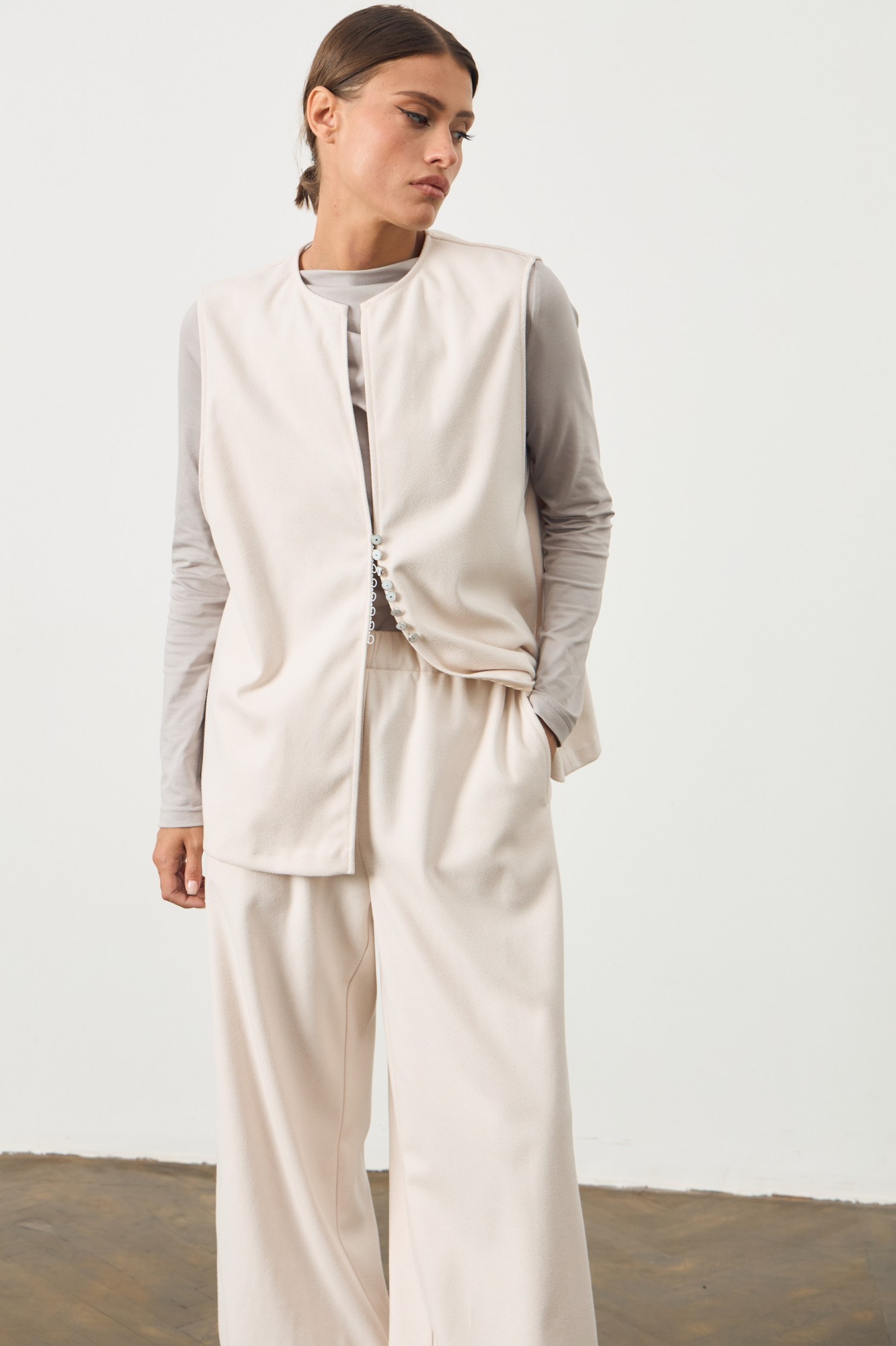 Жилет свободного кроя ниже линии бедра. Застежка на потайной крючок. Брюки трикотажные широкого кроя. Пояс с резинкой. В швах карманы. По низу брюки на резинке. Имеют два варианта носки.