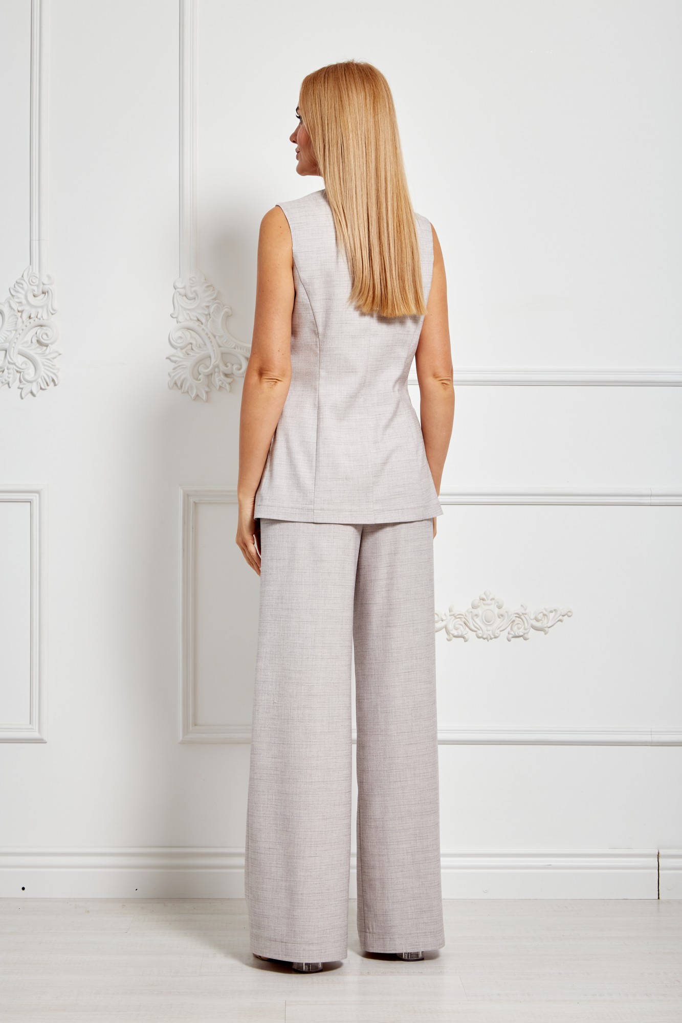 Комплект брючный женский, состоящий из брюк и жилета. Жилет полуприлегающего силуэта, двубортный, с отложным воротником с лацканами, застёжка на пуговицы, по переду и спинке вертикальные рельефы, по переду прорезные карманы-"обманки". Брюки широкие на поясе, застёжка спереди на молнию и пуговицы, с боковыми карманами.