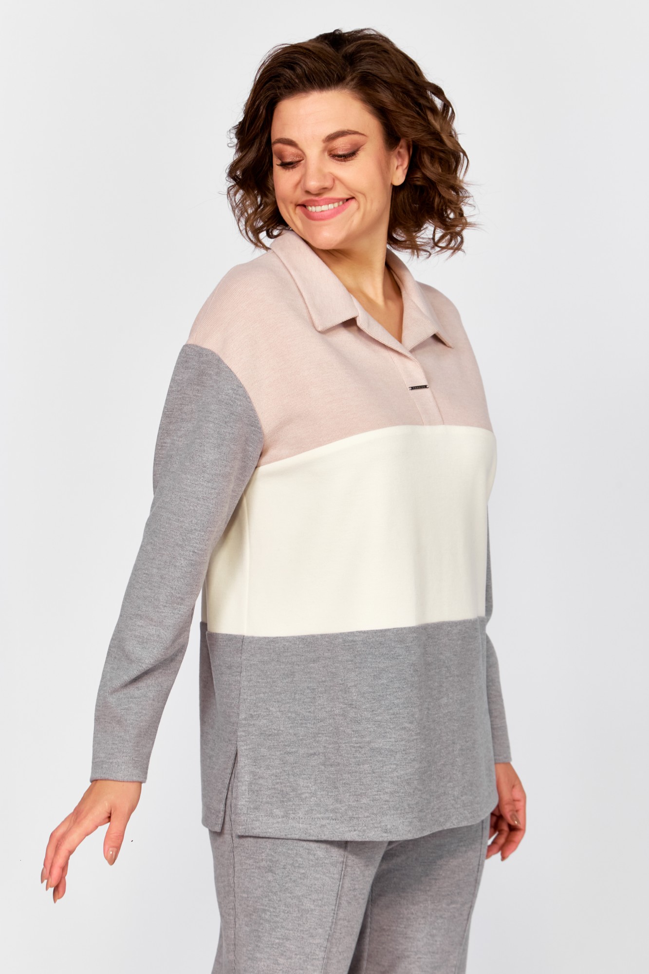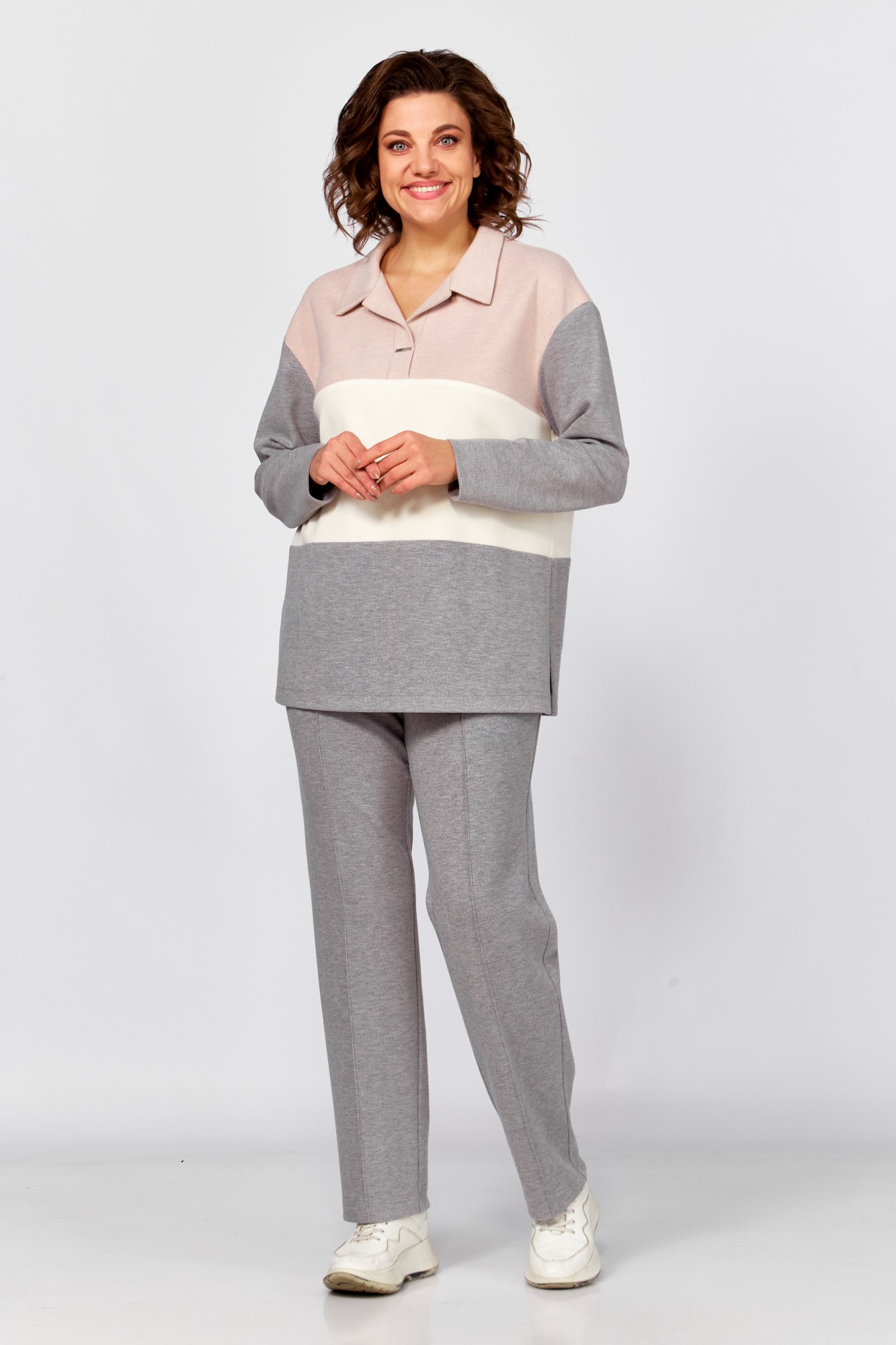 Женский двухпредметный костюм состоит из удлиненного джемпера и брюк, выполнен из трикотажного полотна в мелкий рубчик 3 цветов.
