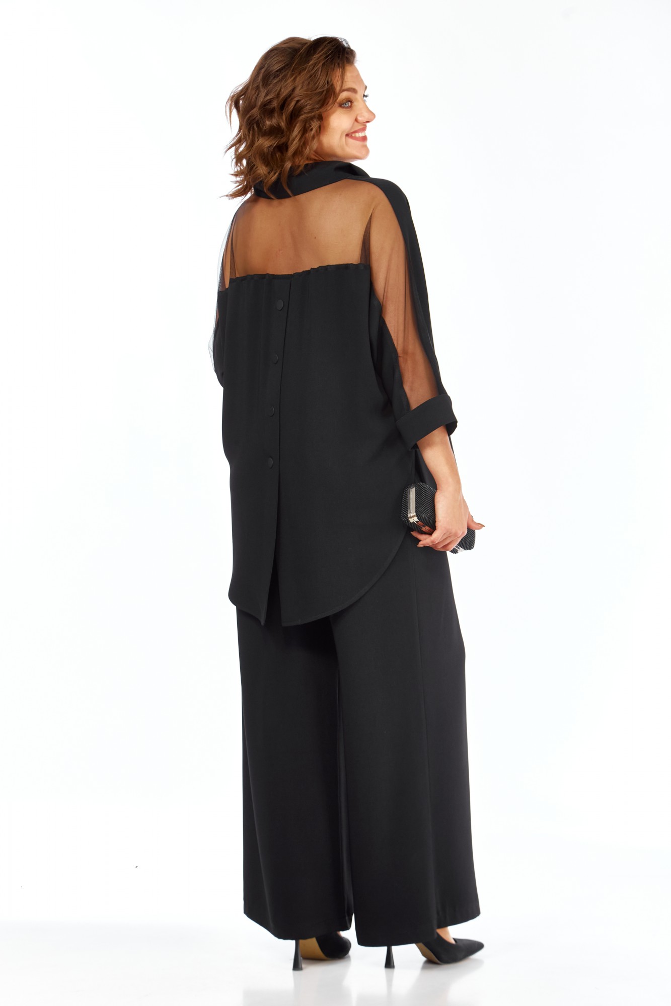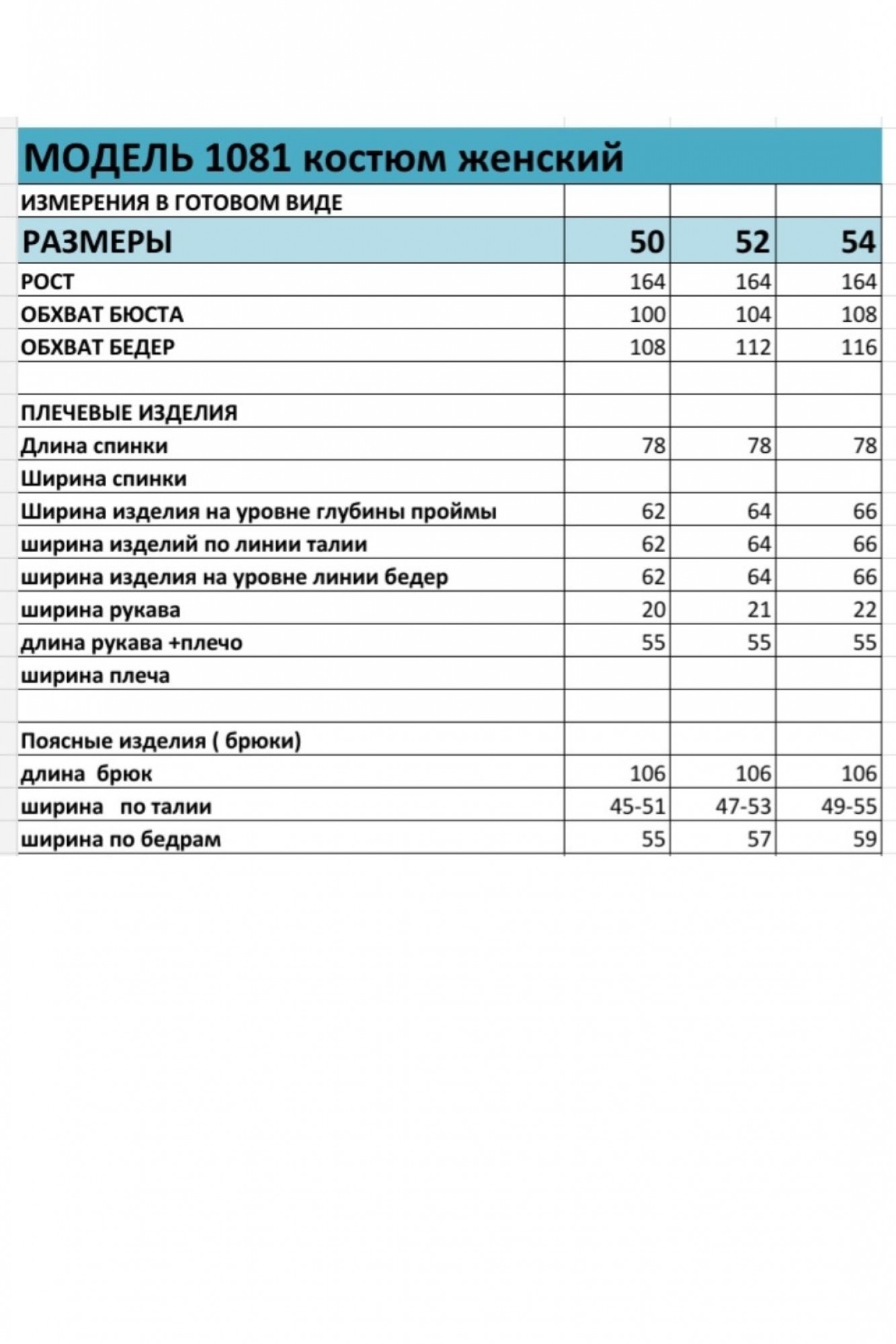 Женский двухпредметный костюм состоит из свободной блузы и широких брюк, выполнен из однотонной плательно-костюмной ткани.