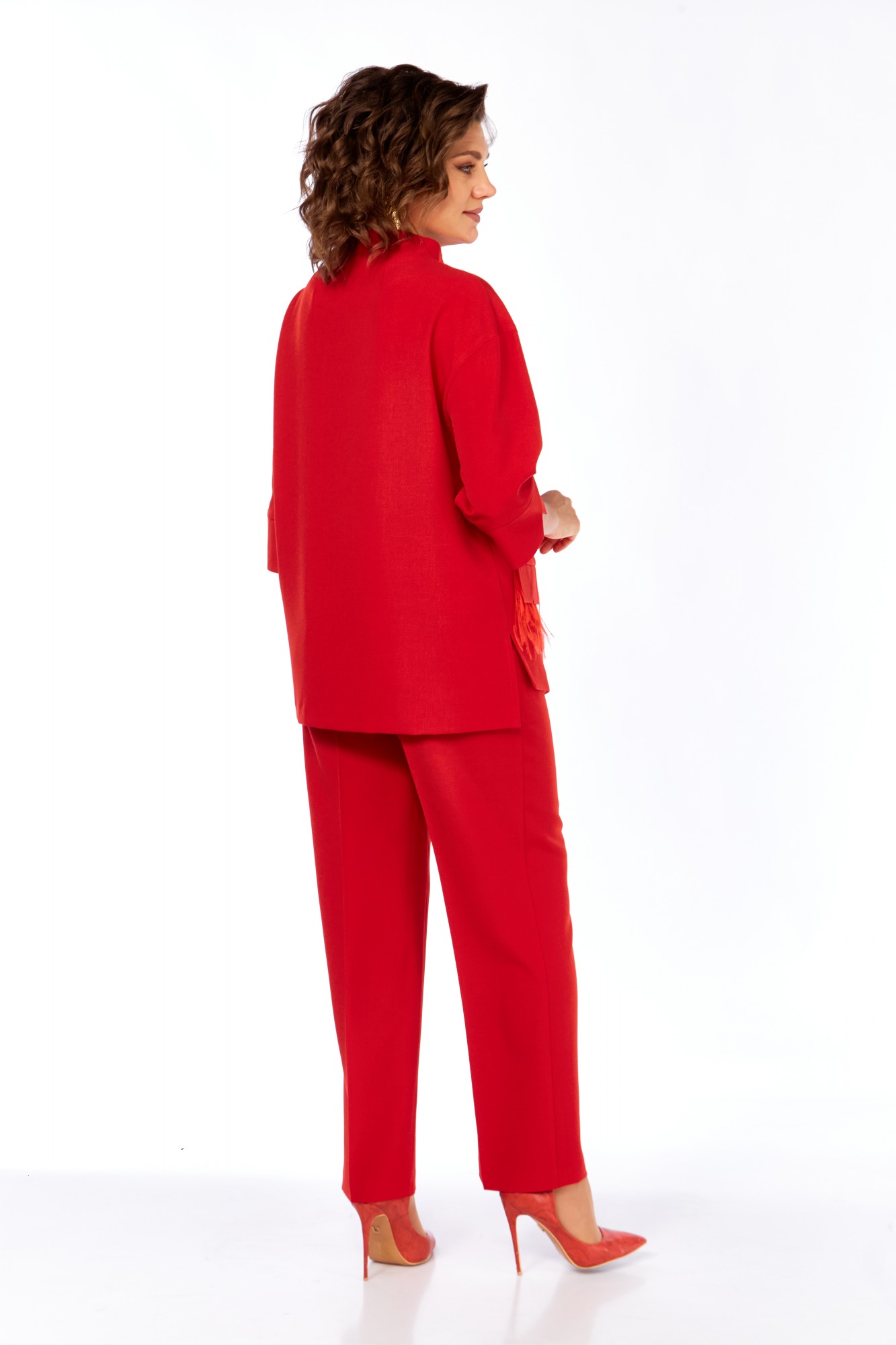 Женский двухпредметный нарядный костюм состоит из асимметричного жакета и брюк, выполненных из однотонной плательно-костюмной ткани.