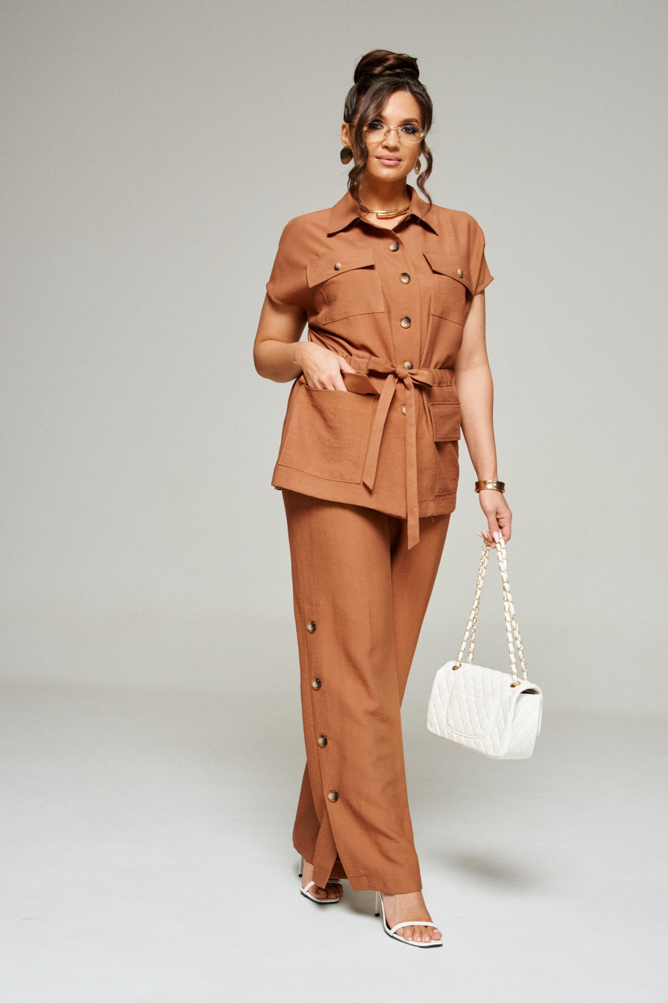 Женский льняной костюм из смесовой ткани с натуральным составом, акцентные накладные карманы и безупречные любимые оттенки. Созданный в расслабленном крое с подчеркнутыми деталями, костюм позволит чувствовать себя комфортно и непринужденно. Стильный костюм состоит из жакета-рубашки и брюк, выполнен из мягкой ткани с волокнами льна и вискозы, практичен в носке. Жакет свободного силуэта, удлиненный с кулисой и пояском-завязкой. Передняя часть из двух половинок, с нагрудными вытачками от бокового шва и накладными верхними и нижними функциональными карманами с клапанами. Спинка разрезная со средним швом. Воротник классический стояче-отложной на отрезной стойке. Линия плеча удлиненная, спущенная, переходящая в цельнокроеный рукав. Застежка центральная на петли и пуговицы. Низ прямой. Брюки длинные, прямые свободные. Посадка классическая. В боковых швах ниже уровня колена выполнены шлицы с закреплением на декоративные пуговицы. Пояс притачной, шириной 4см с эластичной тесьмой по кругу.