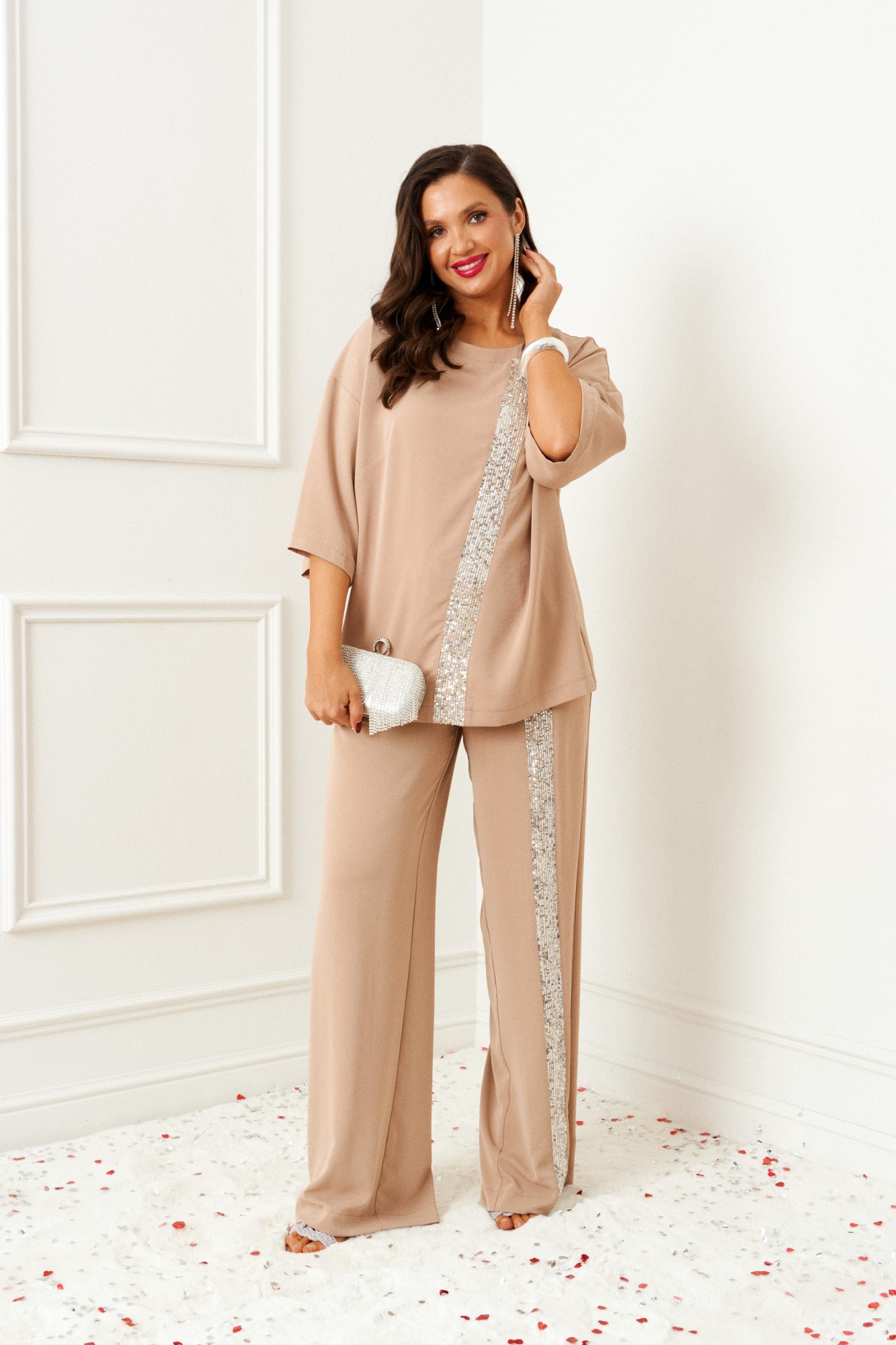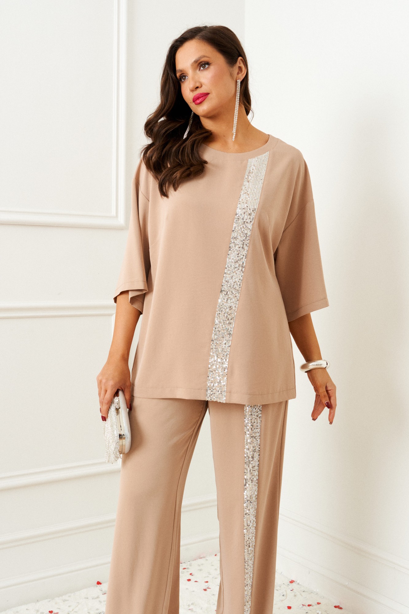 Готовимся к главной ночи года! Брючный костюм из мягкого крепа идеально подходит для торжественных выходов и не только! Оба предмета костюма можно смело комбинировать по отдельности с другими вещами Вашего гардероба. Изысканный костюм состоит из 2-ух предметов: блузки и брюк. Выполнен из костюмно-смесового полотна. У этой ткани нежная, гладко-бархатистая фактура, приятная на ощупь и матовая поверхность. Она легко драпируется и очень выгодно и дорого подчёркивает образ. Блузка свободного силуэта, с удлиненной линией плеча, длиной до середины бедра. Передняя часть с двумя нагрудными вытачками и с фигурной отделочной вставкой из ткани с пайетками по центру. Спинка цельная. Рукав одношовный, средней ширины, длиной ниже локтя. Горловина овальной формы на подрезной обтачке. Брюки свободного, прямого силуэта. Высота сиденья классическая. На левой брючине спереди выполнена прямолинейная вставка из отделочной ткани. Брюки на поясе, в который вставлена эластичная тесьма по всей окружности.