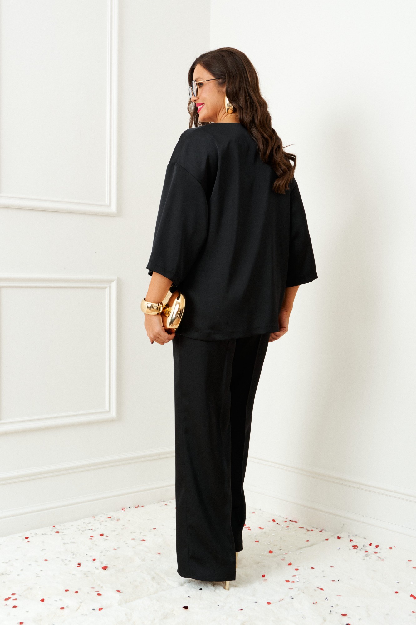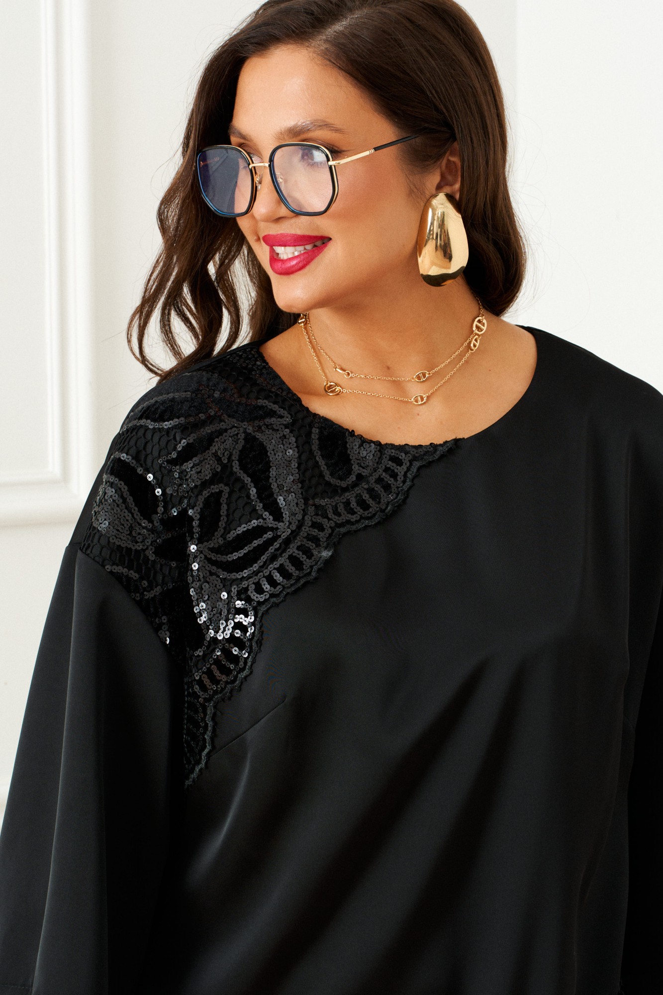 Готовимся к главной ночи года! Брючный костюм из дорогого атласа идеально подходит для торжественных выходов и не только! Предметы костюма можно смело комбинировать по отдельности с другими вещами Вашего гардероба и наслаждаться неповторимостью образа! Изысканный костюм состоит из 2-ух предметов: блузки и брюк. Выполнен из атласного полотна в сочетании с кружевом. Основная ткань нежная, гладкой фактуры, приятная на ощупь и с блестящей поверхностью, она легко драпируется и очень выгодно и дорого подчёркивает образ; отделочная ткань придает праздничный шарм. Блузка свободного силуэта, с удлиненной линией плеча, длиной до середины бедра. Передняя часть цельнокроеная с нагрудными вытачками от бокового шва. Сверху и снизу переда асимметрично расположено отделочное кружевное полотно с фестонным краем. Спинка цельная. Рукав рубашечный средней ширины, длиной ниже локтя. Горловина овальной формы. Брюки прямого силуэта классической посадки, длинные, с двумя верхними боковыми карманами. Высота сиденья стандартная. Застежка центральная на молнию и на петлю с пуговицей на поясе. В задней части пояса для удобного прилегания по талии вставлена резинка.