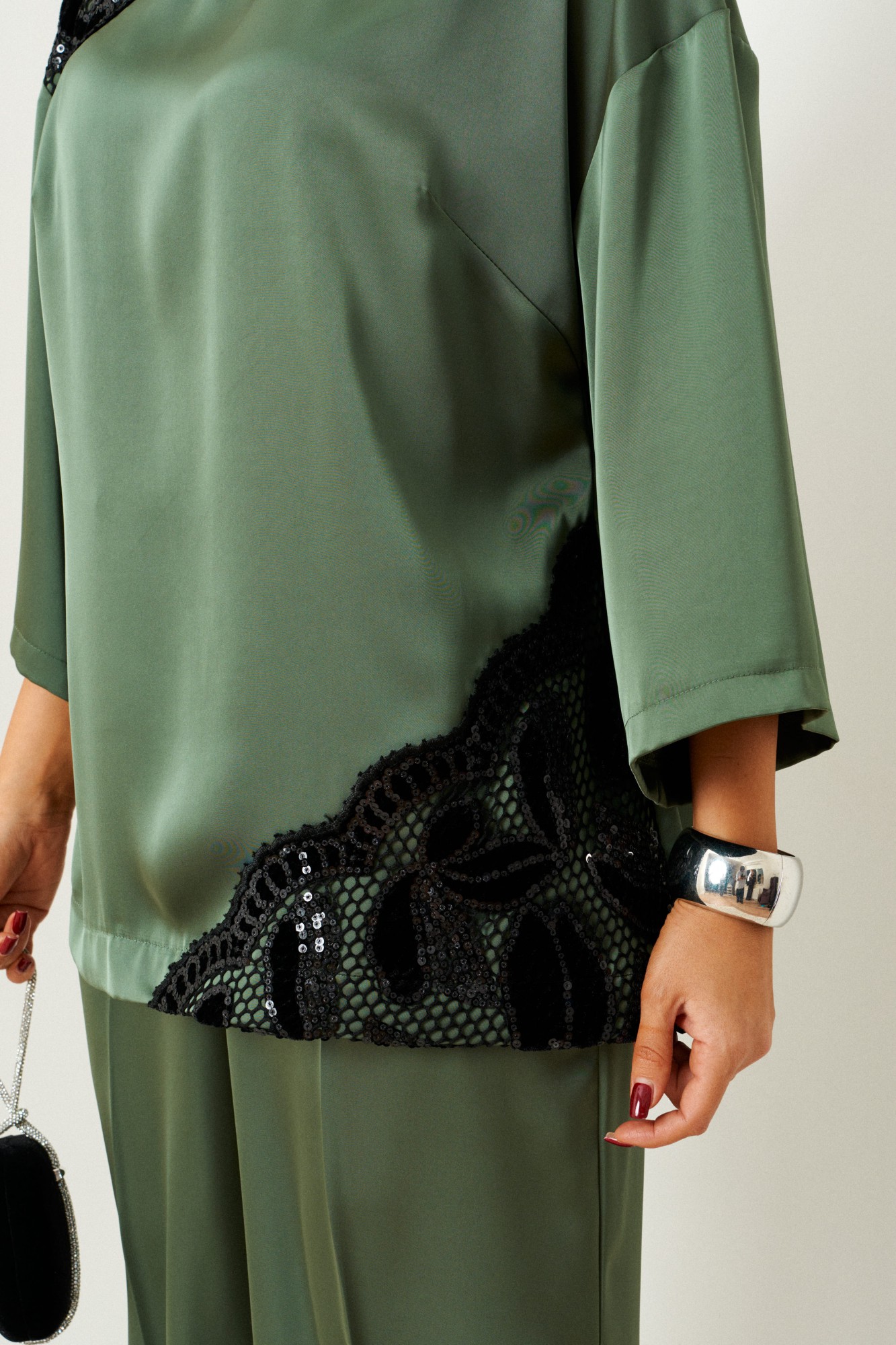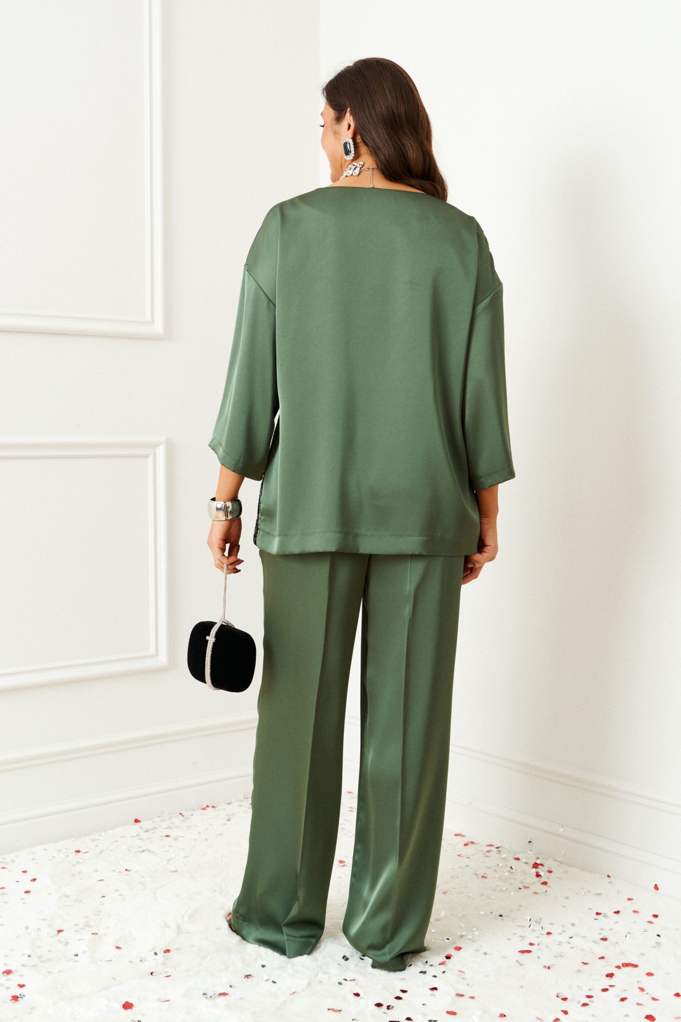 Готовимся к главной ночи года! Брючный костюм из дорогого атласа идеально подходит для торжественных выходов и не только! Предметы костюма можно смело комбинировать по отдельности с другими вещами Вашего гардероба и наслаждаться неповторимостью образа! Изысканный костюм состоит из 2-ух предметов: блузки и брюк. Выполнен из атласного полотна в сочетании с кружевом. Основная ткань нежная, гладкой фактуры, приятная на ощупь и с блестящей поверхностью, она легко драпируется и очень выгодно и дорого подчёркивает образ; отделочная ткань придает праздничный шарм. Блузка свободного силуэта, с удлиненной линией плеча, длиной до середины бедра. Передняя часть цельнокроеная с нагрудными вытачками от бокового шва. Сверху и снизу переда асимметрично расположено отделочное кружевное полотно с фестонным краем. Спинка цельная. Рукав рубашечный средней ширины, длиной ниже локтя. Горловина овальной формы. Брюки прямого силуэта классической посадки, длинные, с двумя верхними боковыми карманами. Высота сиденья стандартная. Застежка центральная на молнию и на петлю с пуговицей на поясе. В задней части пояса для удобного прилегания по талии вставлена резинка.