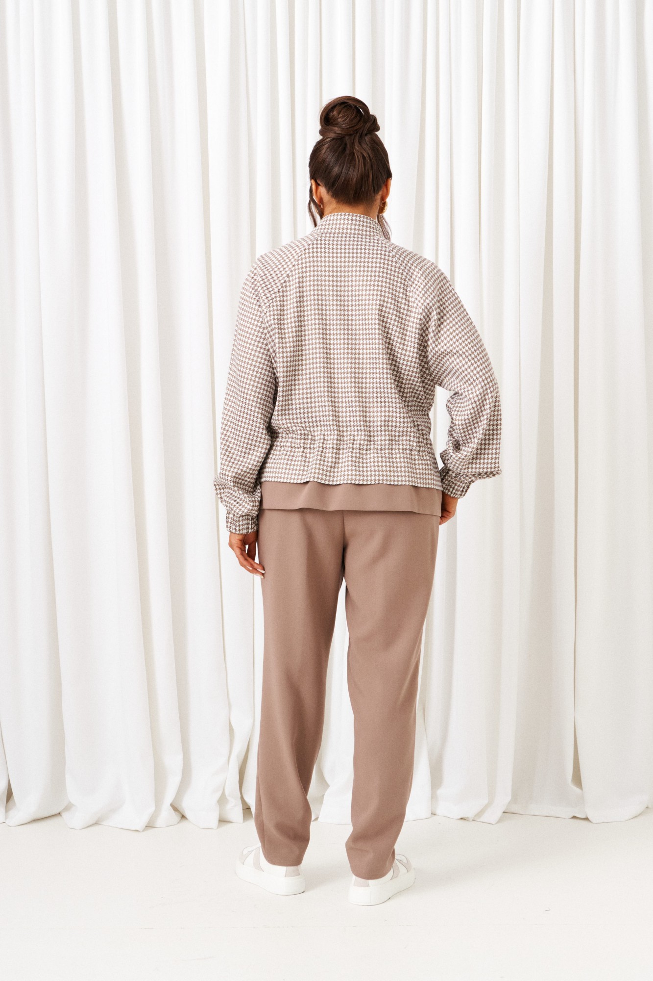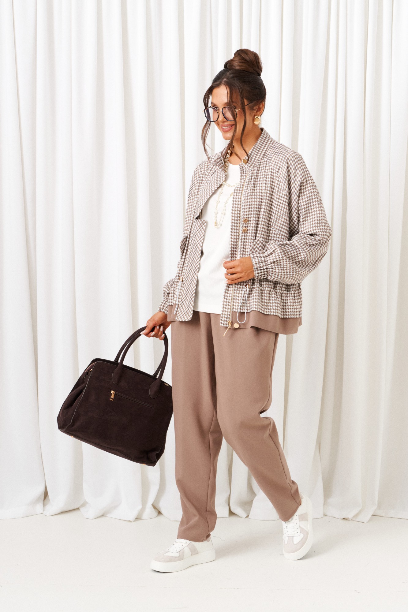 Жакет типа «бомбер» покроя «реглан», свободного силуэта с кулисой и шнуром-резинкой по талии.