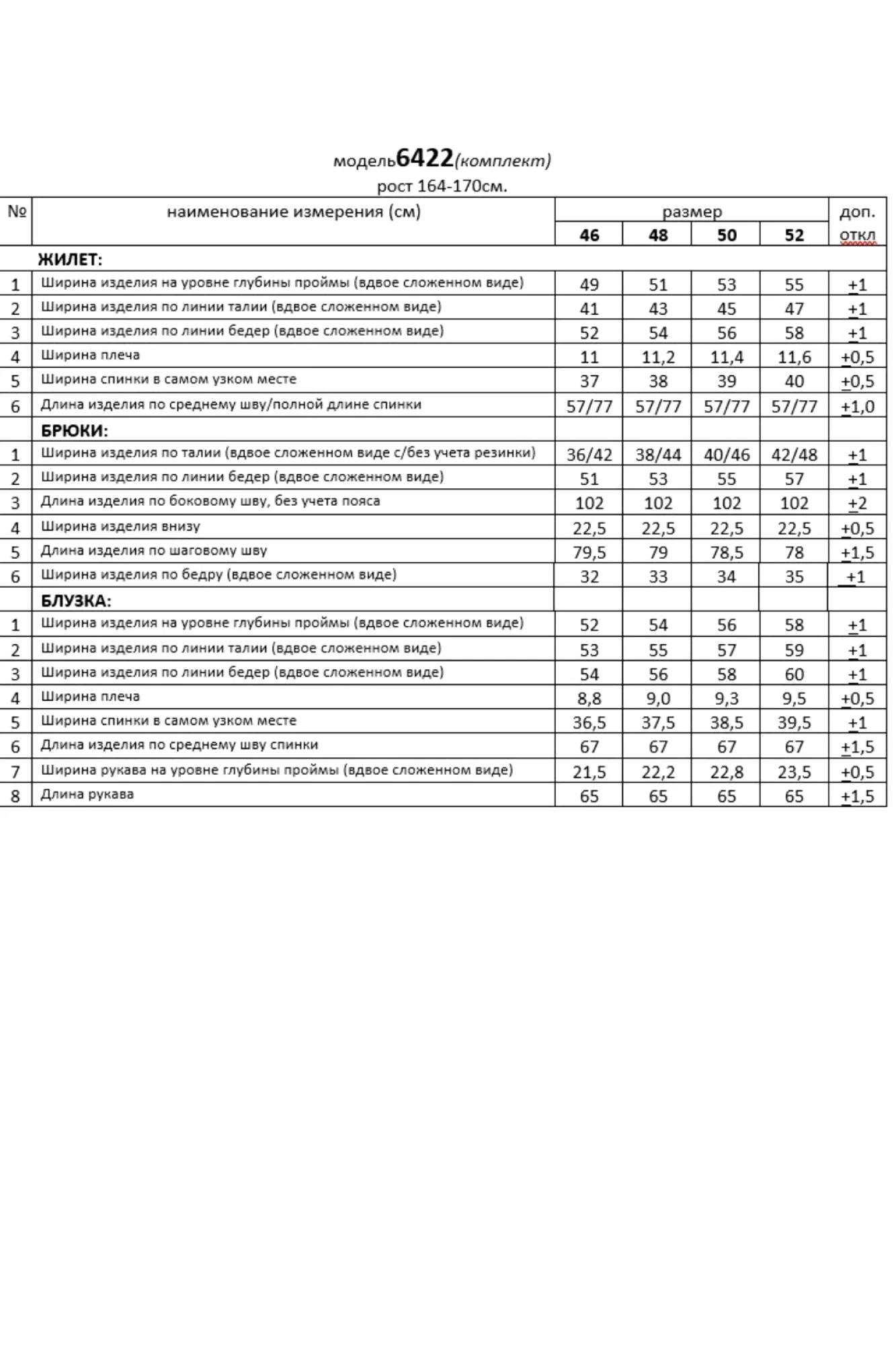 Длина рукава (блузка) – 65 см.