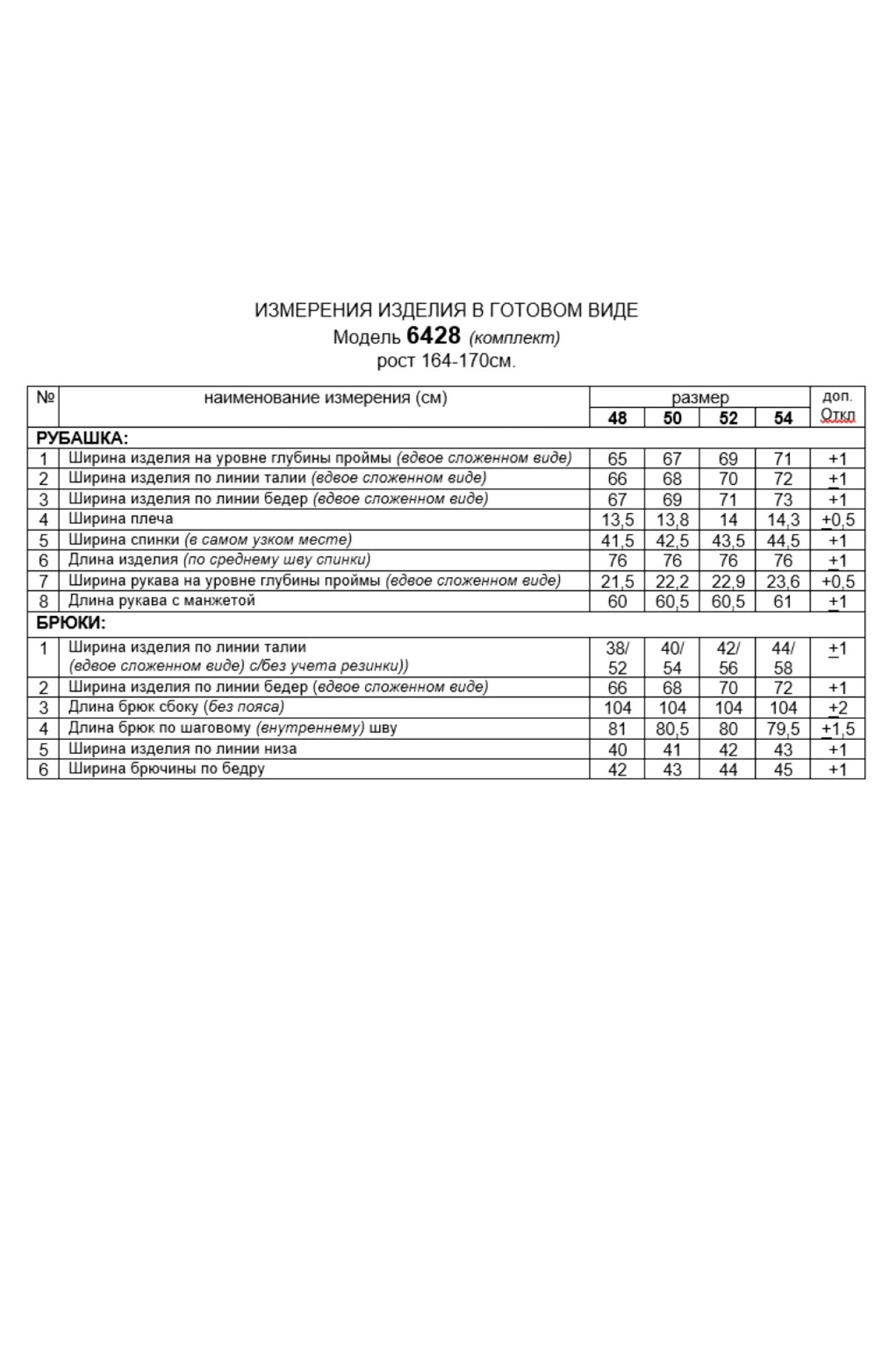 Таблица размеров