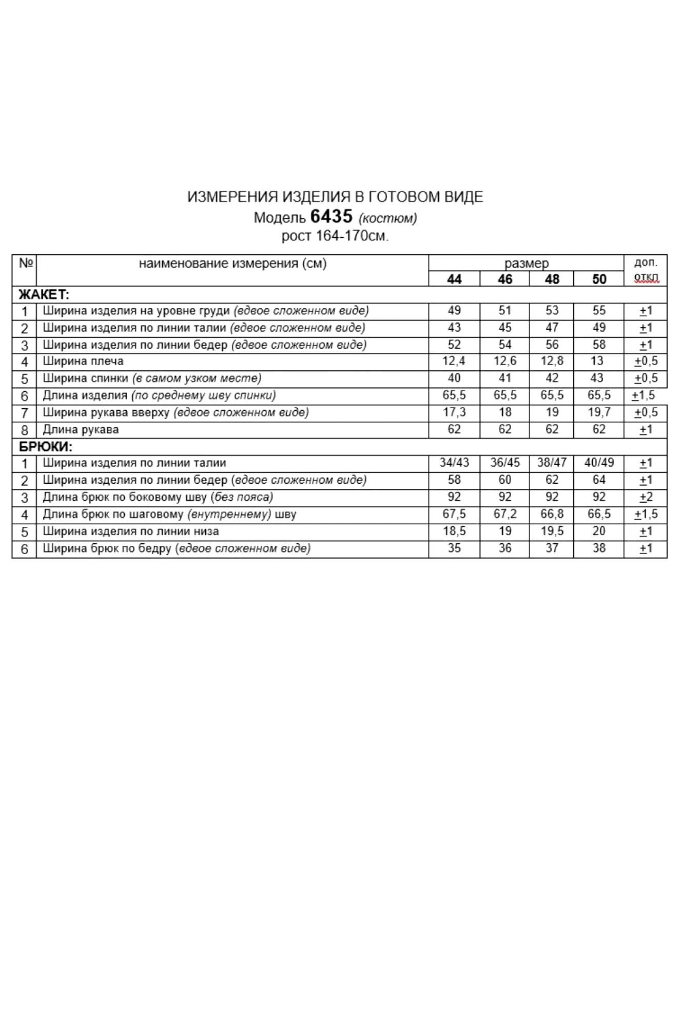 Таблица размеров