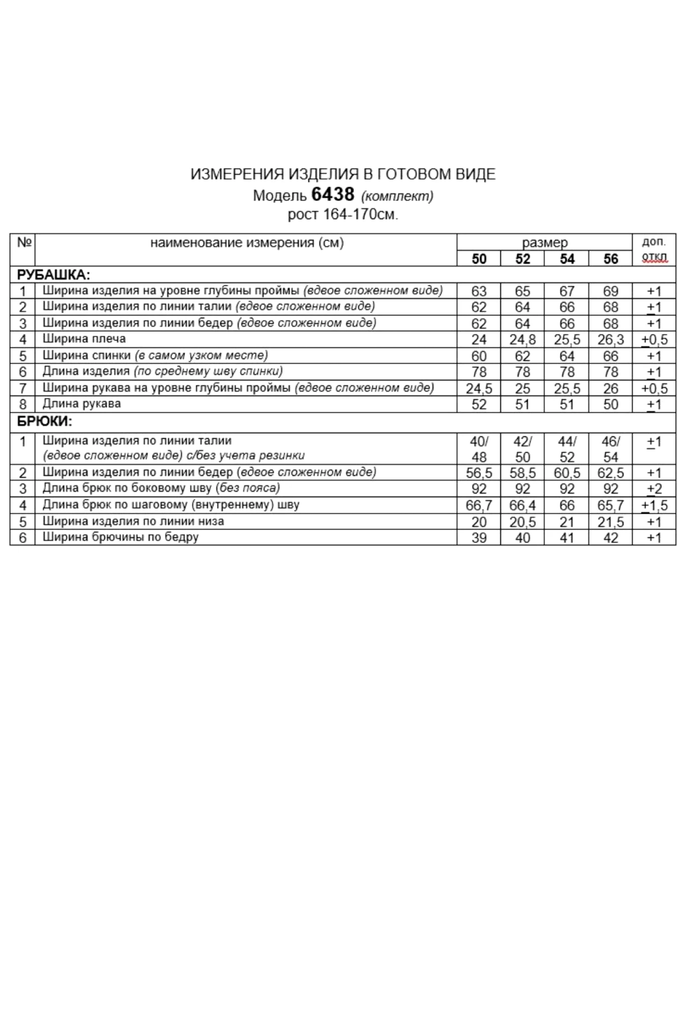 Таблица размеров