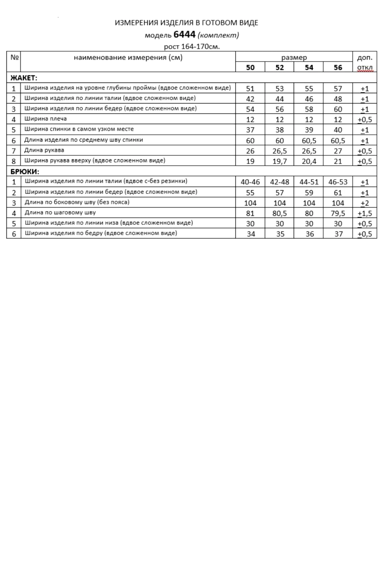 Таблица измерений