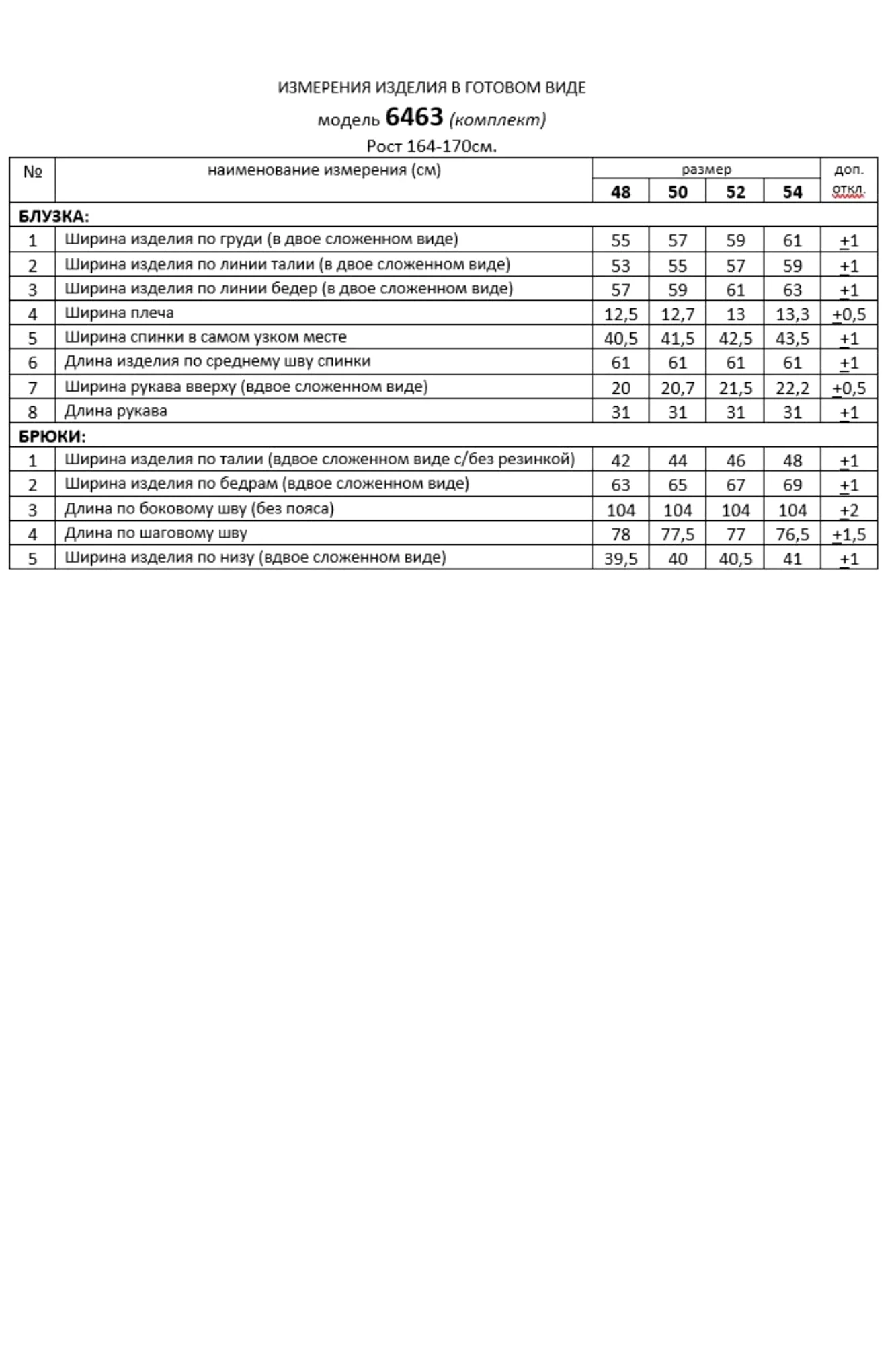 Таблица измерений