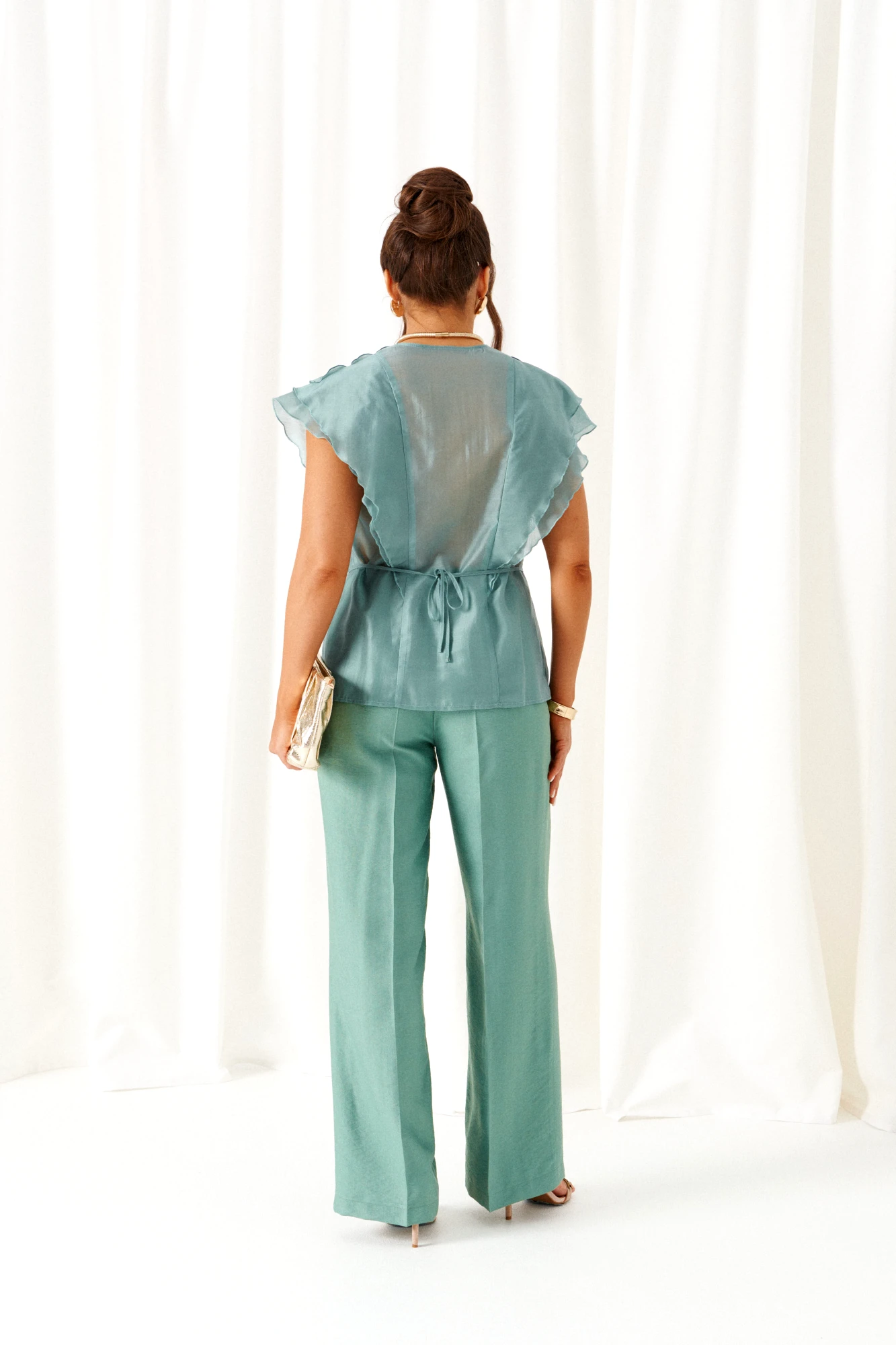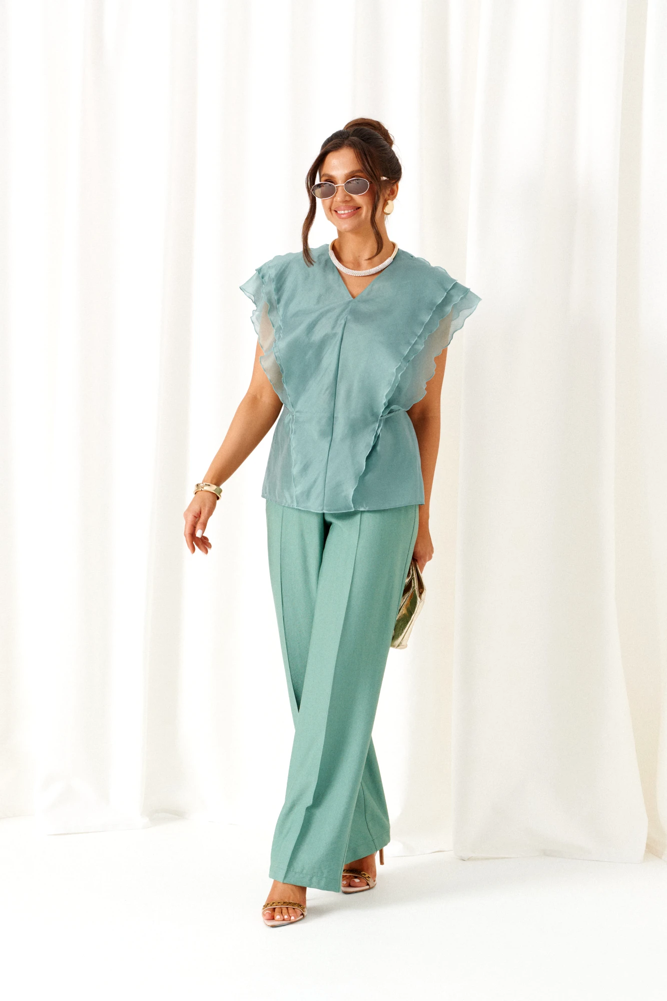 Блузка – вискоза 87%, нейлон 13%. Брюки - лен 80%, вискоза 20%