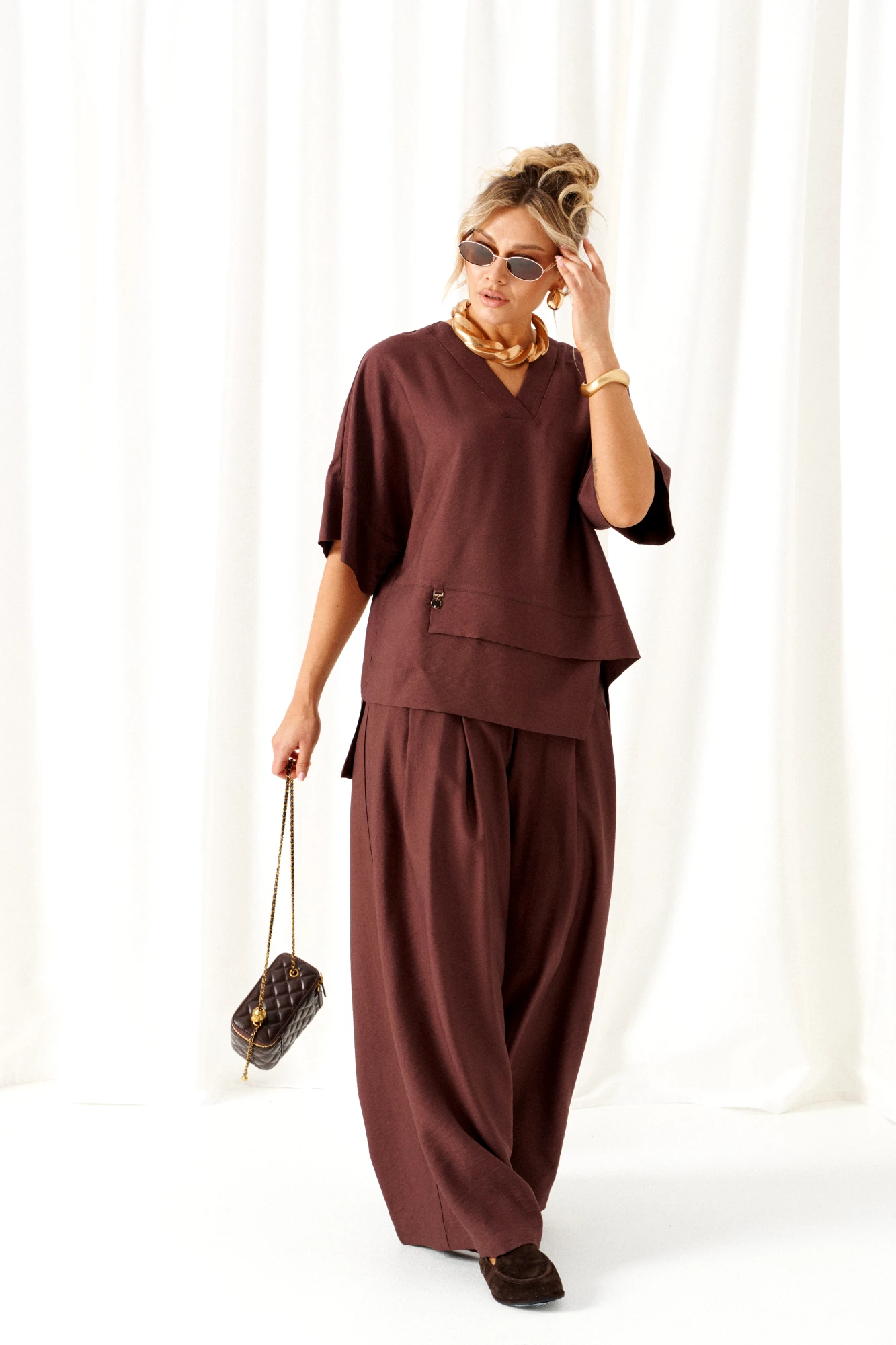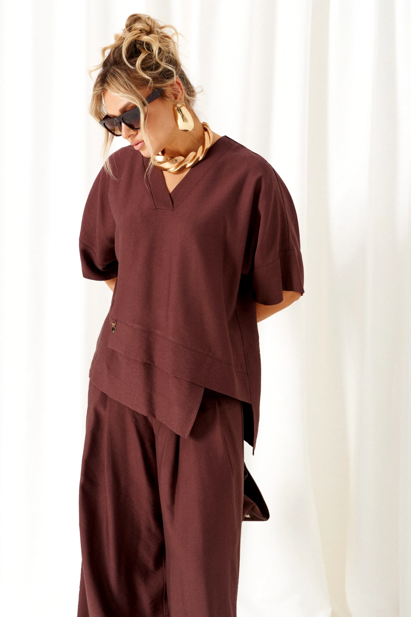 Стильный костюм состоит из блузона и брюк, выполнен из мягкой ткани с волокнами льна и вискозы, практичен в носке.