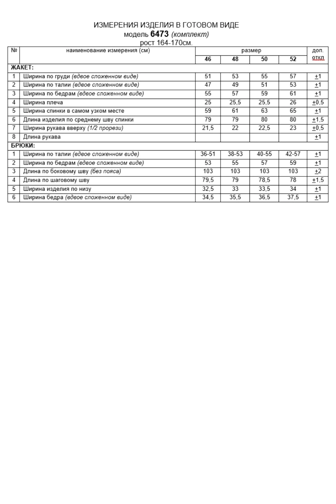 Таблица измерений
