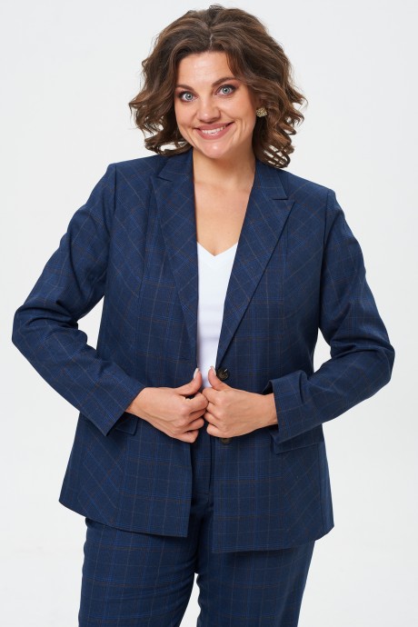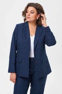 Комплект женский-двойка, из текстильной ткани, жакет удлиненный, полуприлегающего силуэта с центральной бортовой застежкой на пуговицы до линии перегиба лацкана. Спереди рельефные швы от плечевого шва, отрезной бочок и карман с клапаном. Спинка с рельефами от плечевого шва. Рукав втачной, двухшовный. Воротник пиджачного типа. Жакет на подкладке, длина по спинке 67 см, длина рукава 62 см. Брюки прямые, классические, с заутюженными стрелками, по переду обработаны карманы с отрезным бочком, застежка на тесьму-молнию и 1 пуговицу. На задних половинках обработаны вытачки и имитация карманов с листочкой, пояс в брюках притачной, сбоку на резинке. Длина брюк от талии по боковому шву 103 см.