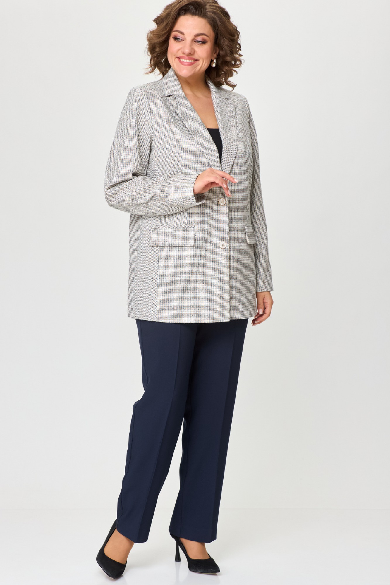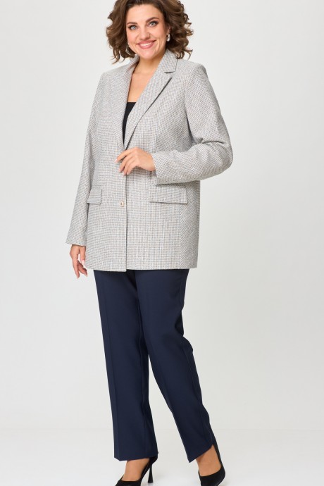 Комплект женский-двойка, жакет удлиненный, из рогожки, полуприлегающего силуэта с центральной бортовой застежкой на пуговицы до линии перегиба лацкана. По переду имеется отрезной бочок и вертикальные вытачки. С прорезными карманами с клапаном и двумя обтачками. Спинка цельная. Воротник пиджачного типа. Рукав двухшовный, втачной. Жакет на подкладке. Длина рукава 63 см, длина по спинке 75 см. Брюки прямые, классические, из текстильной ткани, с заутюженными стрелками, по переду обработаны карманы с отрезным бочком, застежка на тесьму-молнию и 1 пуговицу. На задних половинках обработаны вытачки и имитация карманов с листочкой, пояс в брюках притачной. Длина брюк от талии по боковому шву 103 см.