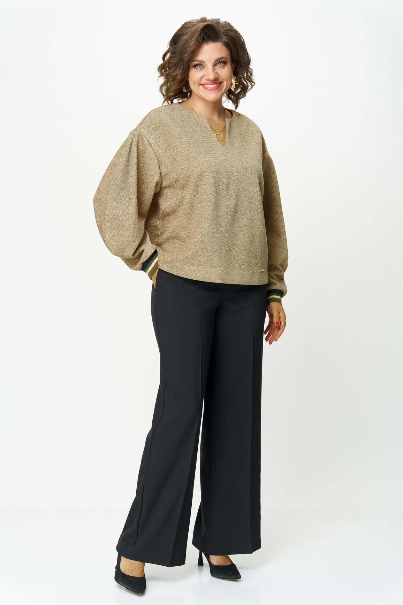 Комплект женский-двойка, блуза, свободного силуэта, из трикотажной ткани, вырез горловины V-образный, рукав немного спущенный, фигурный, спинка цельная. Длина по спинке 59 см Брюки-палаццо, средней ширины, из плотной текстильной ткани, выполнены с карманами с отрезным бочком в боковом шве. Пояс притачной, застёжка на молнию. По задним половинкам обработаны вытачки.