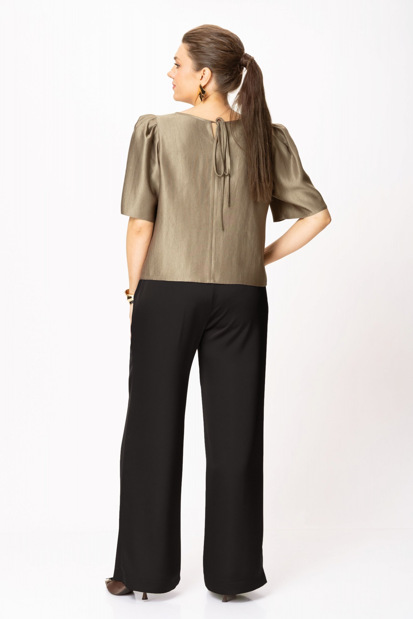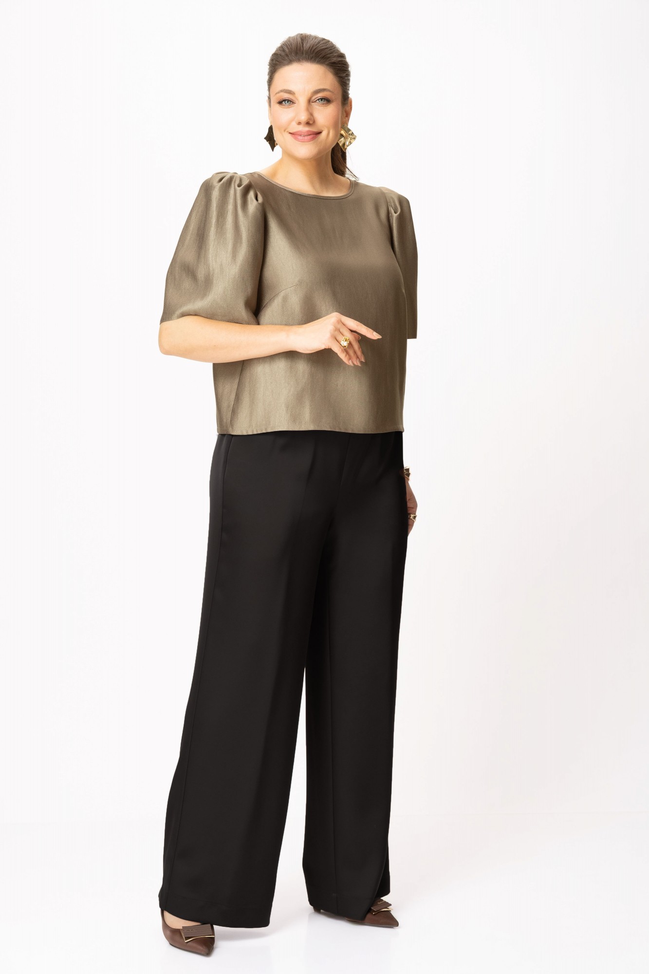 Элегантный женский комплект: состоит из блузки и брюк. Блузка свободного силуэта из плательной ткани с блеском. Горловина круглая, по спинке в центральном шве разрез возле горловины с завязками. Рукава втачные с объемными складками по откату. Брюки свободного силуэта, прямые к низу, выполнены из атласной ткани, брюки без застежки, верх брюк на поясе с резинкой.