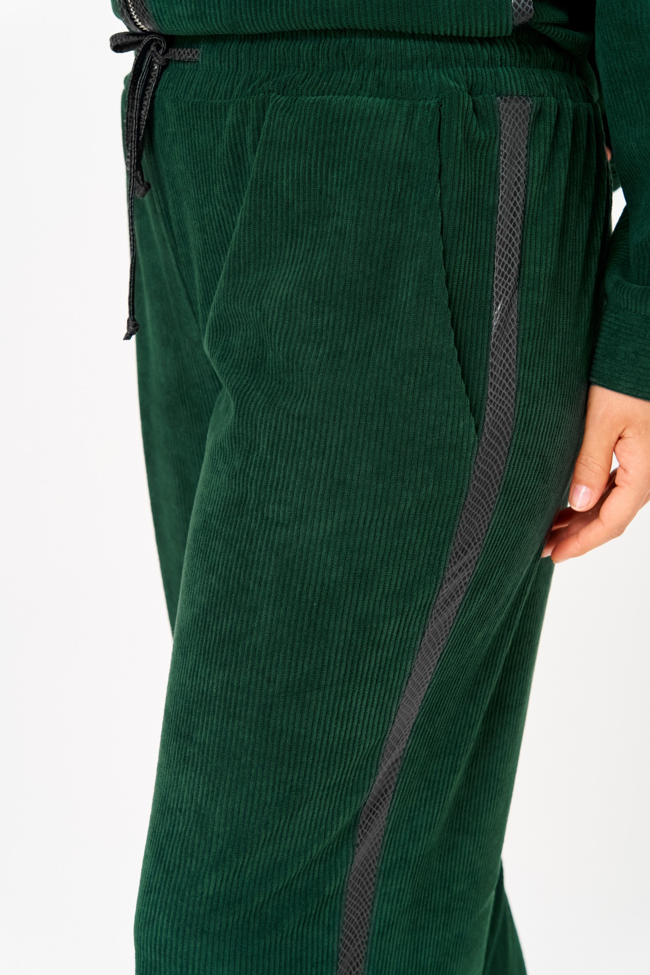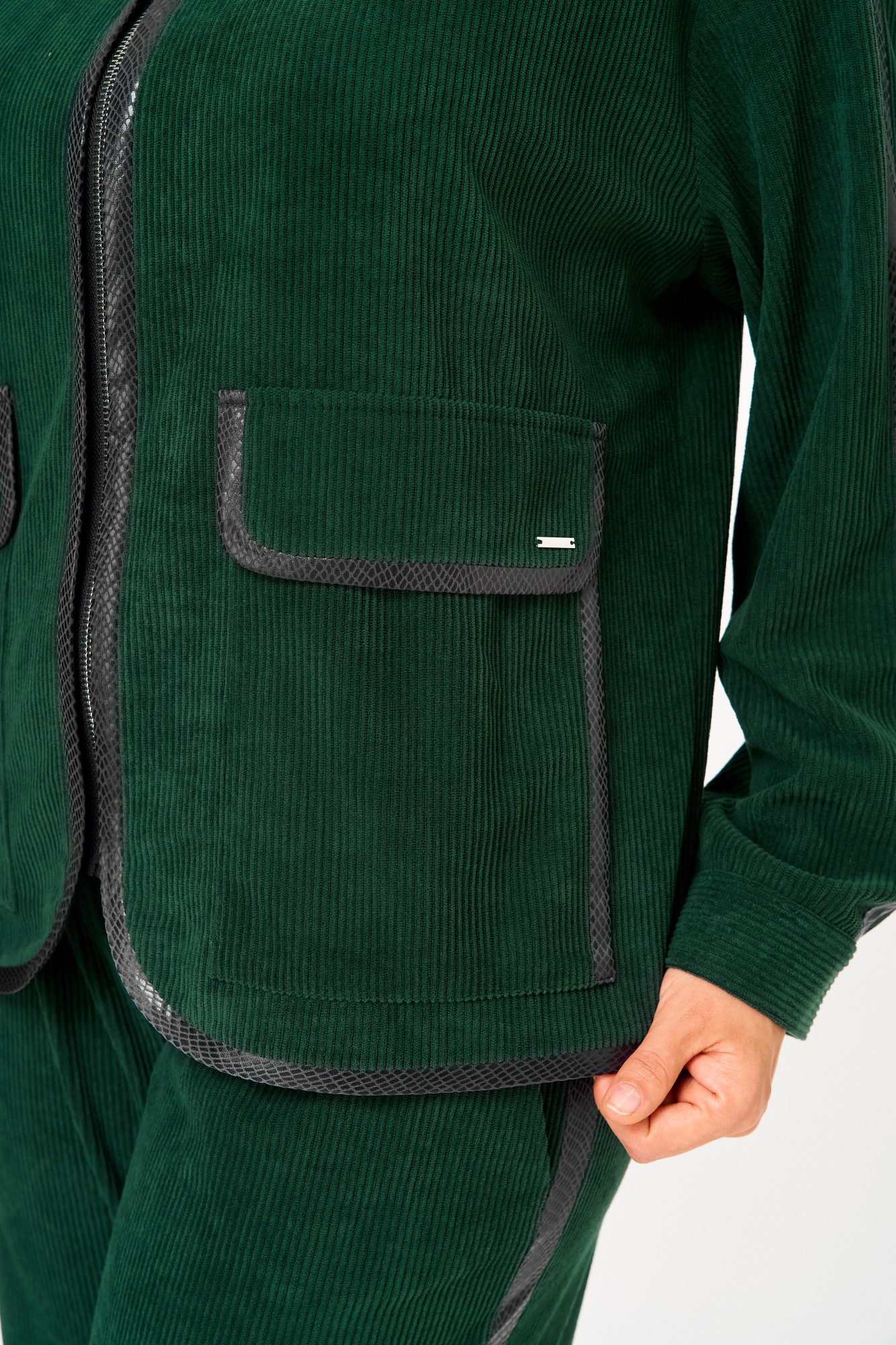 Стильный женский костюм, выполнен из штруксовой ткани, состоит из бомбера и брюк. Бомбер свободного силуэта, с застежкой на декоративную молнию, по переду накладные карманы с клапаном, горловина оформлена стойкой, линия плеча спущена, рукава втачные с лампасом, по низу рукава, манжет с застежкой на декоративную кнопку. Край борта, низ изделия, клапаны и кармана с бейкой из отделочной ткани. Бомбер без подкладки. Брюки свободного силуэта, с лампасом, в боковых швах карманы, верх брюк на поясе с резинкой.