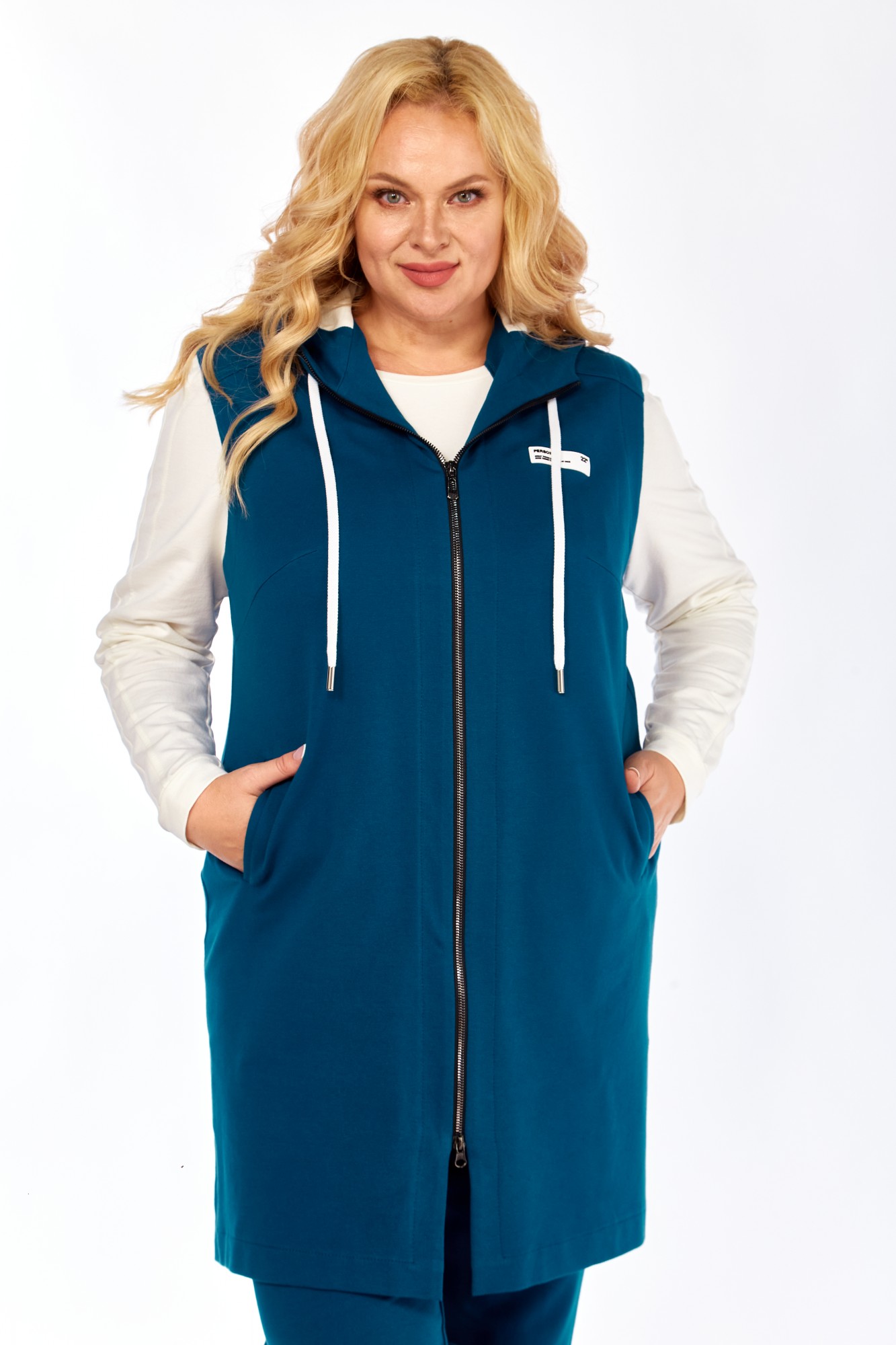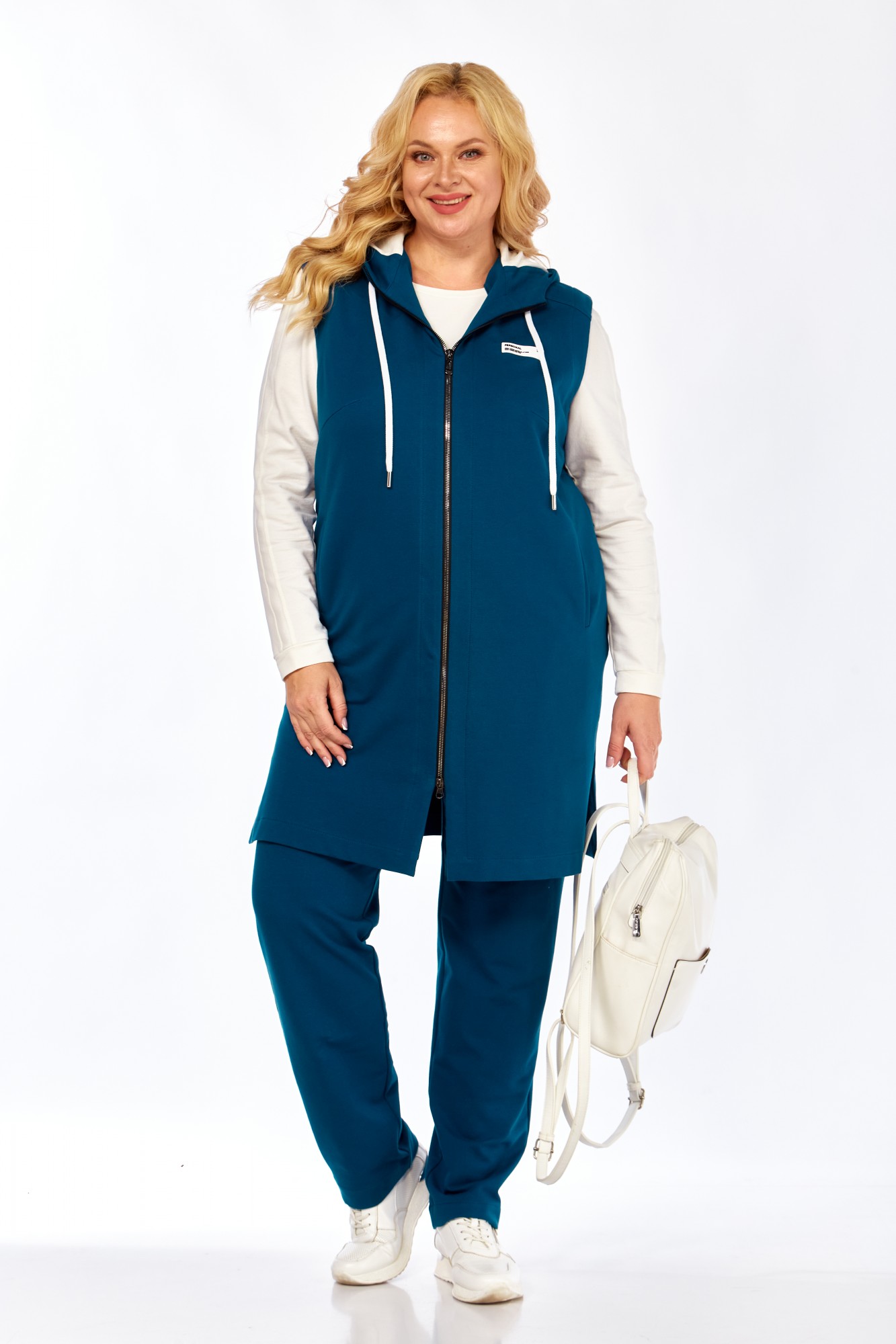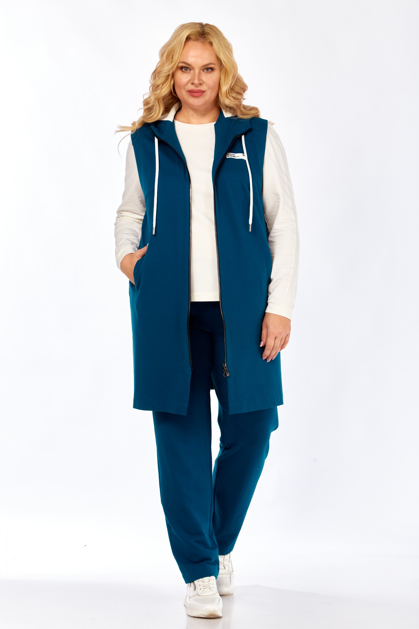 Стильный женский комплект состоит из жилета, брюк и блузы. Жилет свободного силуэта, центральной застежкой на тесьму молния. По переду на уровне бедер прорезные карманы с листочкой, горловина оформлена капюшоном, по боковым швам разрезы. Жилет с капюшоном. Брюки с прорезными карманами по переду, верх брюк оформлен поясом на резинке. Блуза из трикотажной ткани «футер», полуприлегающего силуэта. Горловина круглая, по переду с левой стороны накладной карман. Рукава втачные с отрезным лампасом по центру.