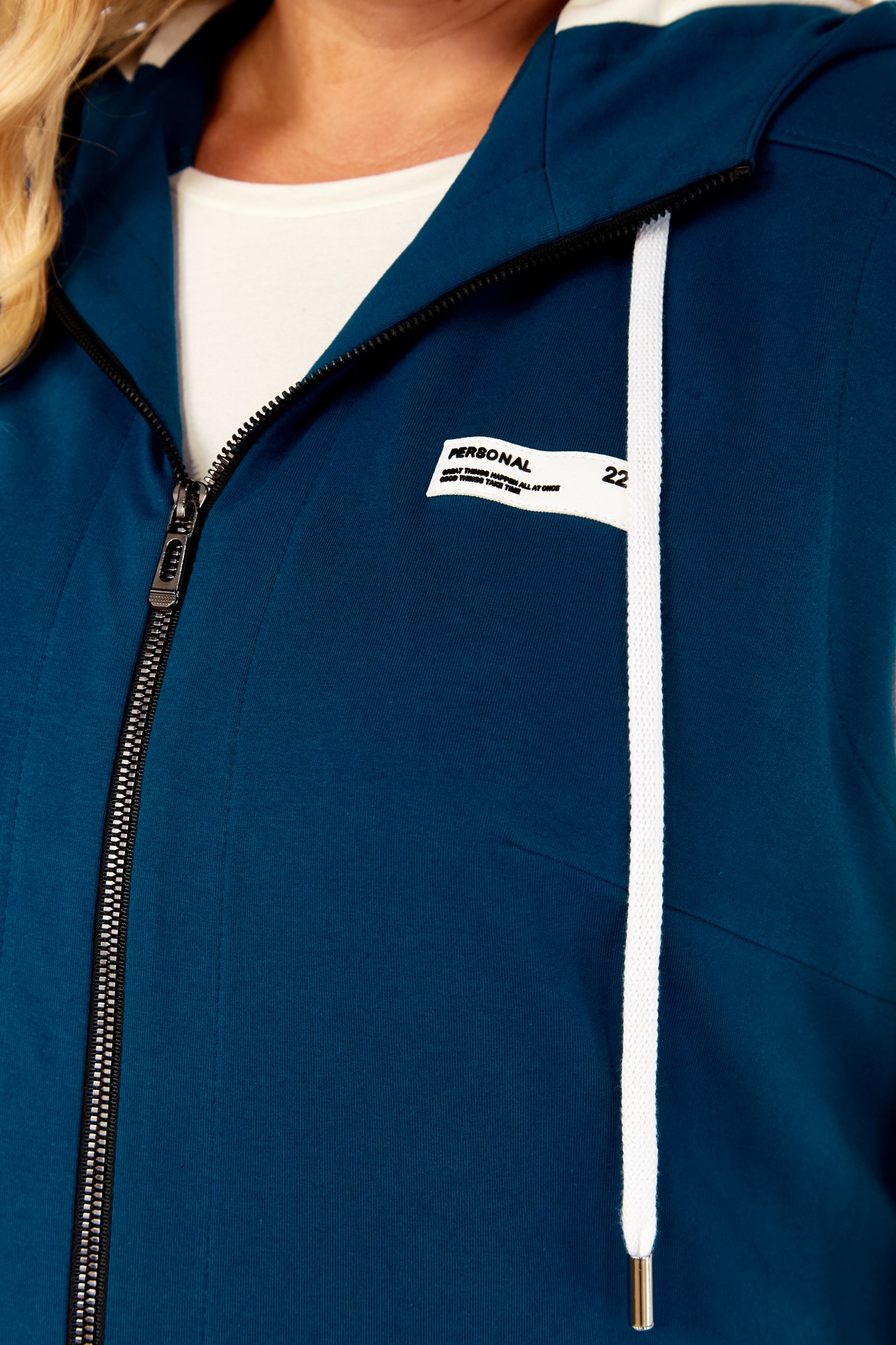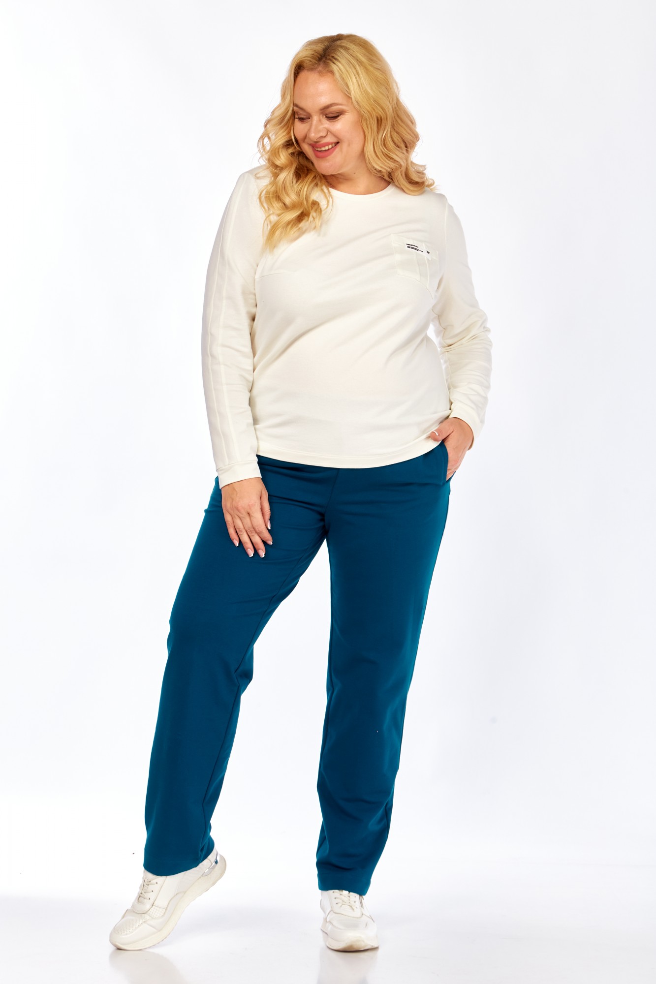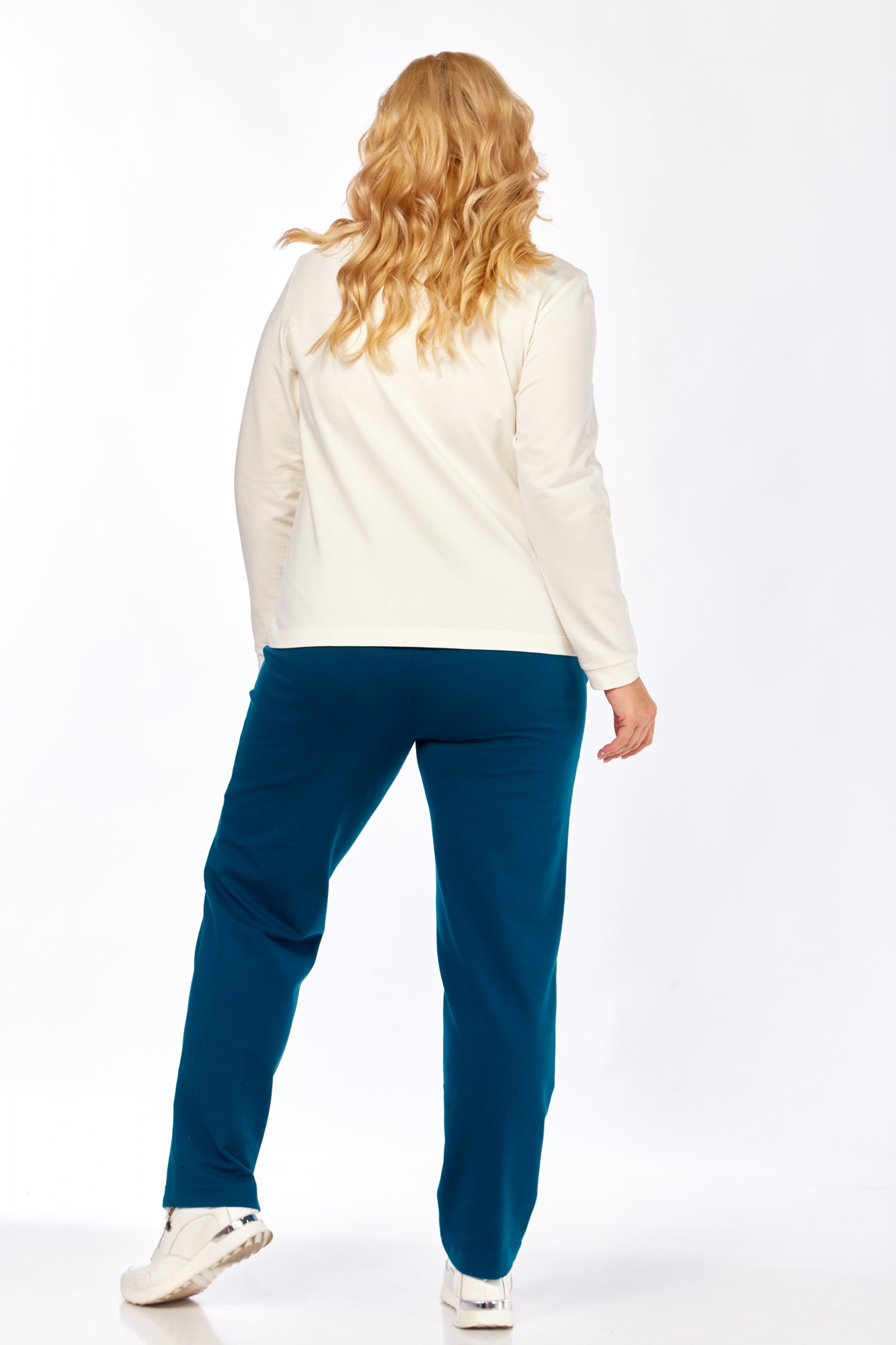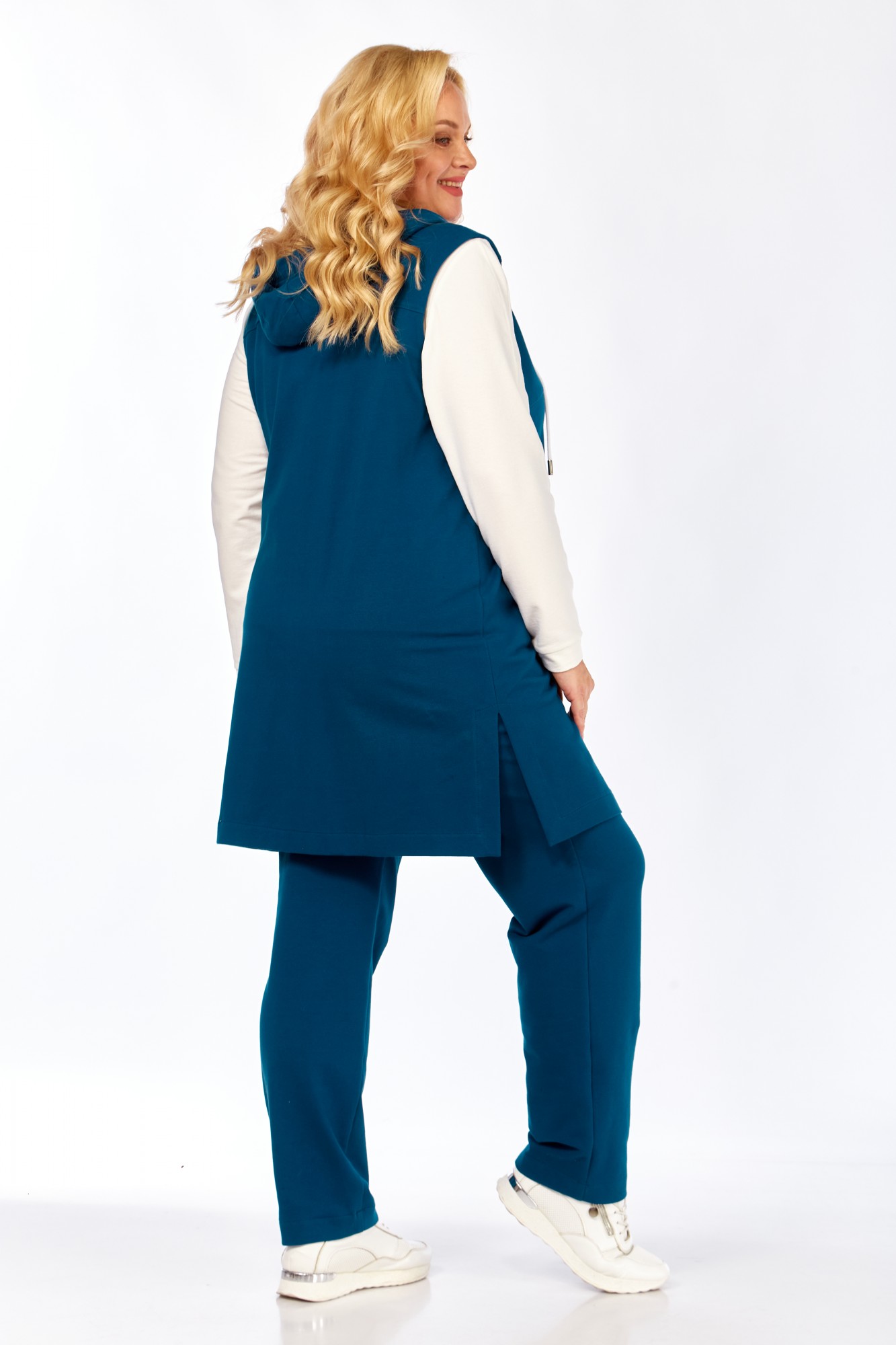 Стильный женский комплект состоит из жилета, брюк и блузы. Жилет свободного силуэта, центральной застежкой на тесьму молния. По переду на уровне бедер прорезные карманы с листочкой, горловина оформлена капюшоном, по боковым швам разрезы. Жилет с капюшоном. Брюки с прорезными карманами по переду, верх брюк оформлен поясом на резинке. Блуза из трикотажной ткани «футер», полуприлегающего силуэта. Горловина круглая, по переду с левой стороны накладной карман. Рукава втачные с отрезным лампасом по центру.