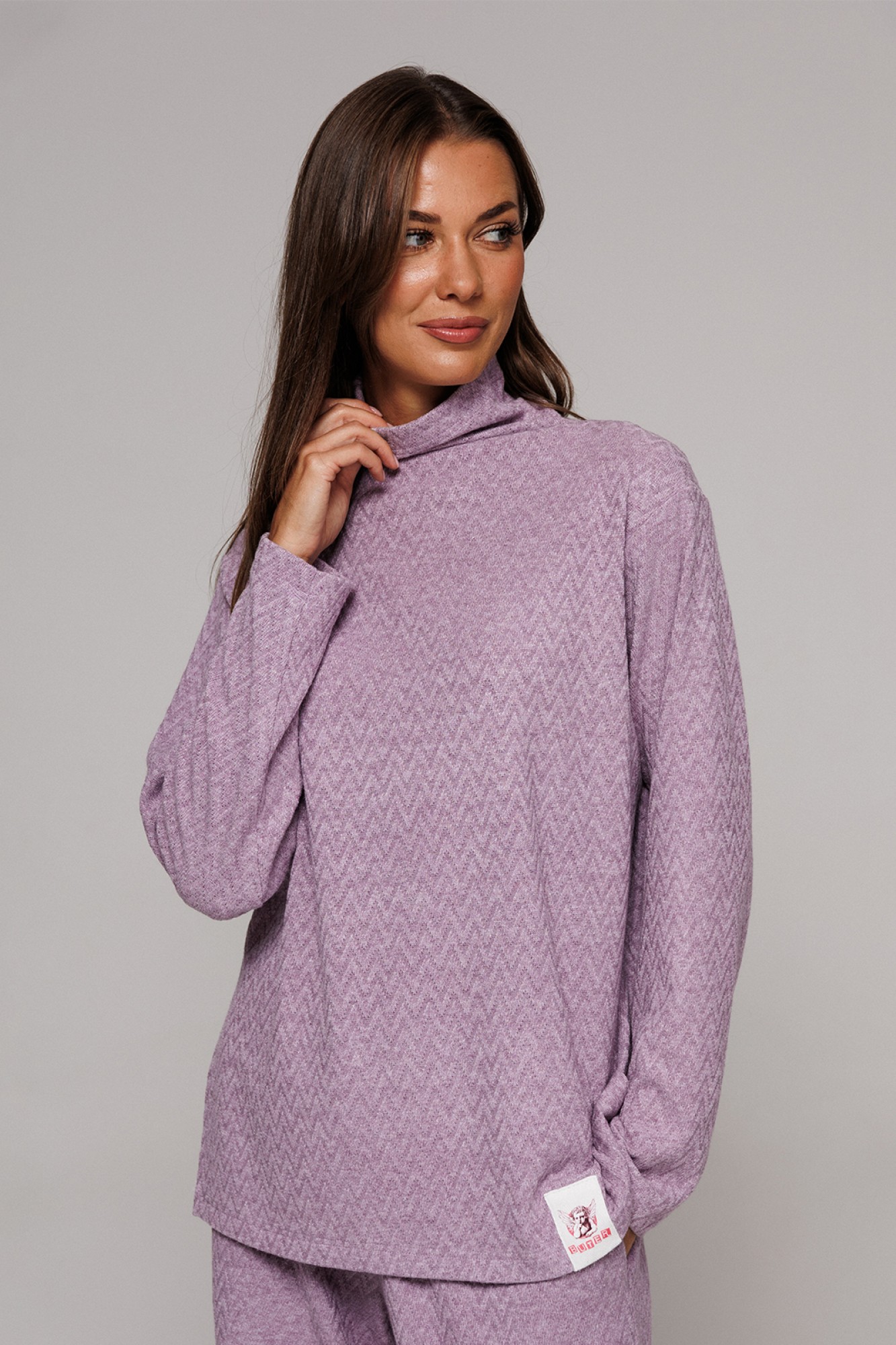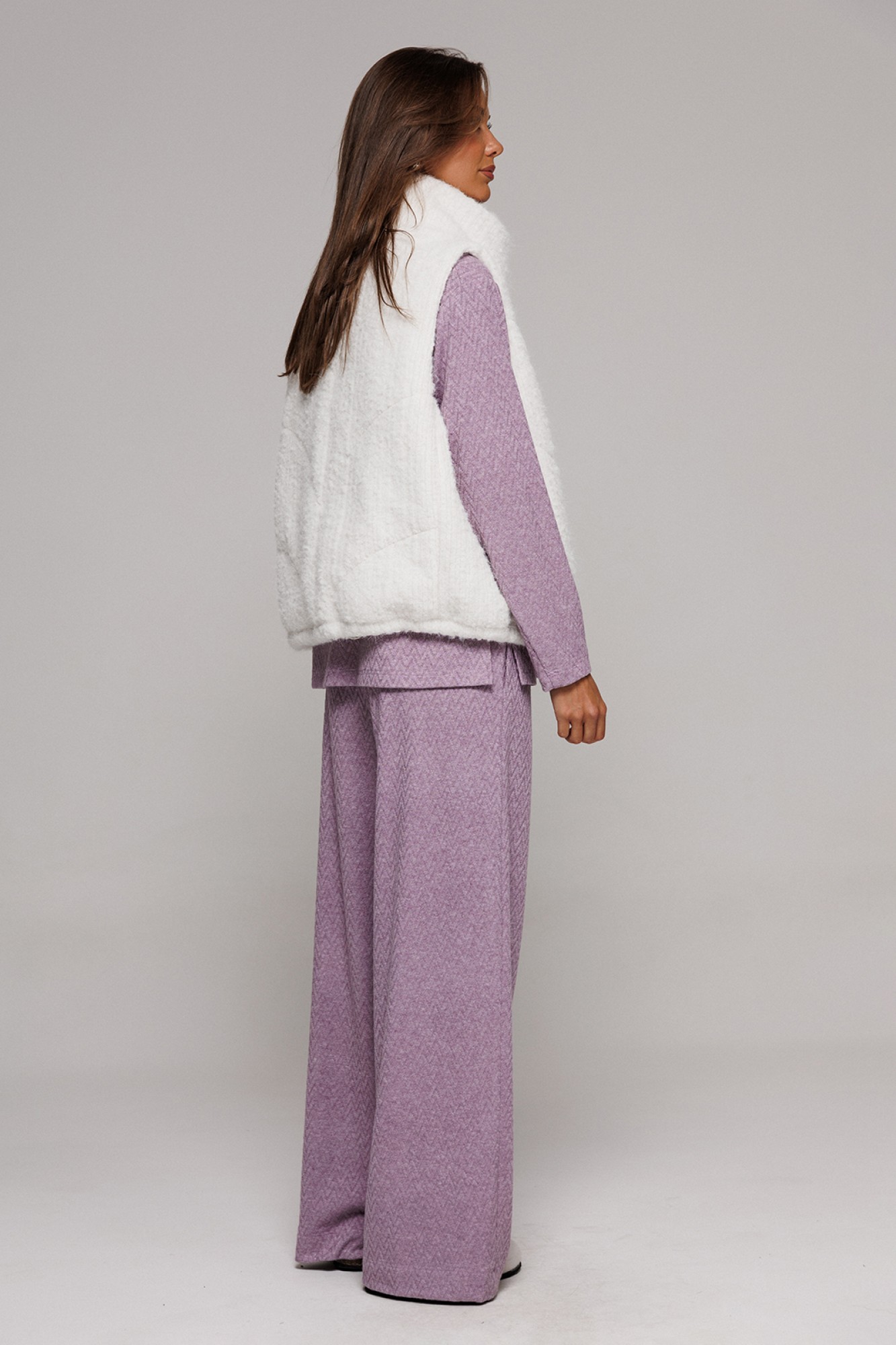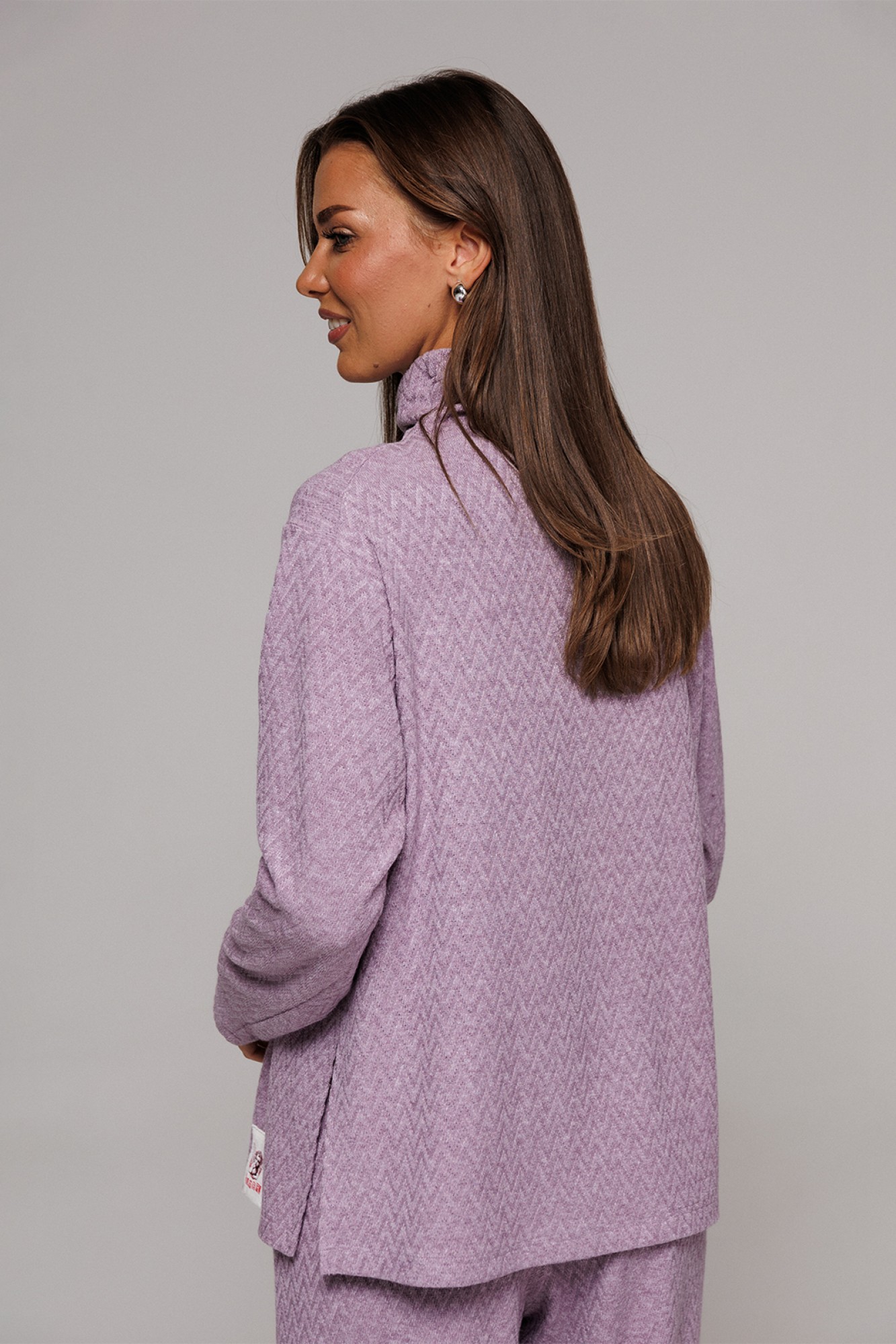 Костюм 2-ух предметный, состоящий из джемпера и брюк. Джемпер прямого силуэта со спущенной линией плеча. Рукав втачной. По переду нашивка "BUTER". Внизу по боковым швам обработаны высокие разрезы. Воротник-стойка цельнокроеная. Брюки на притачном, отстроченном поясе с резинкой. Брюки от линии бедра слегка расширены к низу, с карманами в боковых швах.