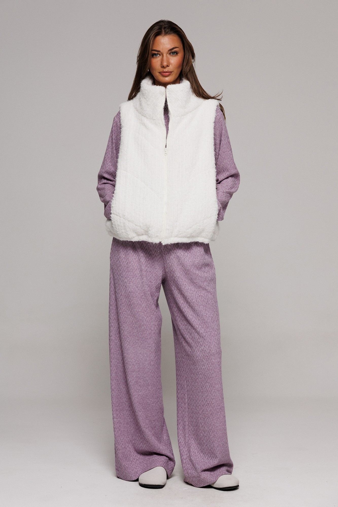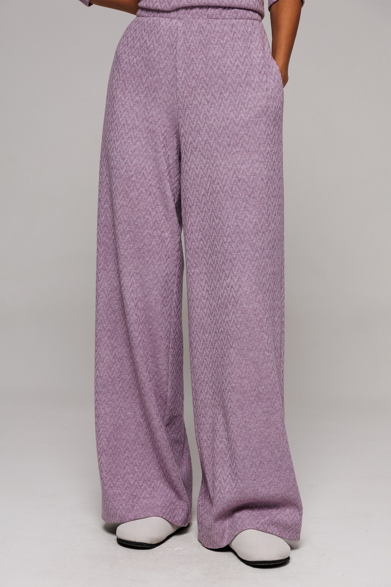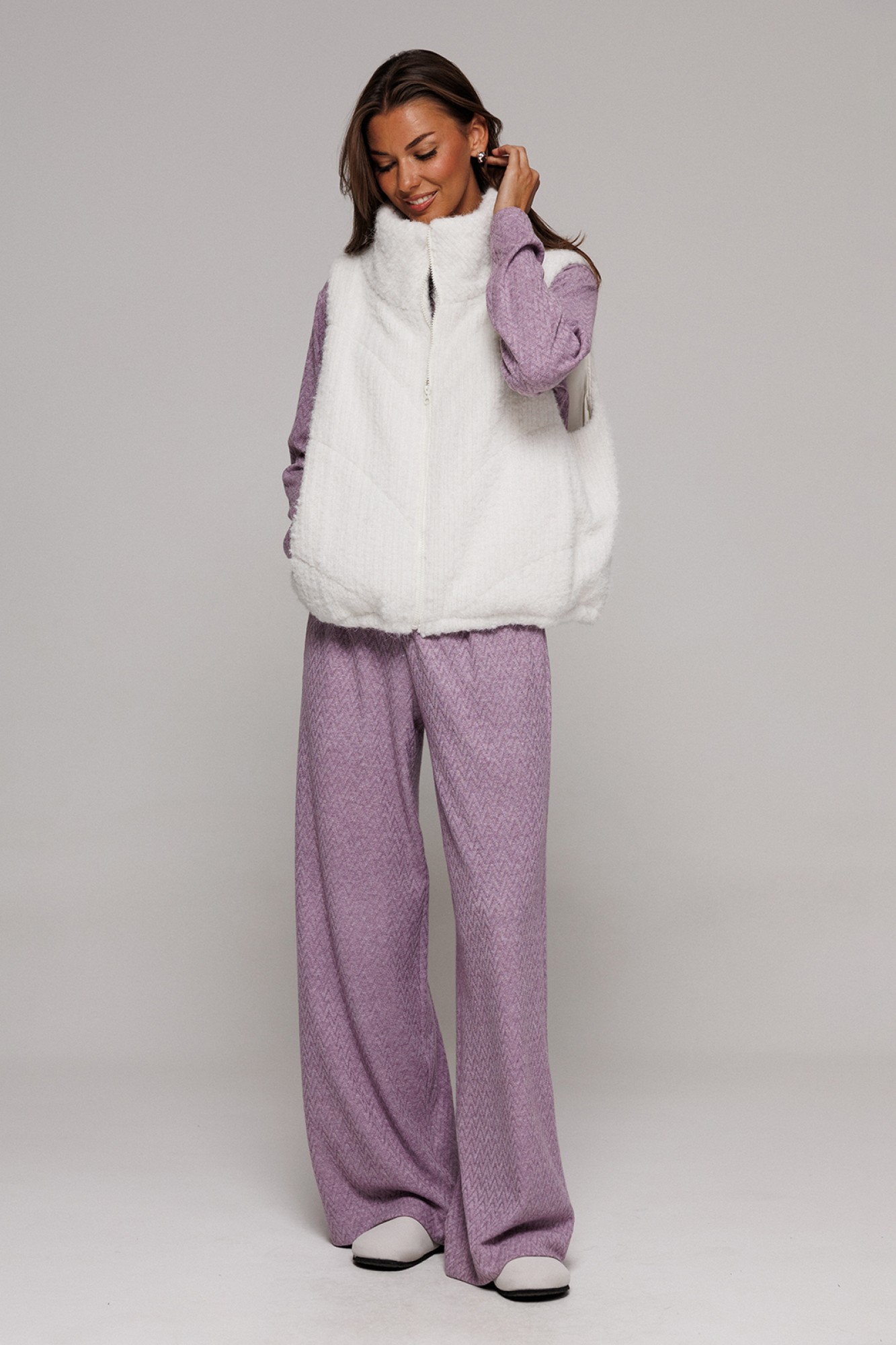 Костюм 2-ух предметный, состоящий из джемпера и брюк. Джемпер прямого силуэта со спущенной линией плеча. Рукав втачной. По переду нашивка "BUTER". Внизу по боковым швам обработаны высокие разрезы. Воротник-стойка цельнокроеная. Брюки на притачном, отстроченном поясе с резинкой. Брюки от линии бедра слегка расширены к низу, с карманами в боковых швах.