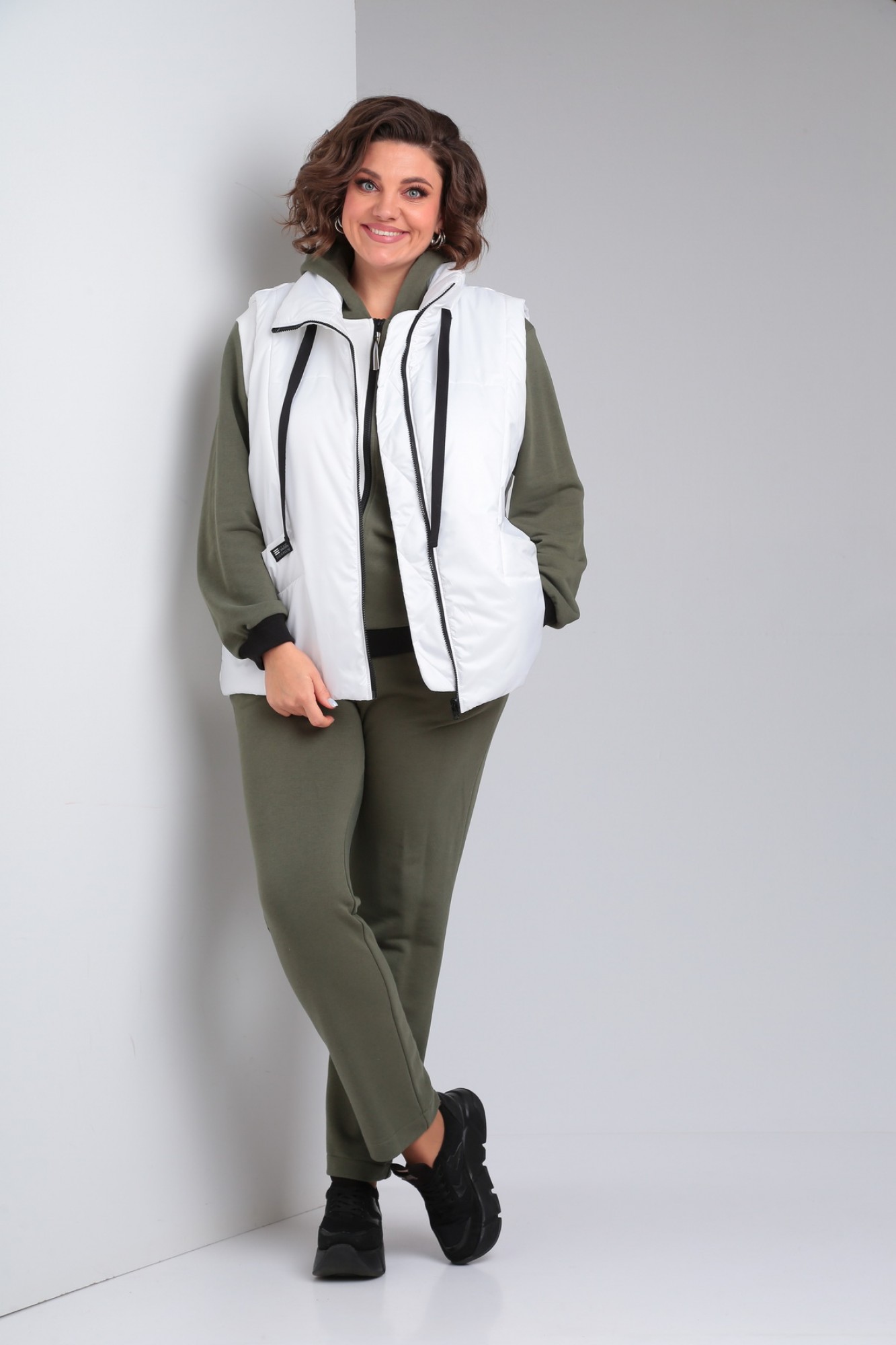 Комплект 3-ка состоящий из жилетки, кофты и брюк. Брюки и кофта из трикотажного полотна 3-х цветов, брюки зауженные с поясом на резинке, со шнуром и боковыми карманами в швах. Толстовка с застёжкой "молния". Спинка с полосой по центру из отделочной ткани и печатью по светлой детали. Перед с бочками из отделочной ткани. Правая часть светлая украшена печатью. Карманы боковые обработаны в швах рельфах. Воротник-капюшон. Рукав втачной одношовный. По низу изделия и рукавов -довязы.Жилетка женская утепленная с центральной застежкой на "молнию". Спинка со стяжкой. Перед с отрезными бочками и боковыми карманами "с листочкой". Воротник стойка с кулисой и шнуром из декорированной тесьмы. Низ жилетки округлой формы спереди короче, а спинка длиннее . Правый карман украшен нашивкой.