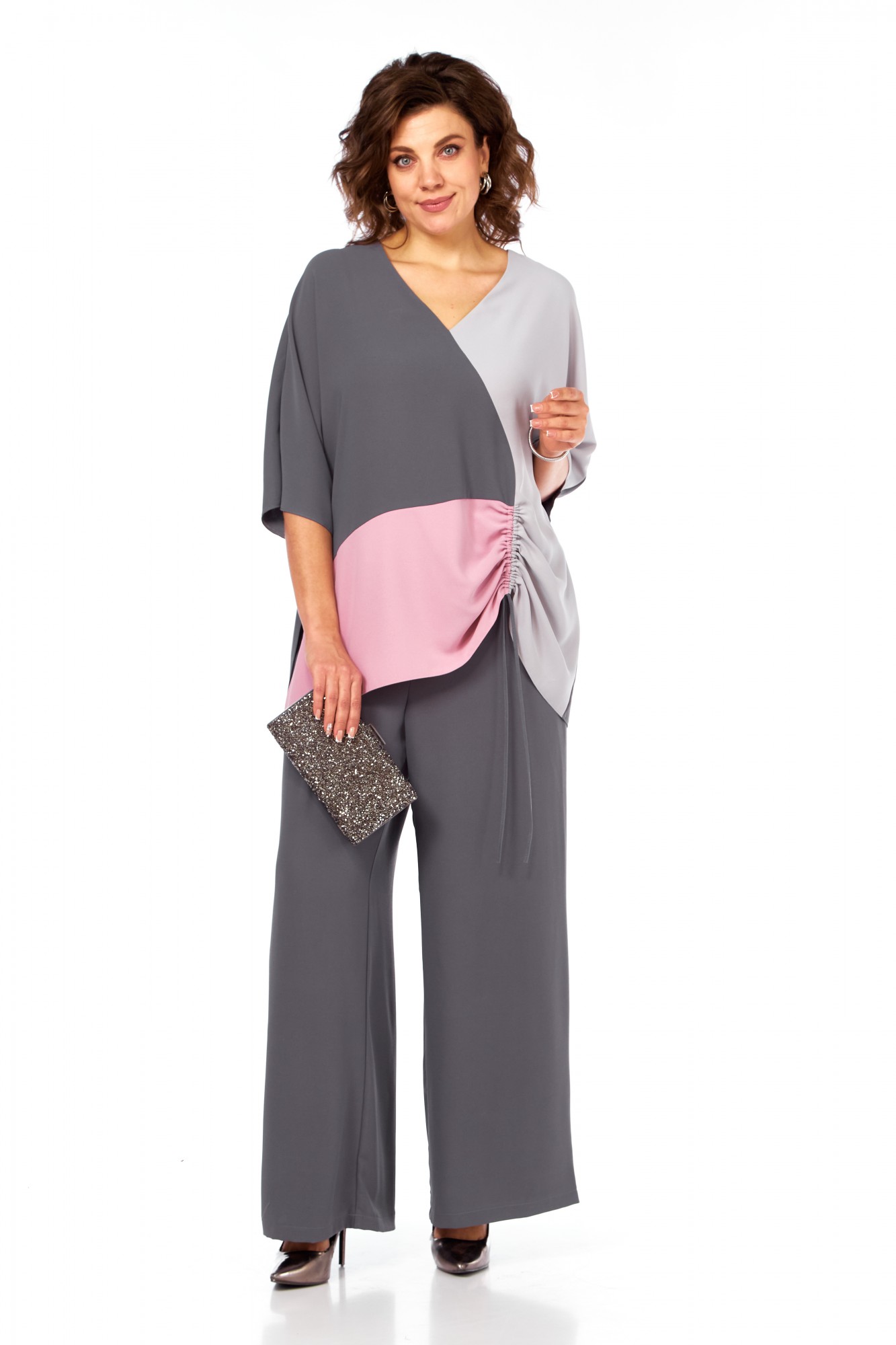 Комплект брючный состоит из блузы и брюк. Брюки прямые, широкие, с боковыми карманами и поясом частично на резинке. Блузон свободного кроя с цельнокроеным рукавом. Перед с ассиметричными подрезами и вертикальной кулисой со шнуром, который создает драпировку с левой стороны. Детали переда выполнены в разных цветах. Горловина V-образной формы, обработана обтачкой.