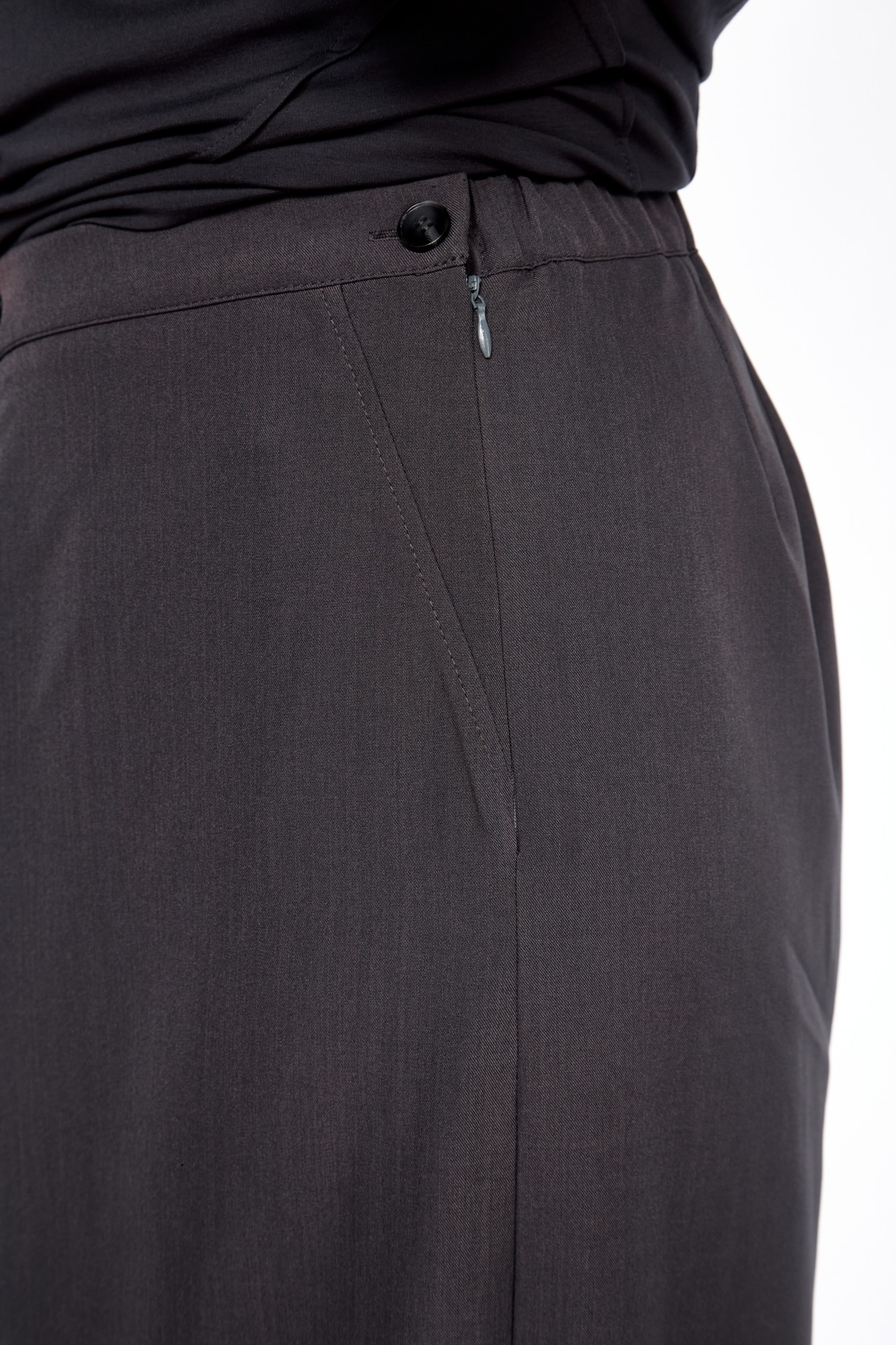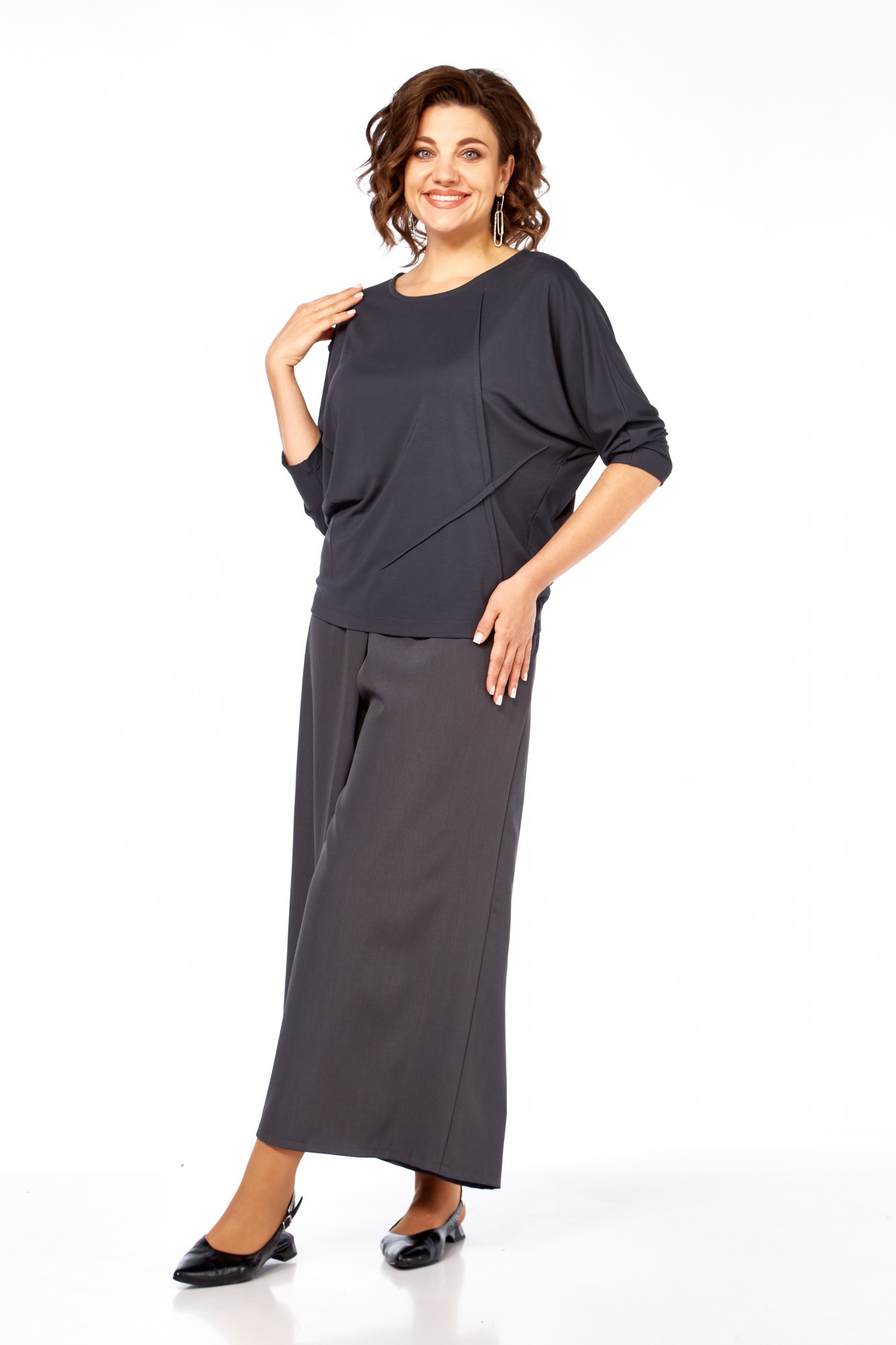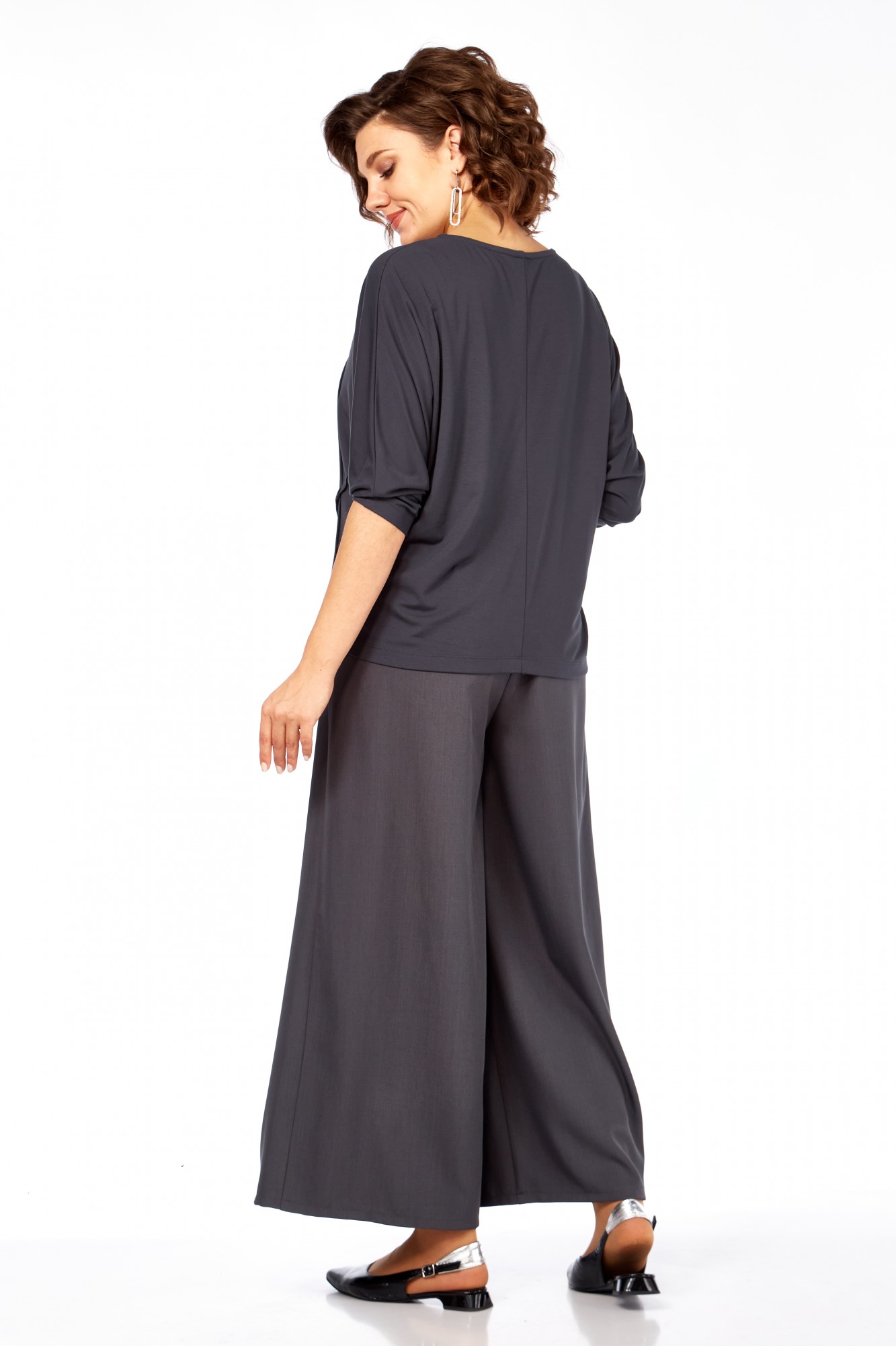 Комплект брючный состоит из кофты и кюлотов. Кофта выполнена из трикотажного полотна. Спинка со средним швом. Перед с ассиметричными застроченными наверх вытачками. Рукав цельнокроеный, длиной 7/8. Горловина округлой формы. Брюки-кюлоты со встречной складкой спереди. По бокам имитация карманов. В левом боковом шве потайная молния. Пояс притачной.