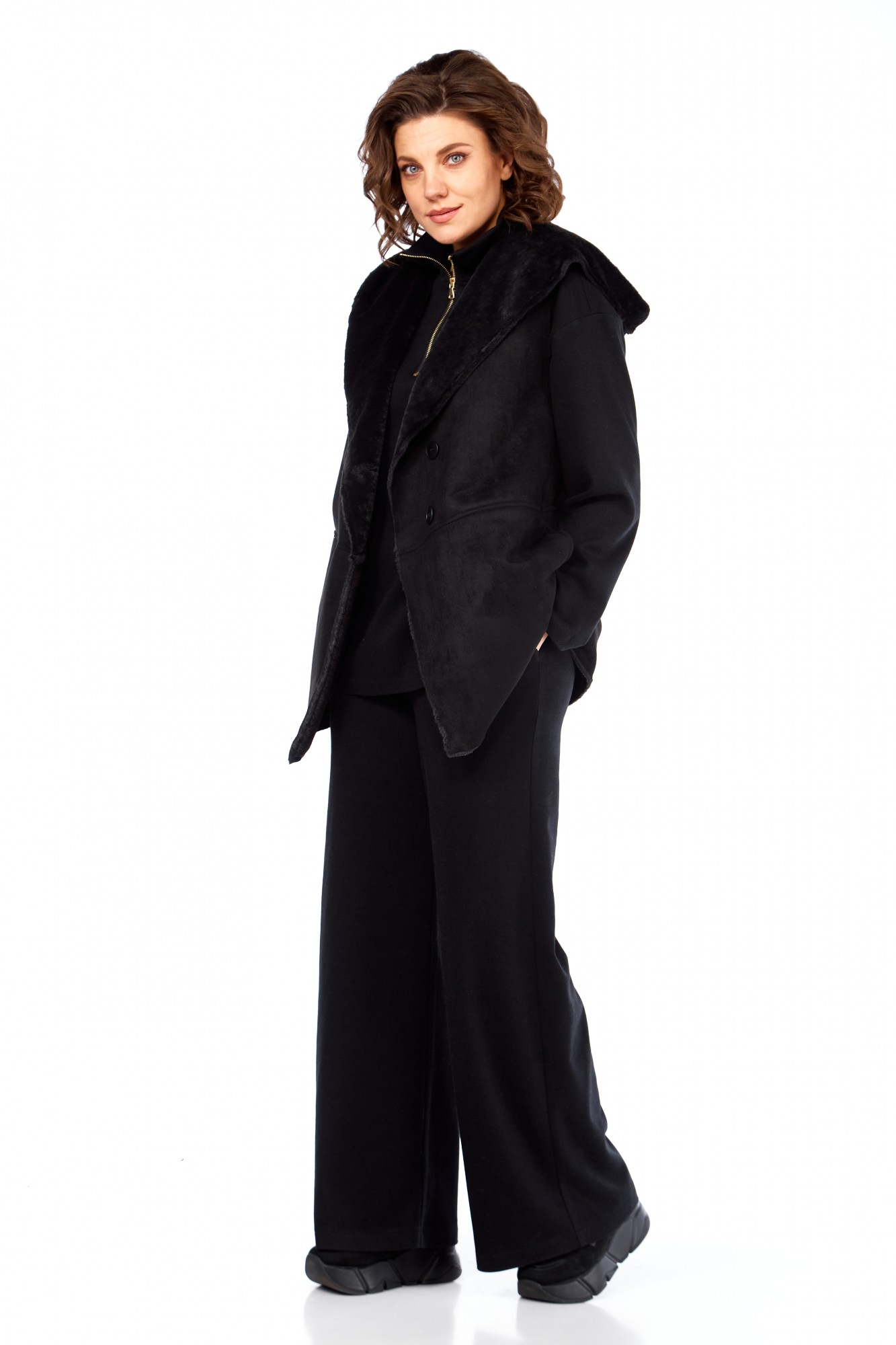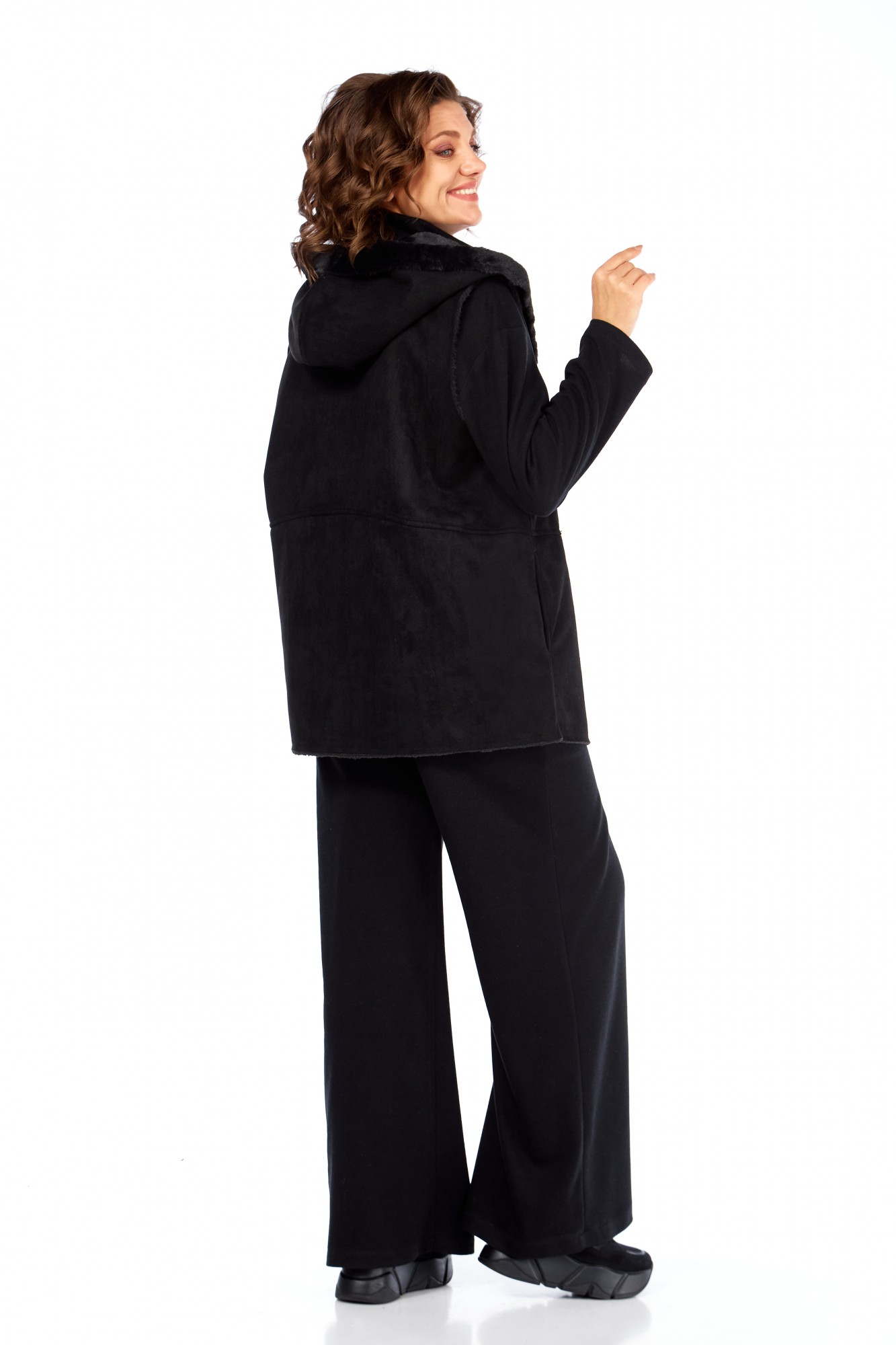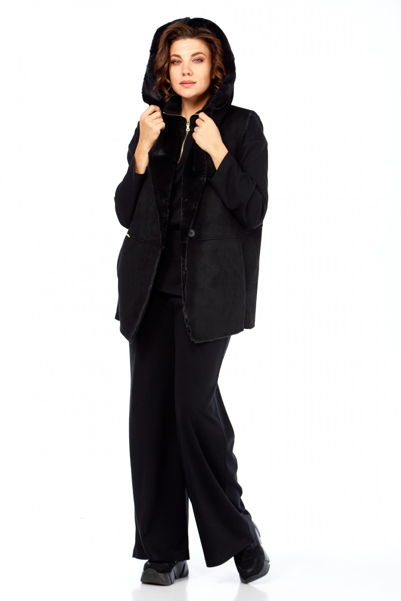 Комплект брючный состоит из кофты, жилетки и брюк. Кофта полуприлегающего силуэта со спущенным плечом, рукав втачной, одношовный. Воротник стойка с застежкой на тесьму-молнию. По боковым швам разрезы. Брюки расширенные книзу, верхний срез обработан поясом с резинкой. В боковых швах карманы. Жилетка свободного кроя со смещенной застежкой на петлю и пуговицу. По спинке горизонтальный рельефный шов на перед, в котором обработаны карманы. Цельнокроеный капюшон с центральной частью. В качестве отделки используется фурнитура.