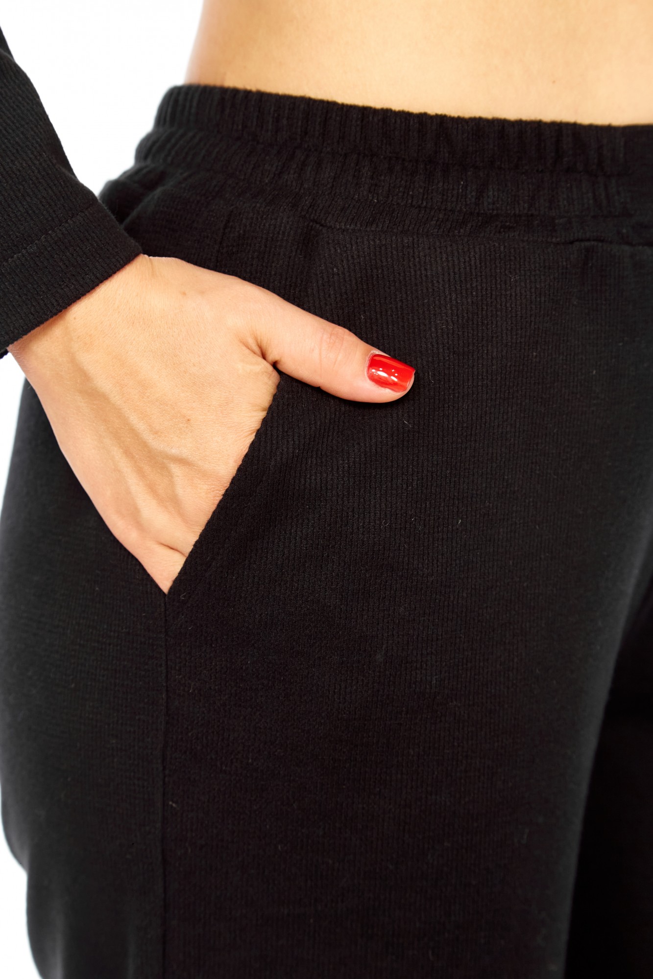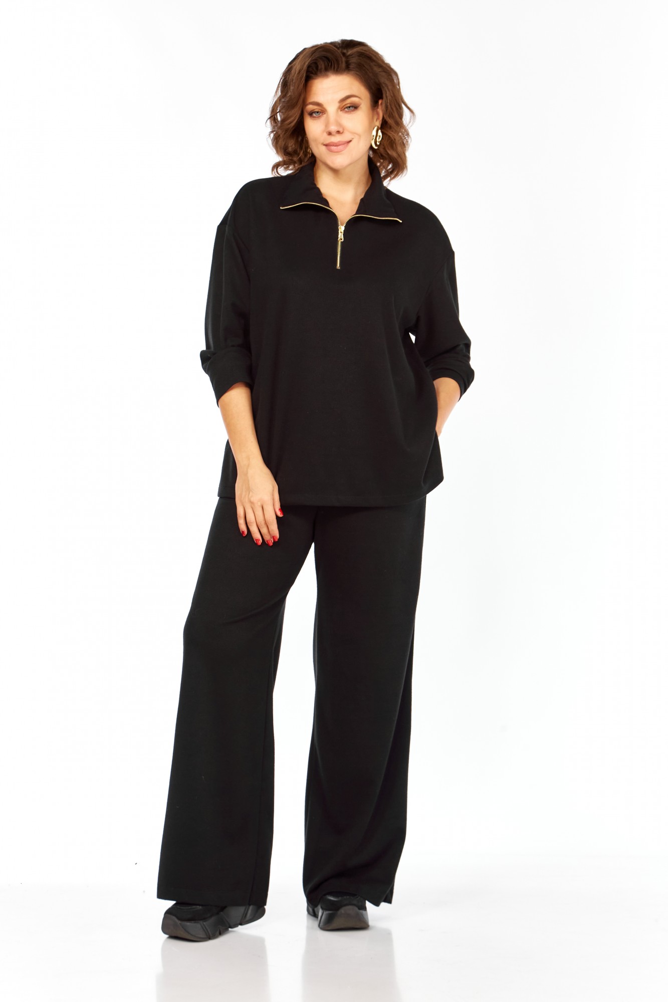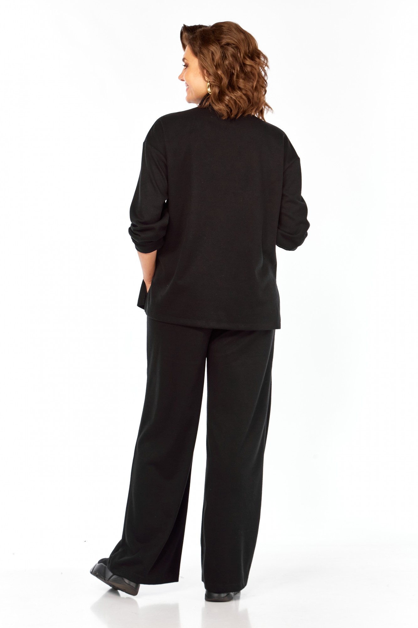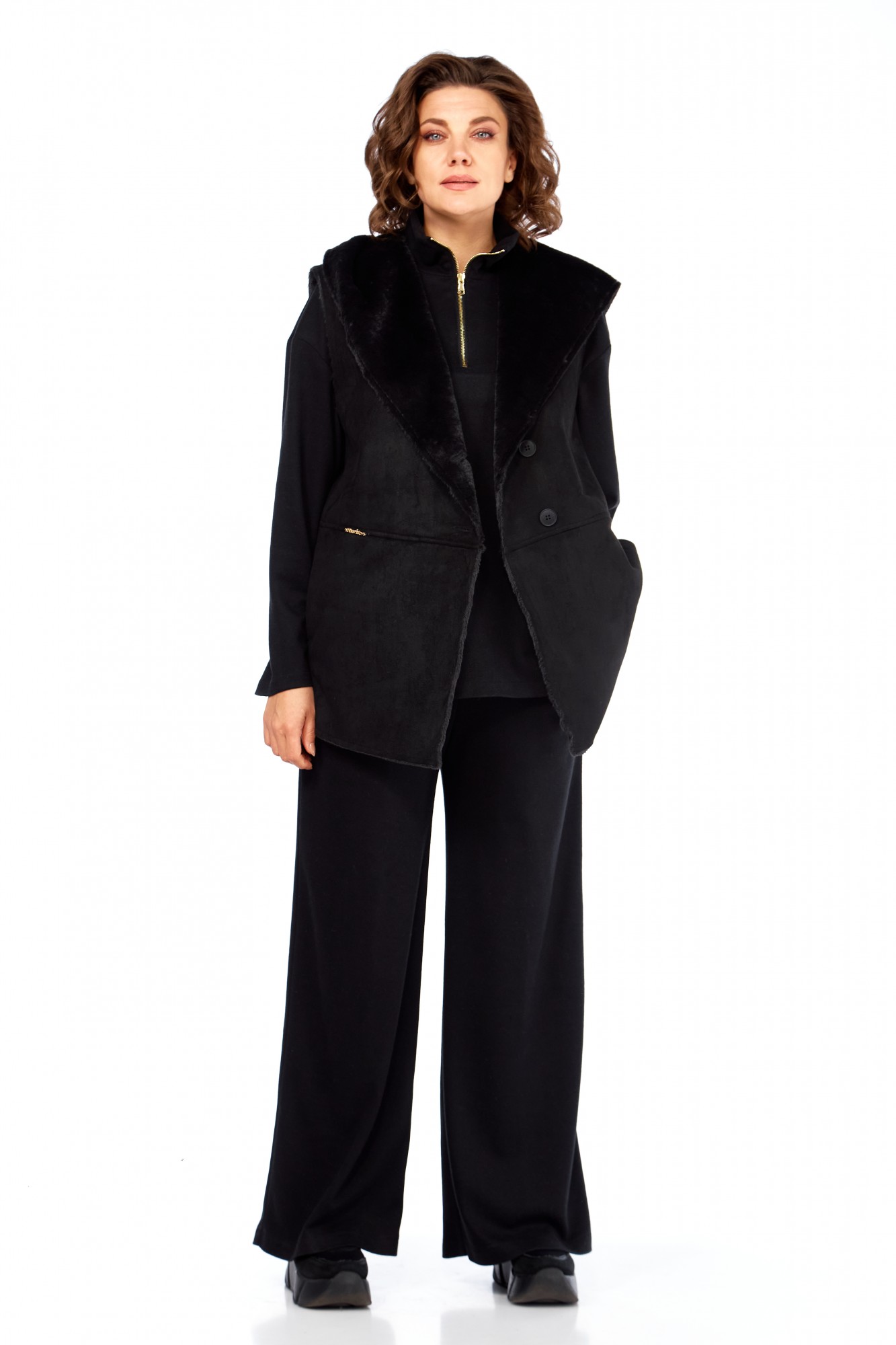Комплект брючный состоит из кофты, жилетки и брюк. Кофта полуприлегающего силуэта со спущенным плечом, рукав втачной, одношовный. Воротник стойка с застежкой на тесьму-молнию. По боковым швам разрезы. Брюки расширенные книзу, верхний срез обработан поясом с резинкой. В боковых швах карманы. Жилетка свободного кроя со смещенной застежкой на петлю и пуговицу. По спинке горизонтальный рельефный шов на перед, в котором обработаны карманы. Цельнокроеный капюшон с центральной частью. В качестве отделки используется фурнитура.