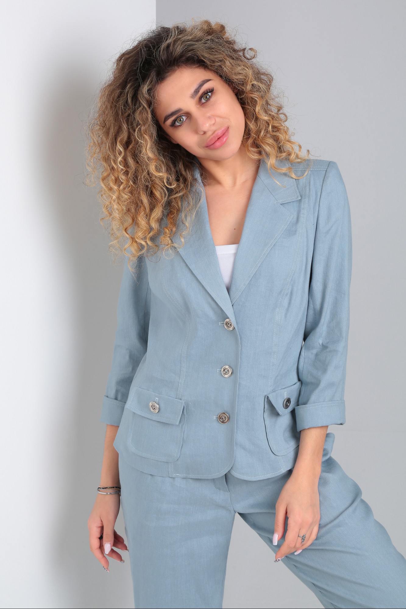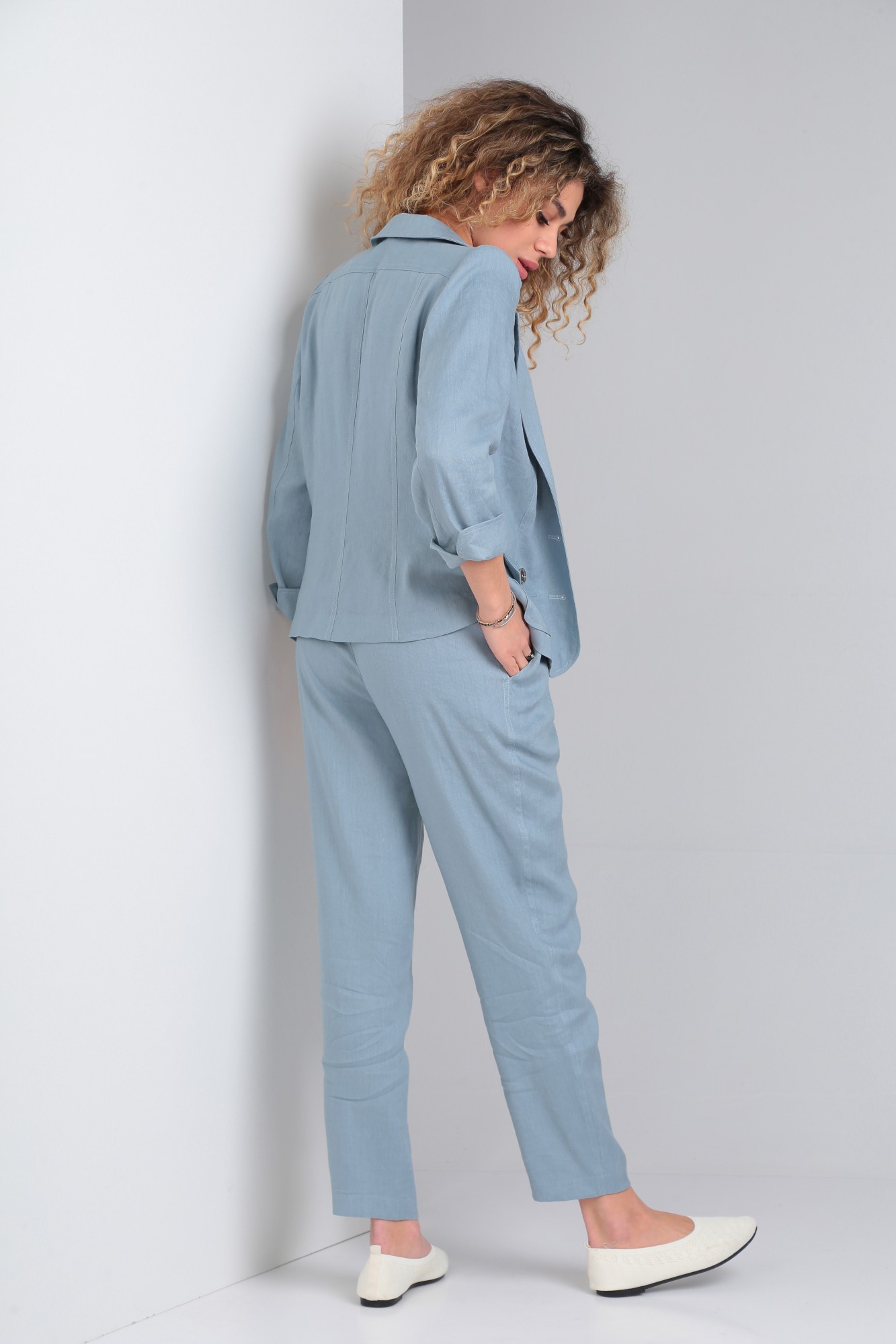 жакет: 53% лен, 47% вискоза; брюки: 53% лен, 47% вискоза