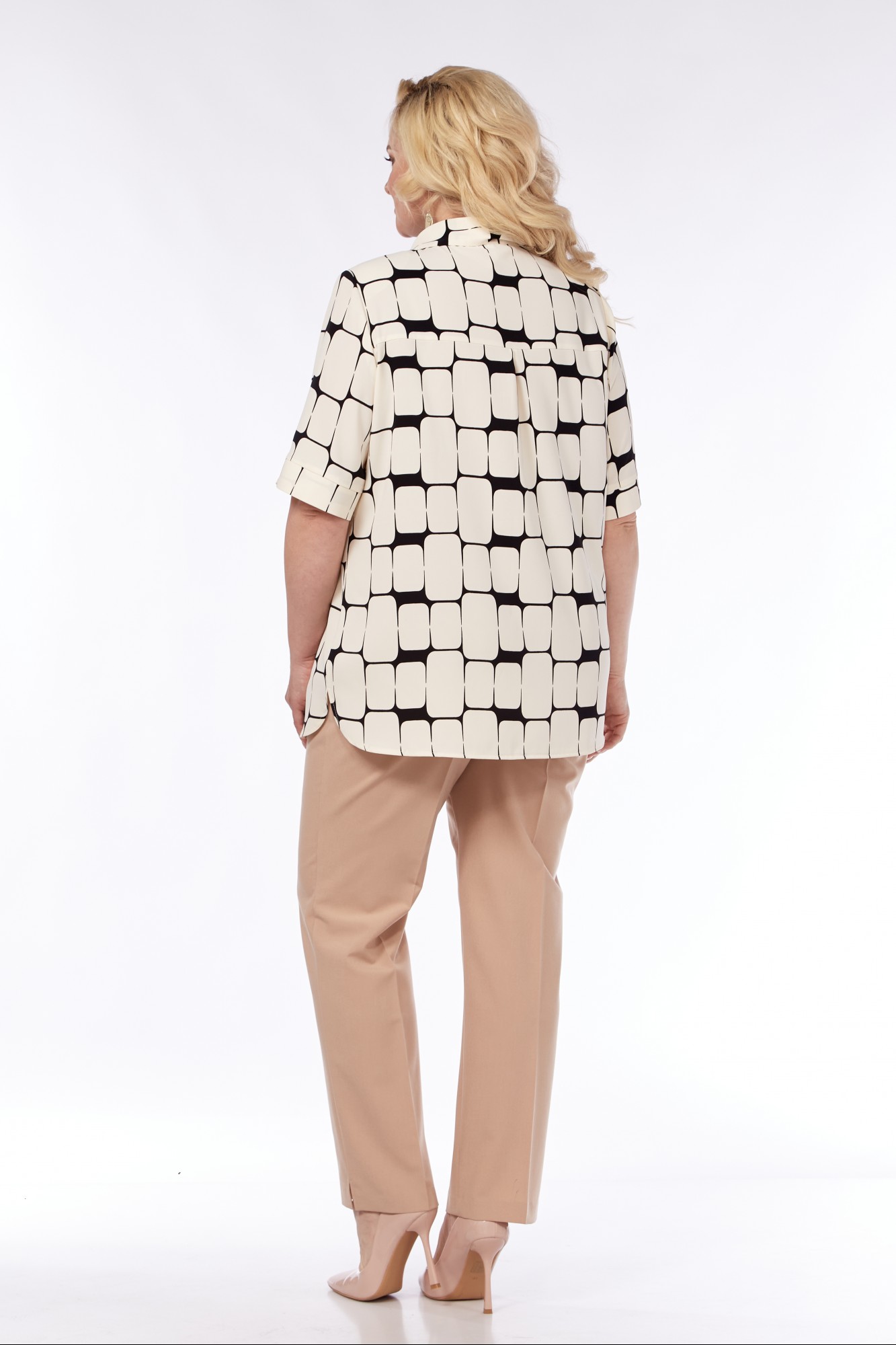 Комплект из блузы и брюк. Универсальная базовая блузка прямого силуэта. По переду вытачки нагрудные, накладные карманы, застежка в виде планки на петли пуговицы. Воротник стояче-отложной. По спинке отложная кокетка. Рукав втачной короткий, низ обработан притачной манжетой. В боковых швах предусмотрены фигурные разрезы по низу изделия. Брюки слегка зауженные к низу. Пояс притачной, частично на резинке. Застежка спереди брюки на тесьму-молнию, петлю-пуговицу