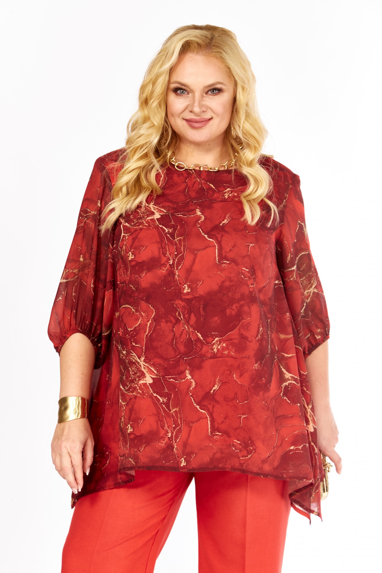 Брючный комплект предназначен для элегантных женщин. Блуза сводного кроя из принтованного шифона, что придает уникальность стилю своими красками. На полочке нагрудные вытачки, вырез горловины аккуратной округлой формы. Рукав втачной, свободный, низ присборен. Брюки слегка зауженные к низу. Пояс притачной, частично на резинке.