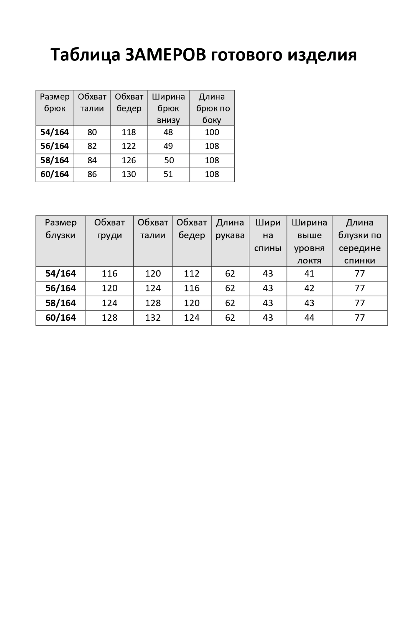 Таблица размеров