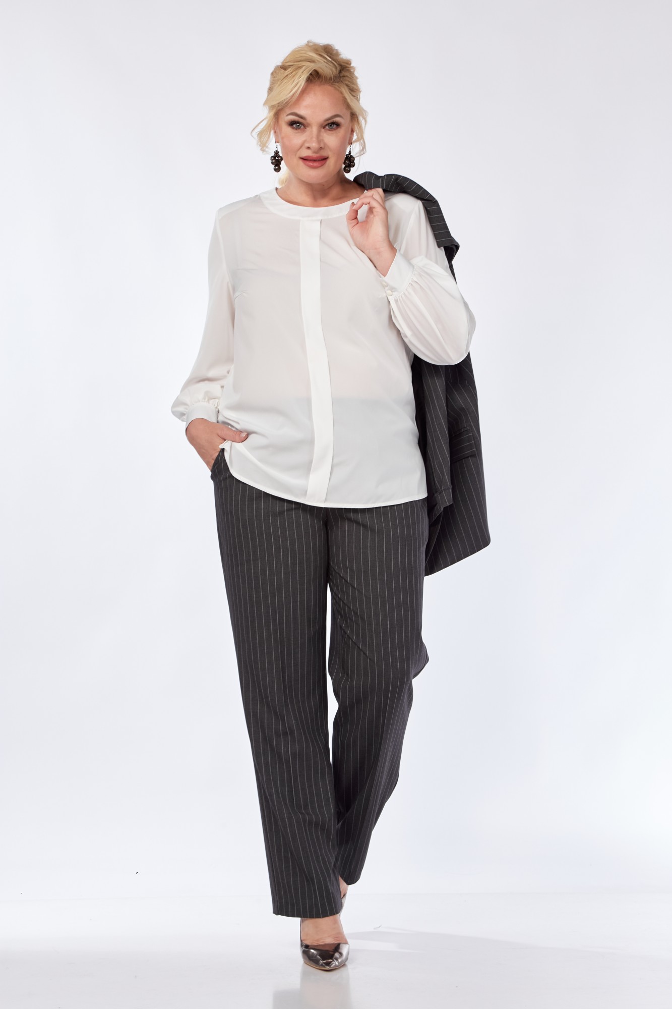 Комплект тройка, состоит из блузки, жилета и брюк. Жилет полуприлегающего силуэта. Центральная застежка на 2 пуговицы. Воротник английский классика. На полочке прорезные карманы с клапаном. Полочка обработана подкладкой. Спинка с рельефными швами. Блуза прямого силуэта из креп-шифона. На полочке нагрудные вытачки, по центру полочки декоративный элемент. Горловина обработана притачной планкой. Спинка со средним швом. Застежка сзади в среднем шве на 1 навесную петлю, 1пуговицу. Рукав втачной. Низ рукава присборен, обработан манжетой. В боковых швах разрезы.