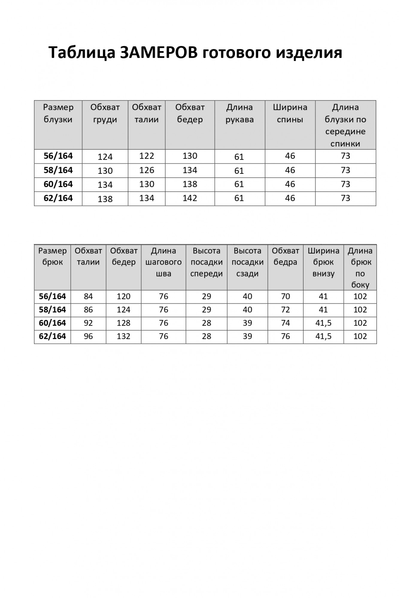 Стильный образ подчеркнет привлекательность, комплект в котором с легкостью обратите на себя внимание. Блуза прямого силуэта. По центру полочки застежка в виде планки на миниатюрные пуговицы. Полочки с накладными карманами. Воротник отложной, рукав втачной, внизу обработан притачной манжетой с застежкой на пуговицы. Спинка с отрезной кокеткой, низ скруглен, в боковых швах небольшие разрезы. Брюки классические с заутюженными стрелками, слегка зауженные к низу, оформлены притачным поясом, частично на резинке. Застежка спереди брюк на молнию и петлю-пуговицу.