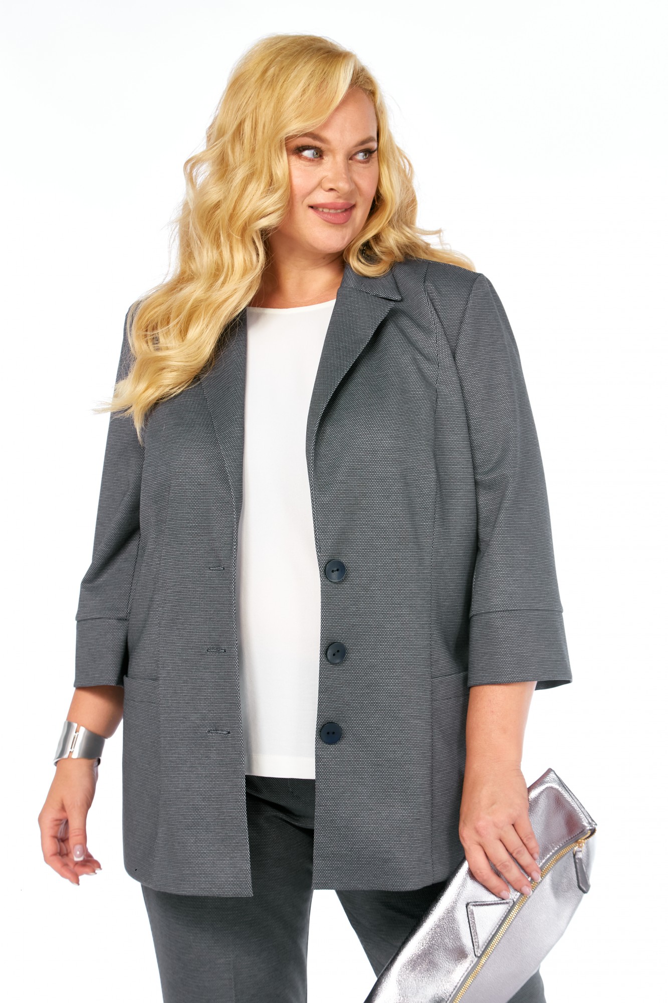 Комплект тройка, состоит из жакета, блузки и брюк, выполнен из трикотажной ткани. Жакет полуприлегающего силуэта с центральной бортовой застежкой на петли и пуговицы. Полочки обработаны подкладкой. Горловина V-образной формы. Полочка с накладными карманами. Рукав втачной, укороченный на притачной манжете. Блуза прямого силуэта с нагрудными вытачками, спущенной линией плеча. Низ ассиметричный в боковых швах имеются разрезы. Брюки классические с заутюженными стрелками, слегка зауженные к низу, оформлены притачным поясом, частично на резинке. Пояс притачной, частично на резинке, это обеспечивает комфортную посадку. Застежка спереди брюк на молнию и петлю-пуговицу.