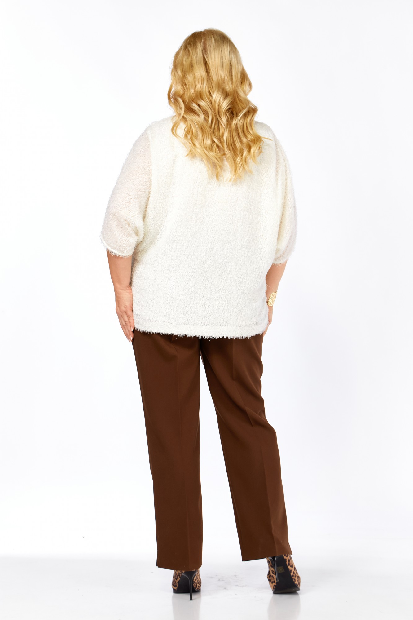 Комплект 2-ух предметный, состоит из блузки и брюк. Уникальная блуза, сочетает в себе изысканный дизайн и комфорт. Прекрасно подойдет для праздничных мероприятий. Блуза полуприлегающего кроя. Горловина аккуратной округлой формы. Эффектные рукава с фантазийным решением — усиливают модный акцент и придают дополнительный шарм. Декоративным элементом является съемная дизайнерская брошь. Брюки слегка зауженные к низу. Пояс притачной, частично на резинке. Застежка спереди на тесьму-молнию, петлю-пуговицу.