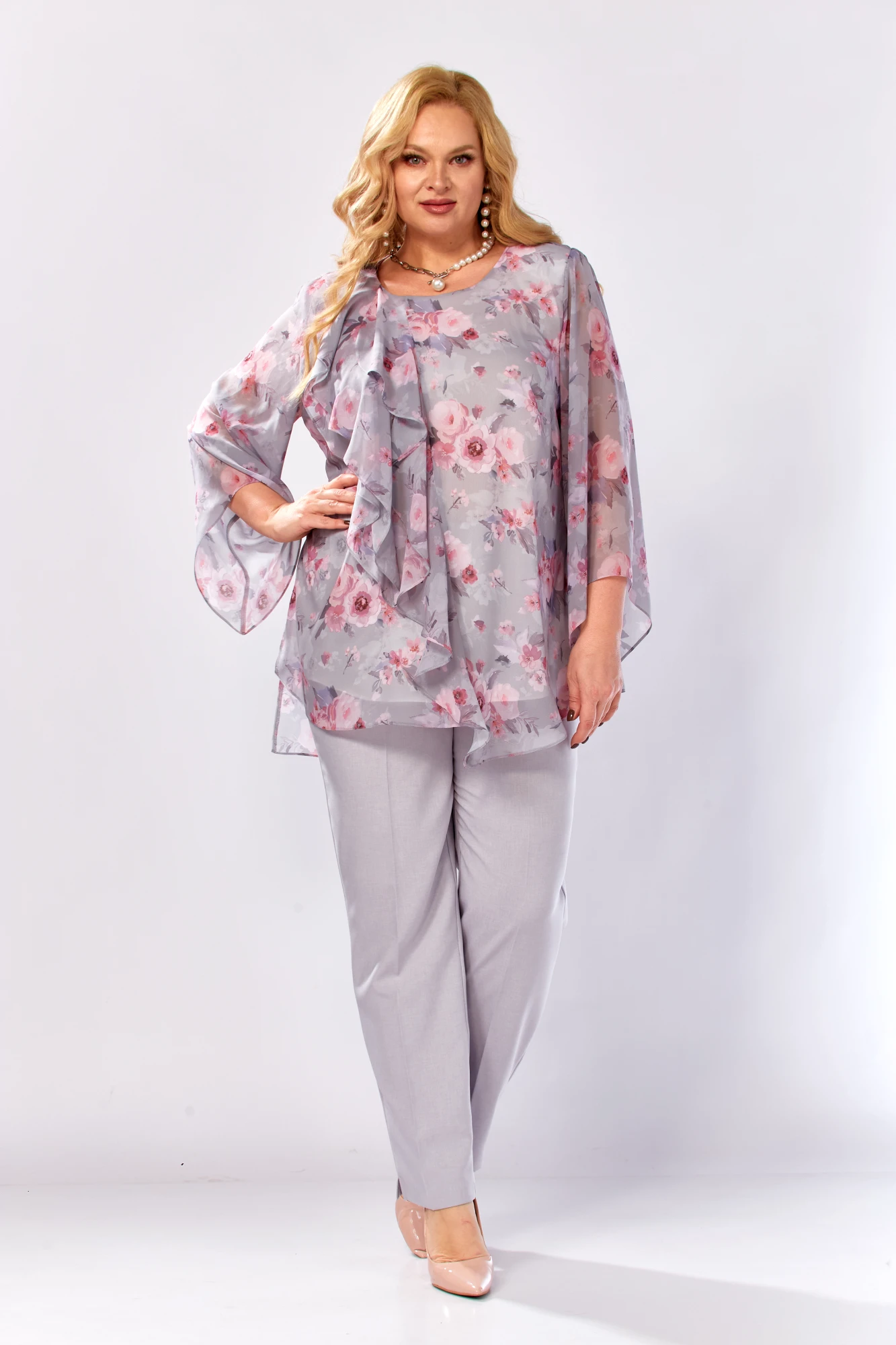 Брючный костюм Элль-Стиль 2460 серый, розовый принт
