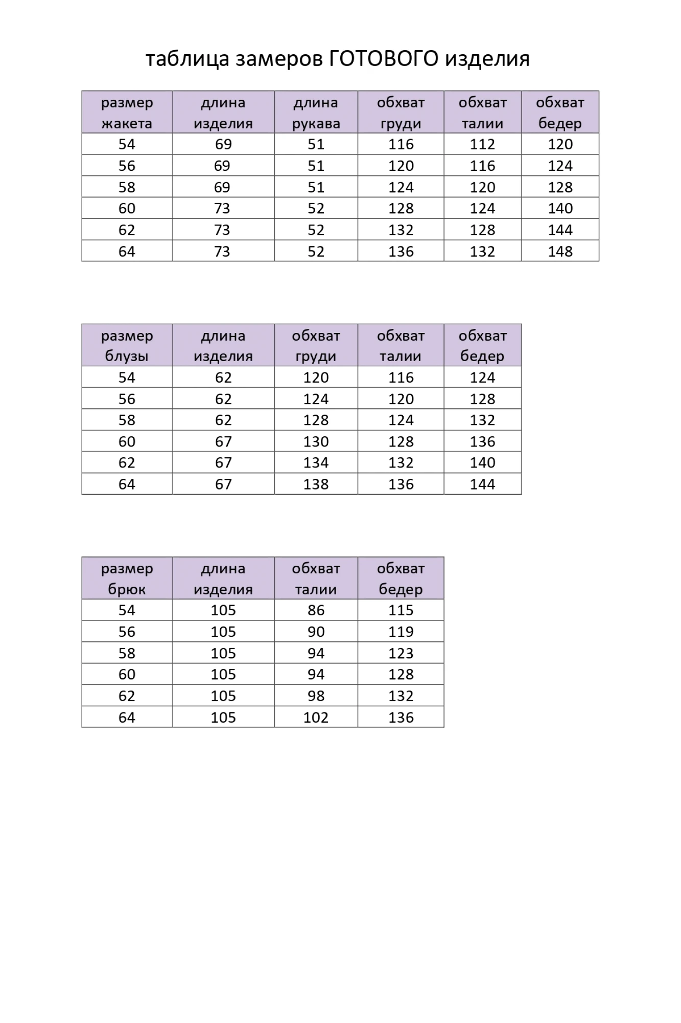 Жакет, брюки – полиэстер 50%, вискоза 50%. Блузка – полиэстер 50%, вискоза 50%