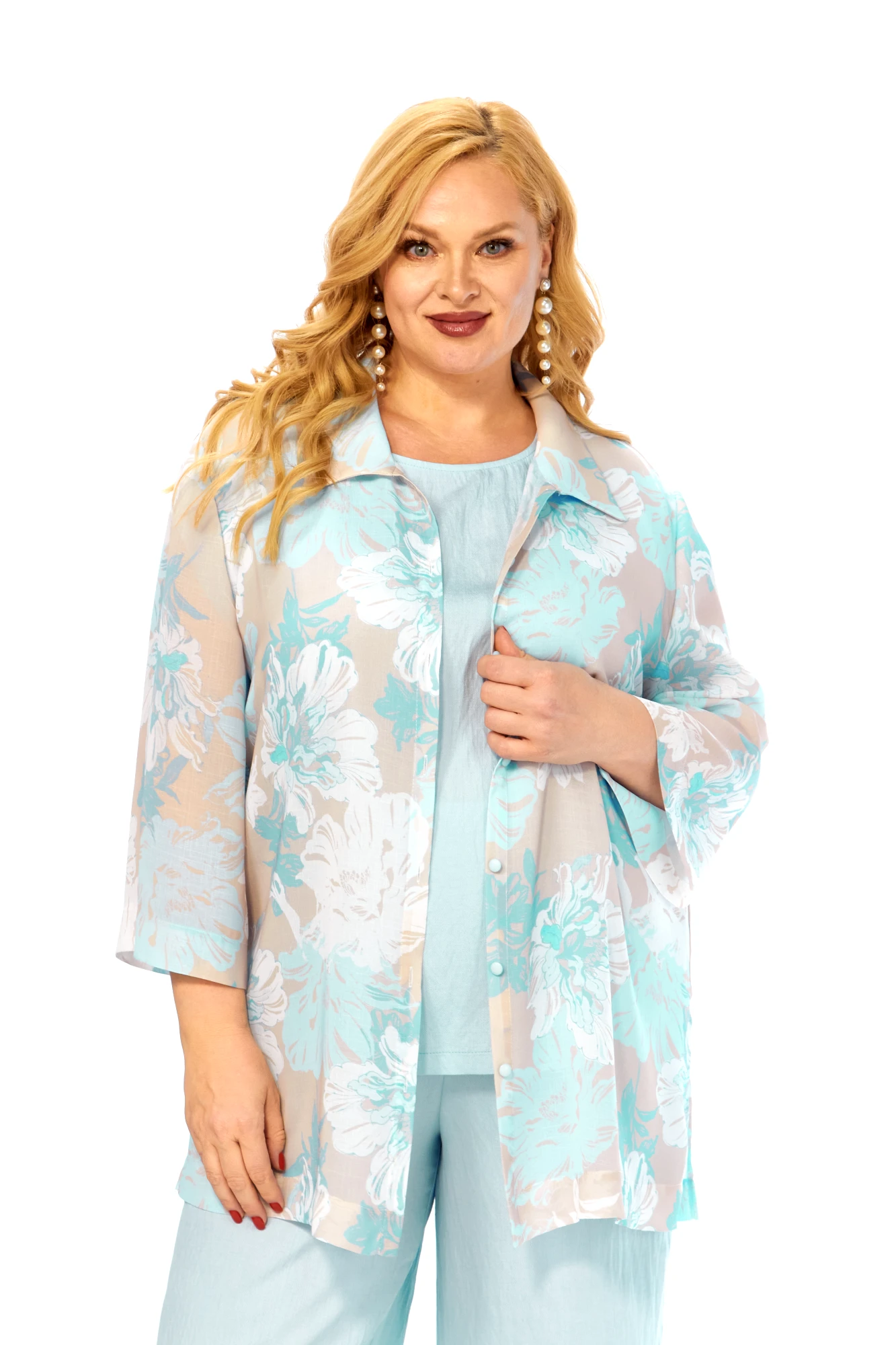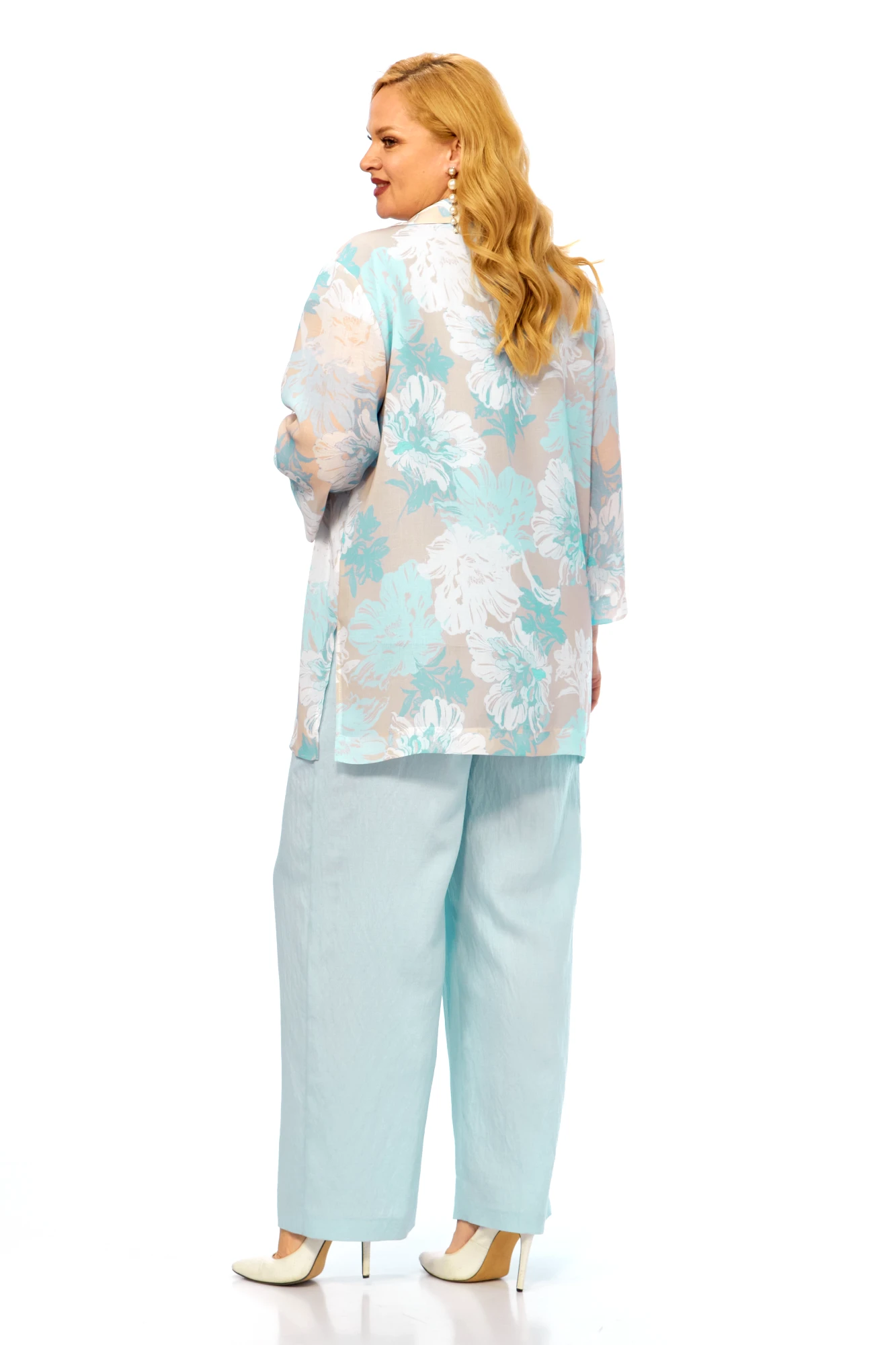 Брючный костюм Элль-Стиль 2466 тройка голубой, принт цветы