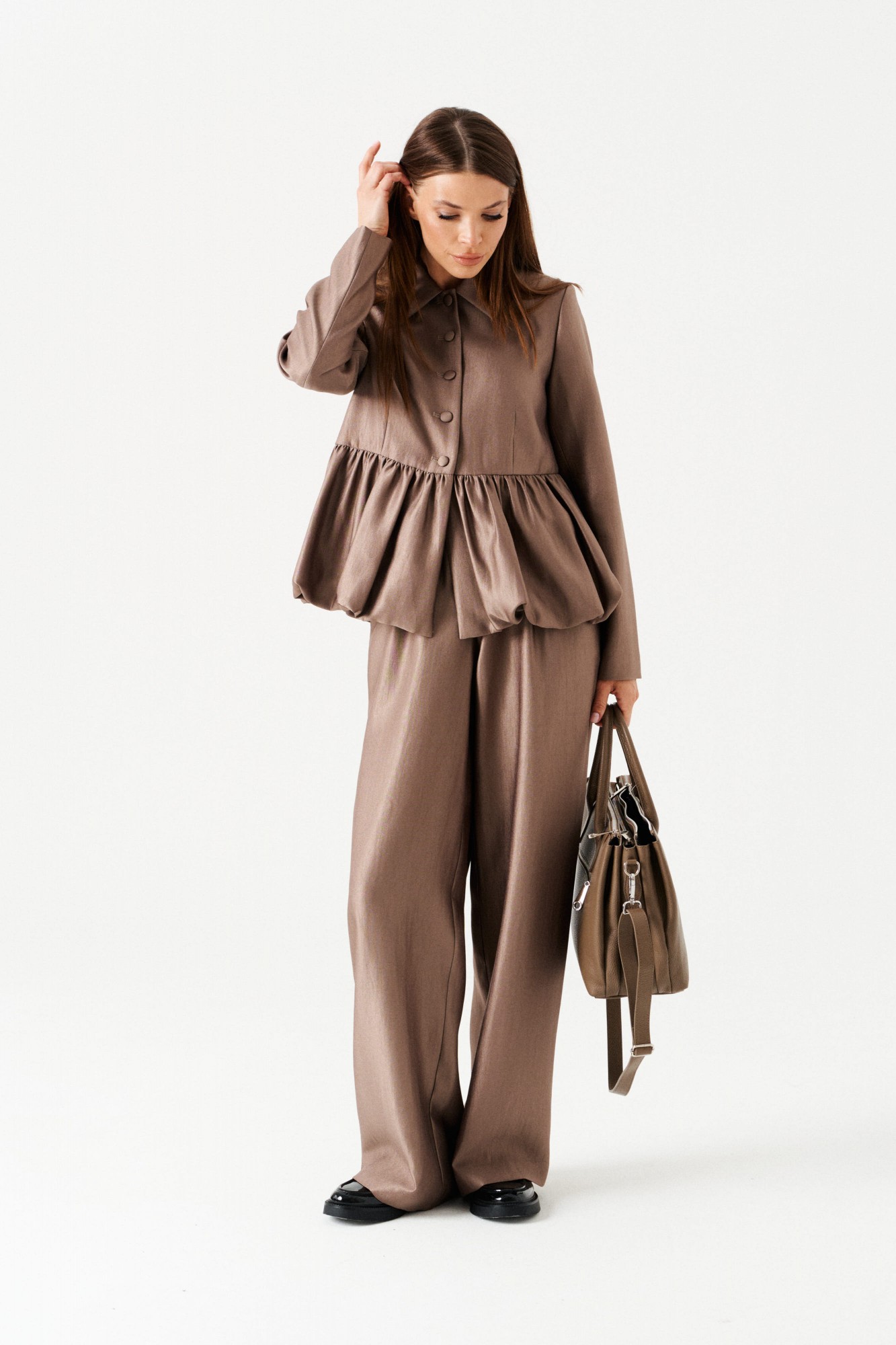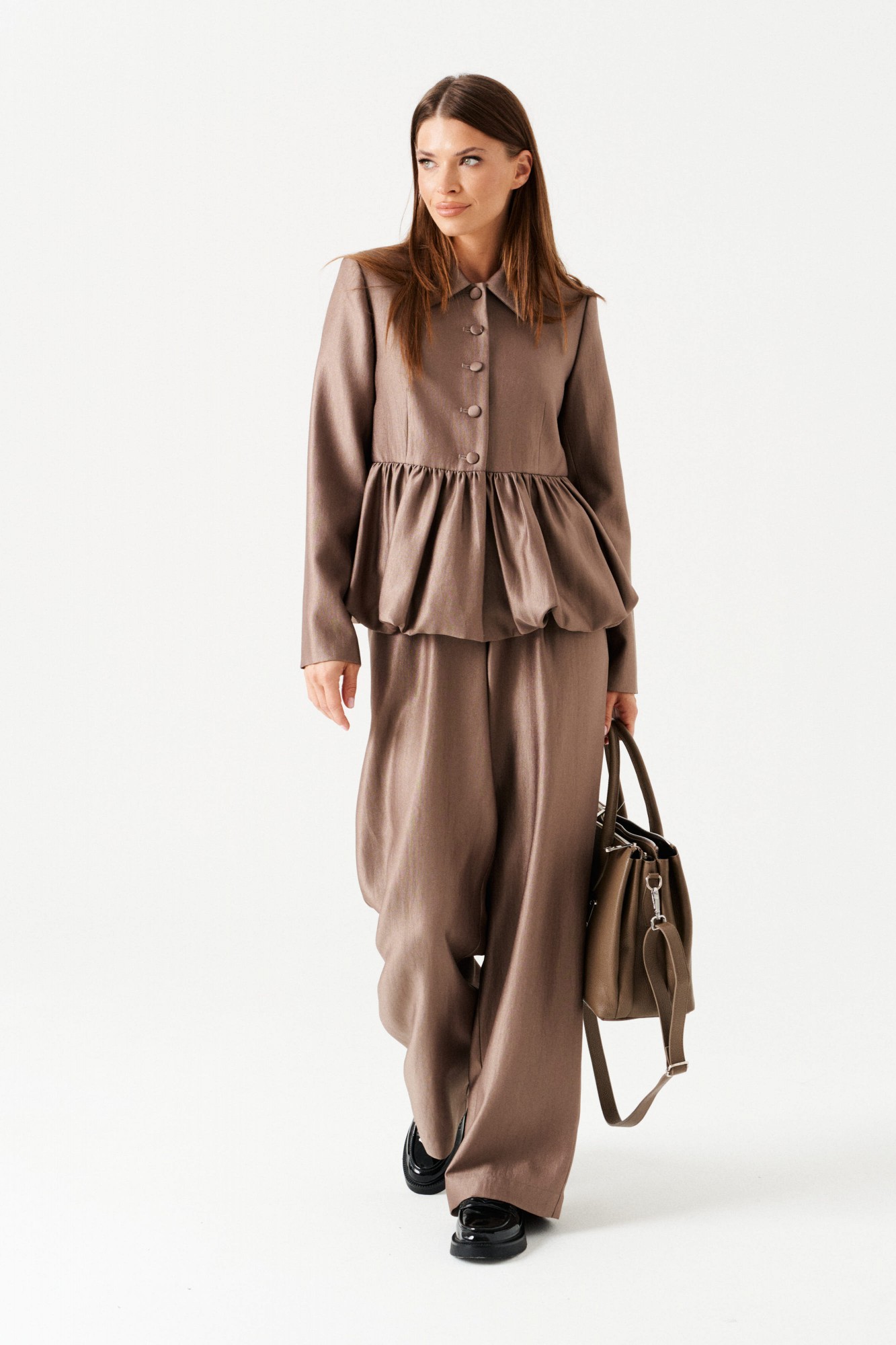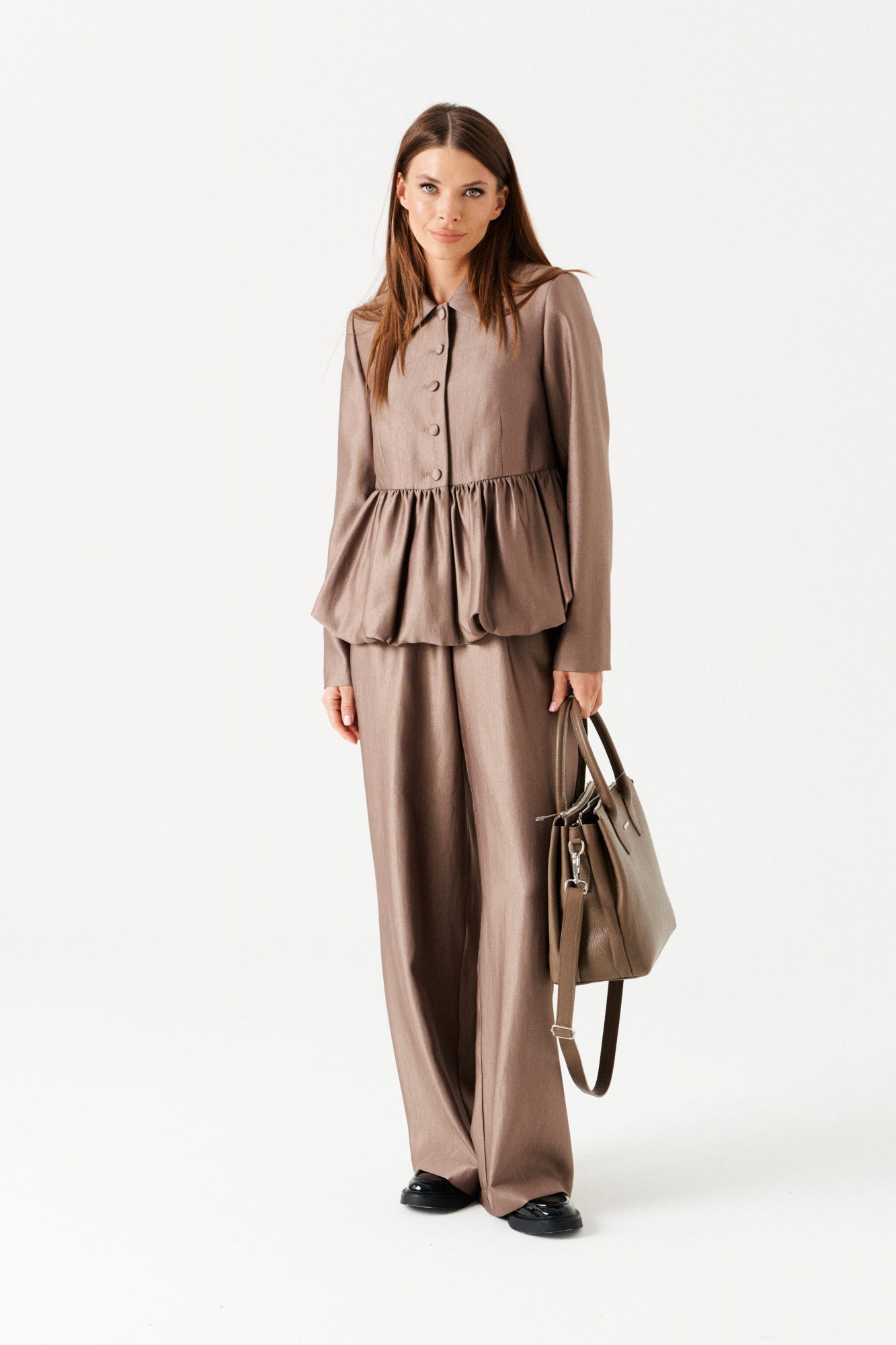 Комплект женский 2-х предметный, состоящий из жакета и брюк. Жакет-баллон полуприлегающего силуэта, однобортный, на подкладке, с центральной застежкой на петли и пуговицы, отложным воротником. Линия талии оформлена эффектной баской-баллоном. По переду таллиевые вытачки. Спинка со средним швом. Рукав втачной, двухшовный. Брюки широкие, на притачном поясе с резинкой. По поясу проложены отделочные строчки. На передних половинках боковые карманы с отрезным бочком и имитация застежки с гульфиком.