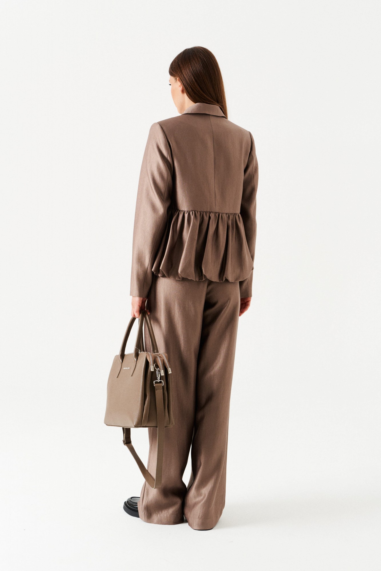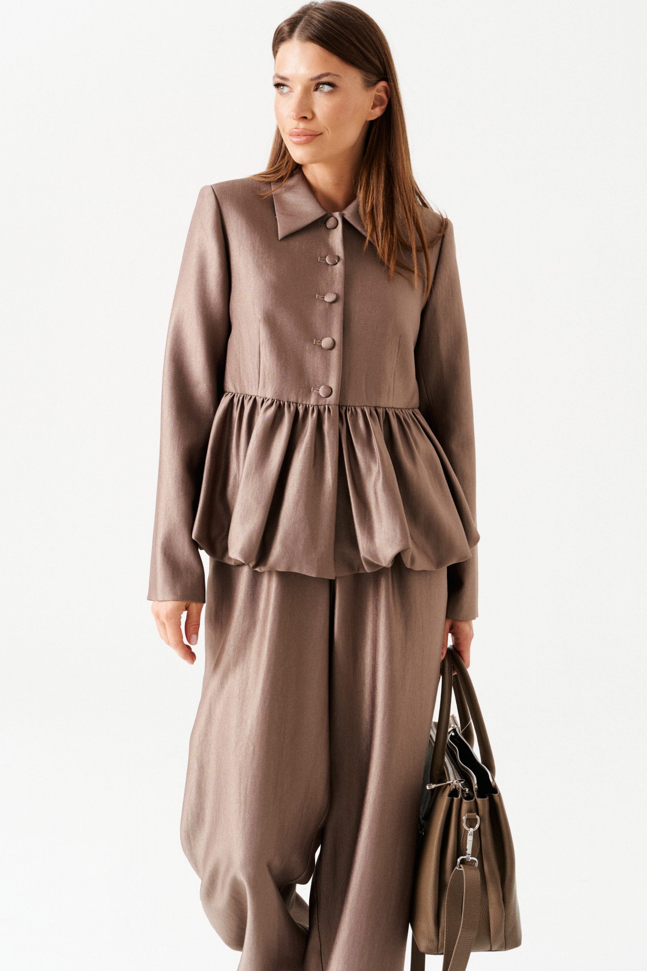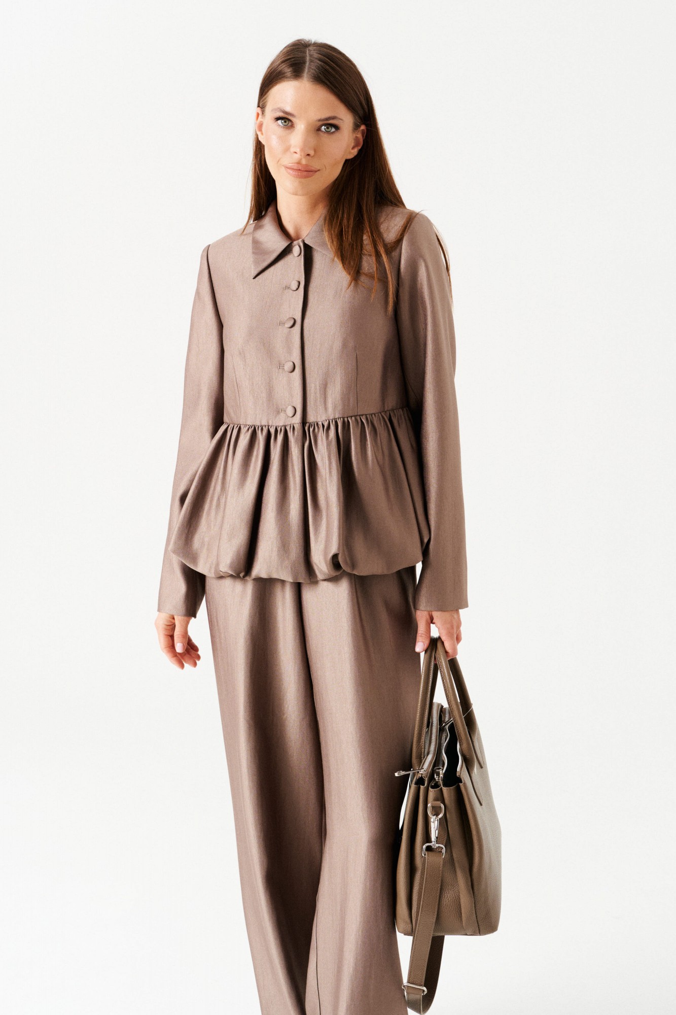 Комплект женский 2-х предметный, состоящий из жакета и брюк. Жакет-баллон полуприлегающего силуэта, однобортный, на подкладке, с центральной застежкой на петли и пуговицы, отложным воротником. Линия талии оформлена эффектной баской-баллоном. По переду таллиевые вытачки. Спинка со средним швом. Рукав втачной, двухшовный. Брюки широкие, на притачном поясе с резинкой. По поясу проложены отделочные строчки. На передних половинках боковые карманы с отрезным бочком и имитация застежки с гульфиком.