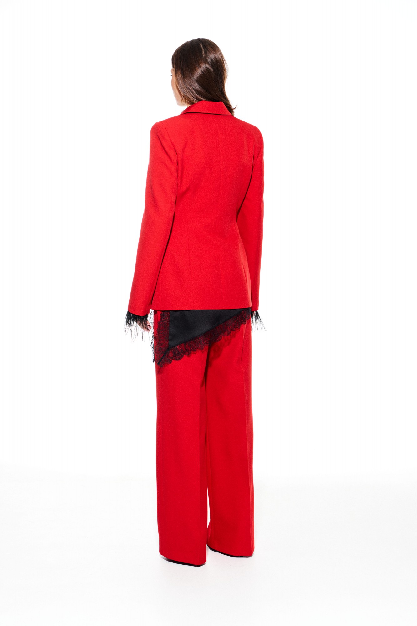 Костюм из костюмно-плательной ткани, 2-х предметный, состоящий из жакета и брюк. Жакет приталенного силуэта, с отложным воротником и лацканами пиджачного типа, с центральной застежкой на 3 навесные петли и 3 пуговицы, на подкладке. Перед отрезной, с рельефами, нагрудными вытачками, имитацией кармана с клапаном. Спинка со средним швом и рельефами. Рукав втачной, двухшовный, длинный. Низ рукава со съемной тесьмой из перьев. Брюки умеренного объема, прямого силуэта. На передних и задних половинках заутюжены стрелки. На передних половинках выполнены односторонние складки и боковые карманы с отрезным бочком. Задние половинки с таллиевыми вытачками. Застежка – гульфик на молнии. Пояс притачной, с резинкой по спинке, застежкой на крючок и потайную пуговицу.